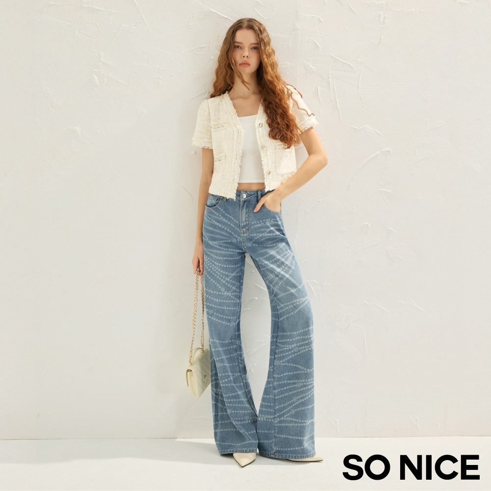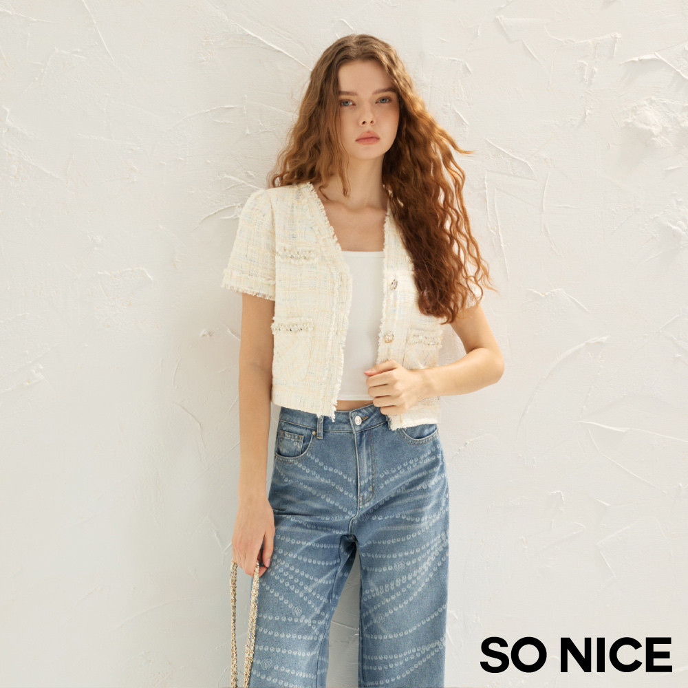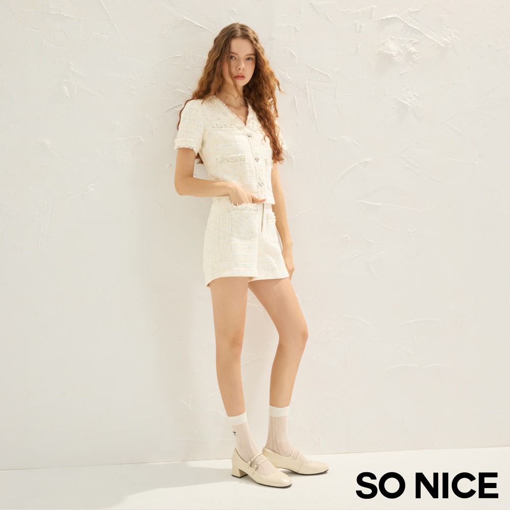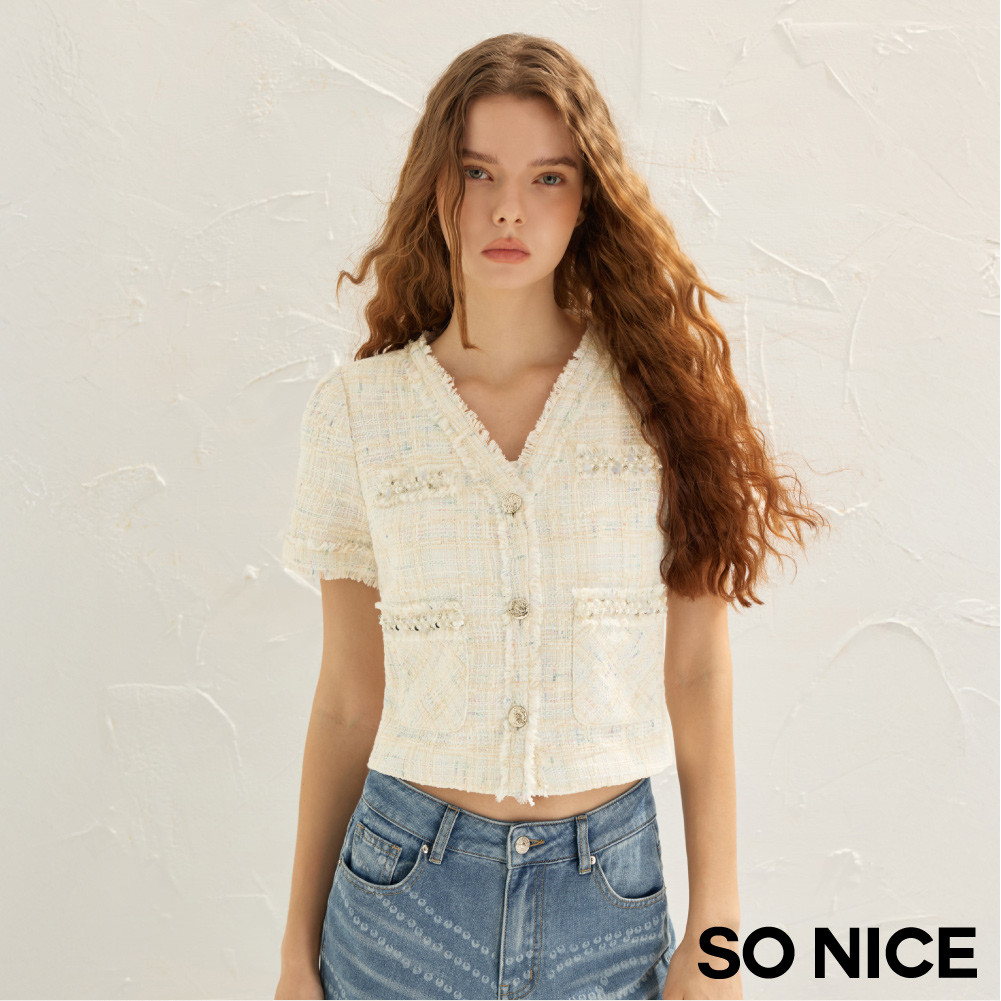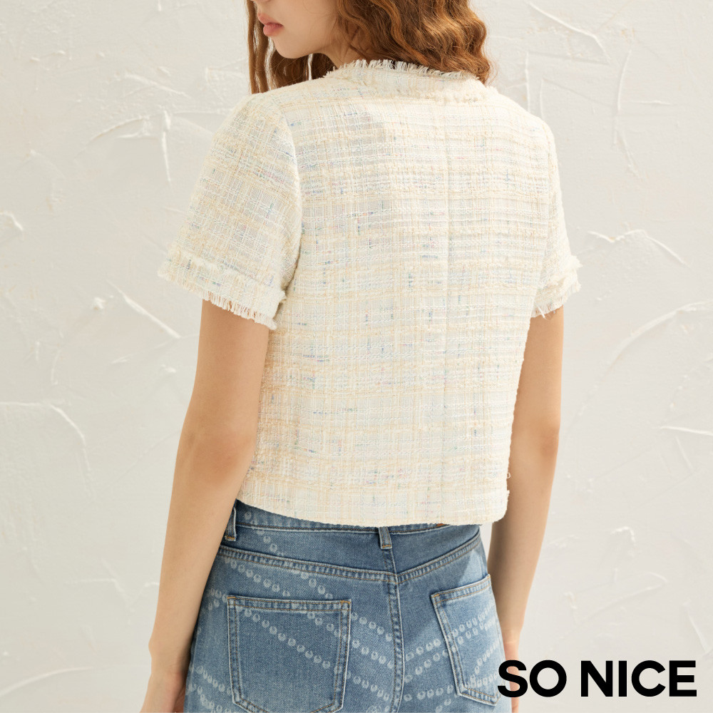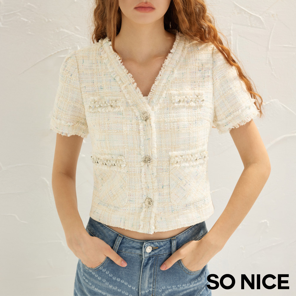 SO NICE 小香風V領珍珠短版撞色花呢外套|都會時尚女裝【75535021】白,42(XL)|白,34(XS)|白,36(S)|白,38(M)|白,40(L)BlazersSO NICE 官方旗艦店