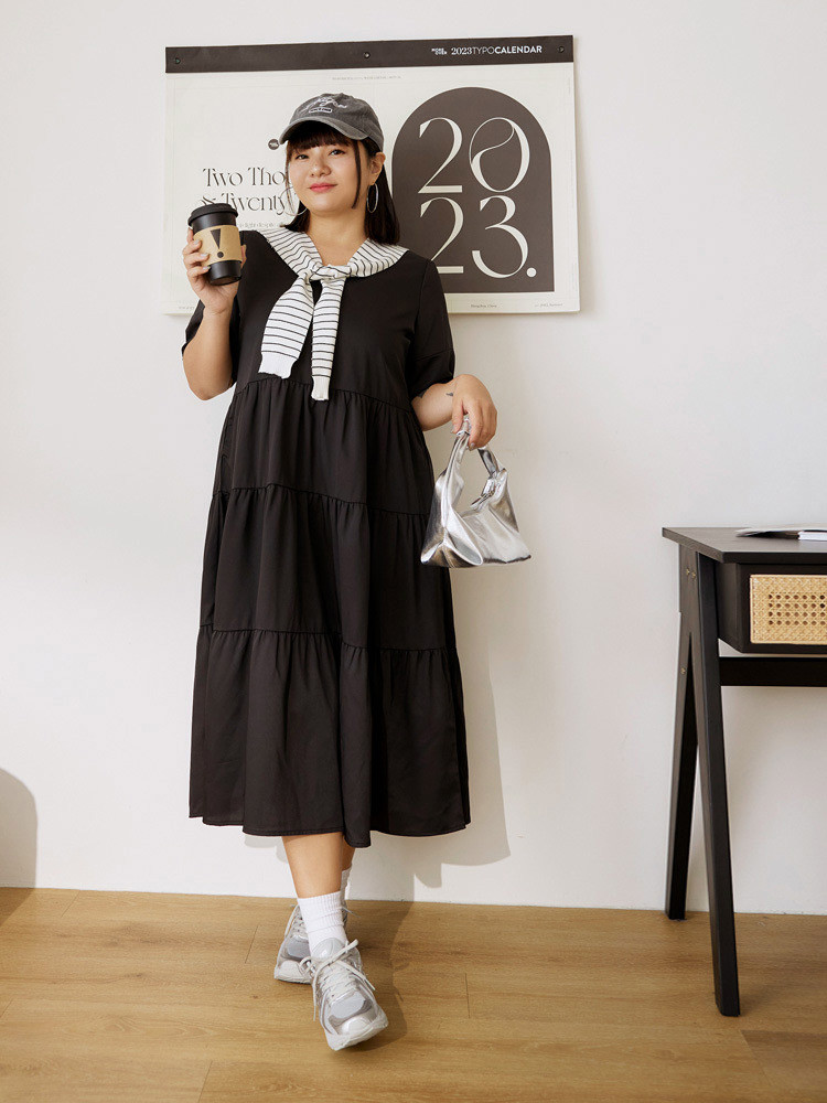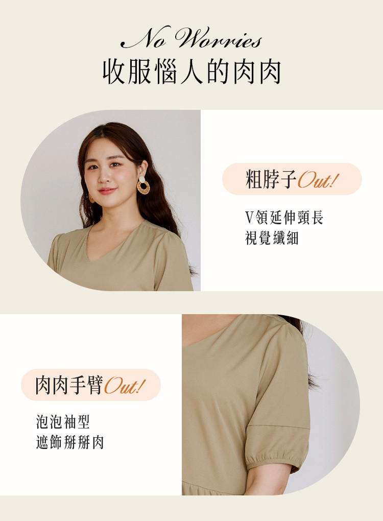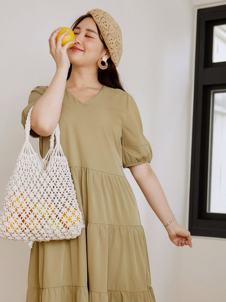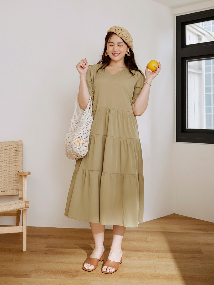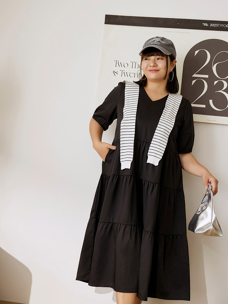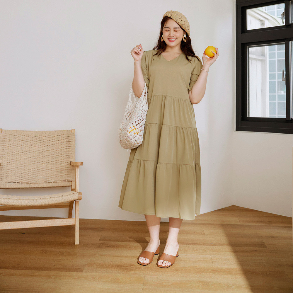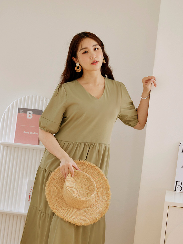 OB嚴選 雲朵自訂款-V領泡泡袖蛋糕長洋裝 《DA10126》大尺碼/女裝/現貨黑,XL|黑,2L|黑,3L|芥末綠,XL|芥末綠,2L|芥末綠,3LOB嚴選官方旗艦店