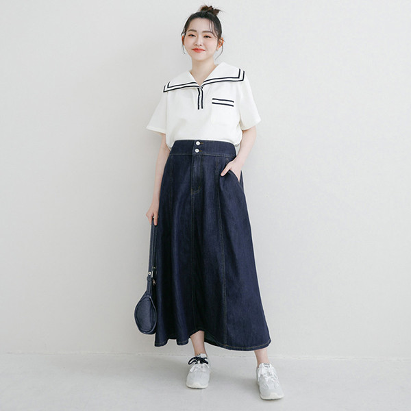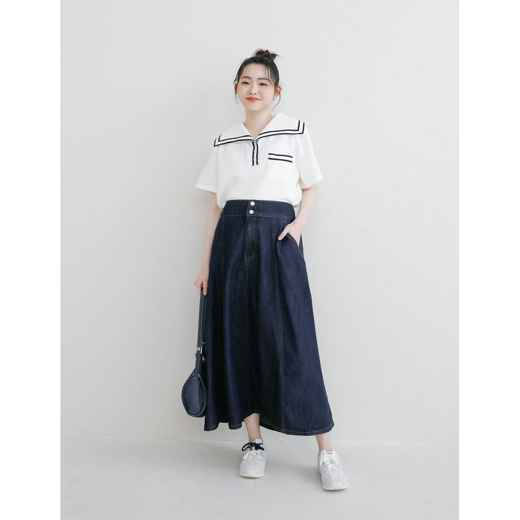【PolyLulu】 萊賽爾牛仔後鬆緊傘襬長裙 中大尺碼裙子 深藍色