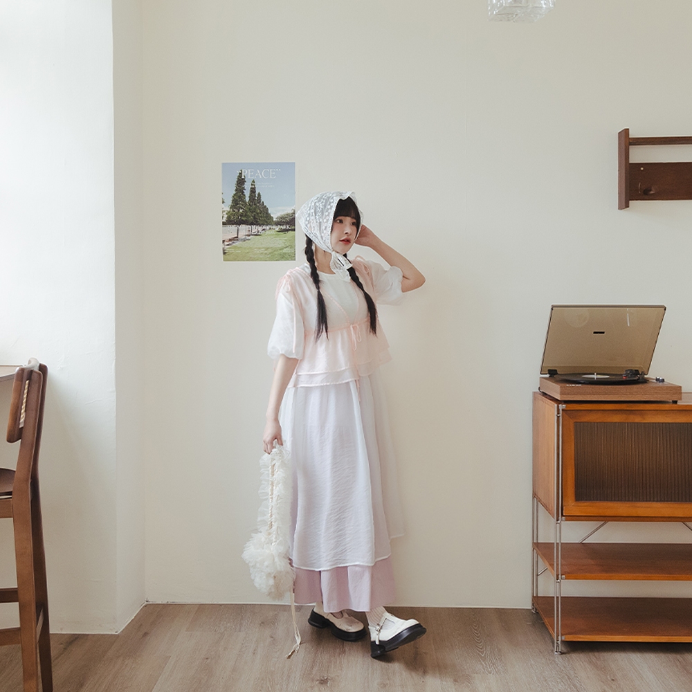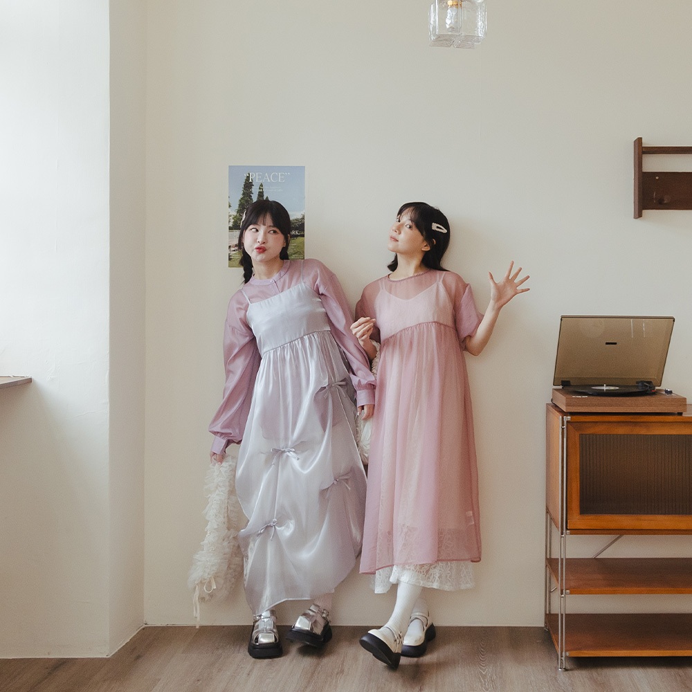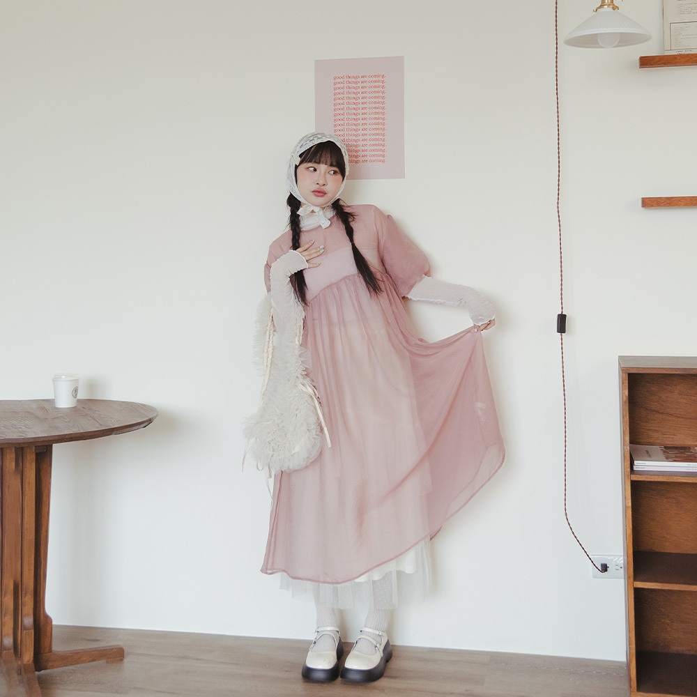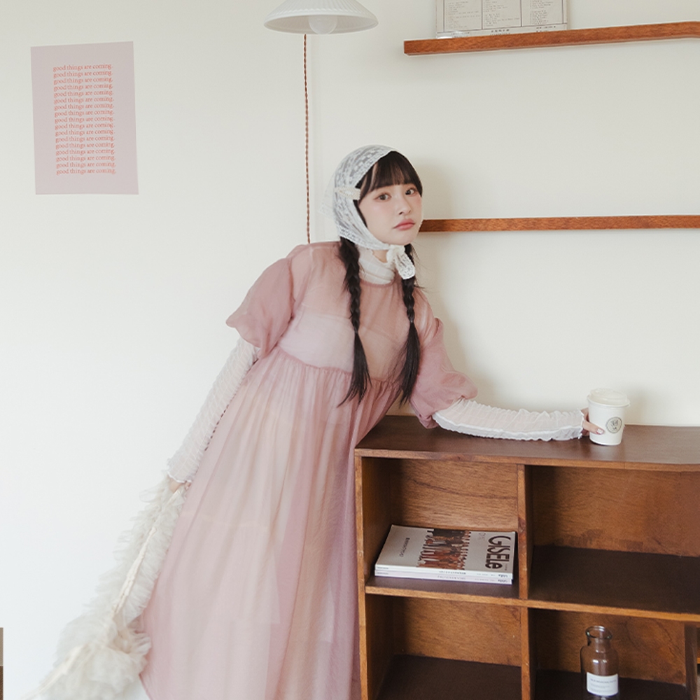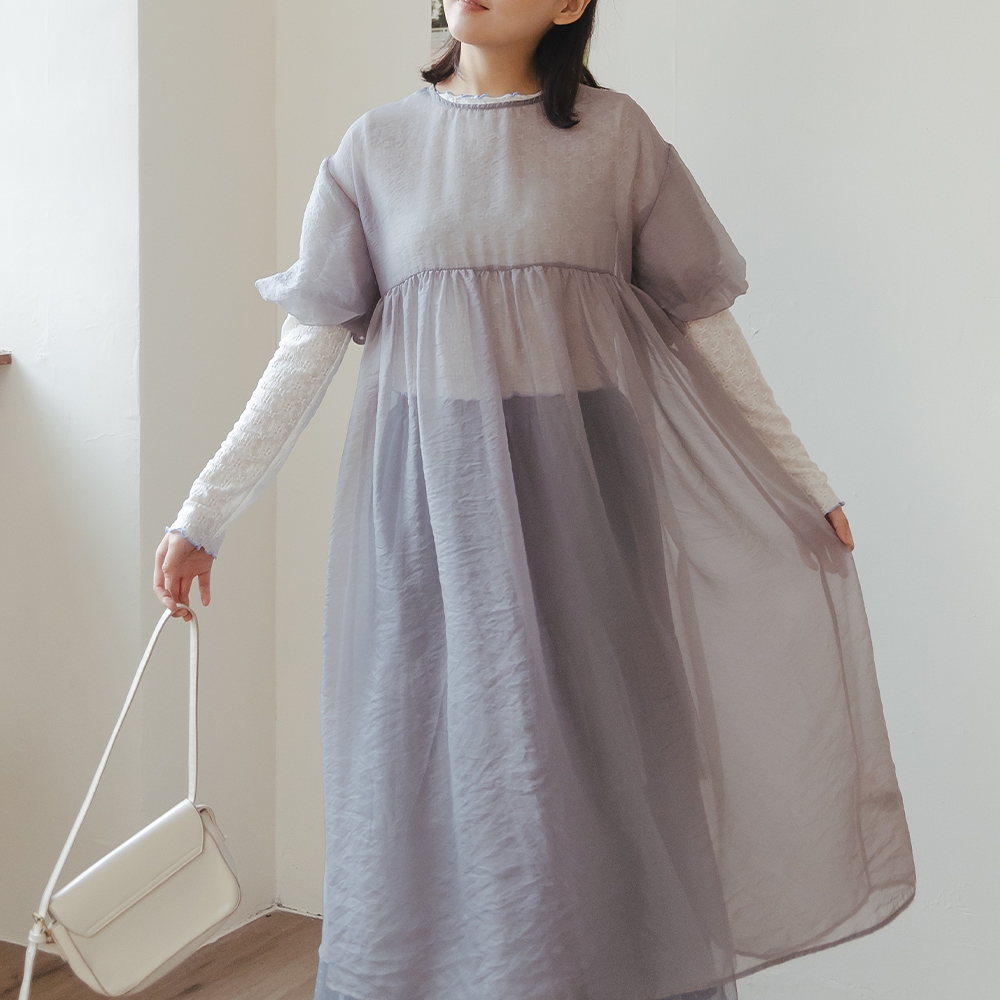 QUEENSHOP_ S 女裝 透膚腰細褶澎袖長外罩洋裝 三色售 現+預 【01098866】粉|米白|淺灰QUEENSHOP