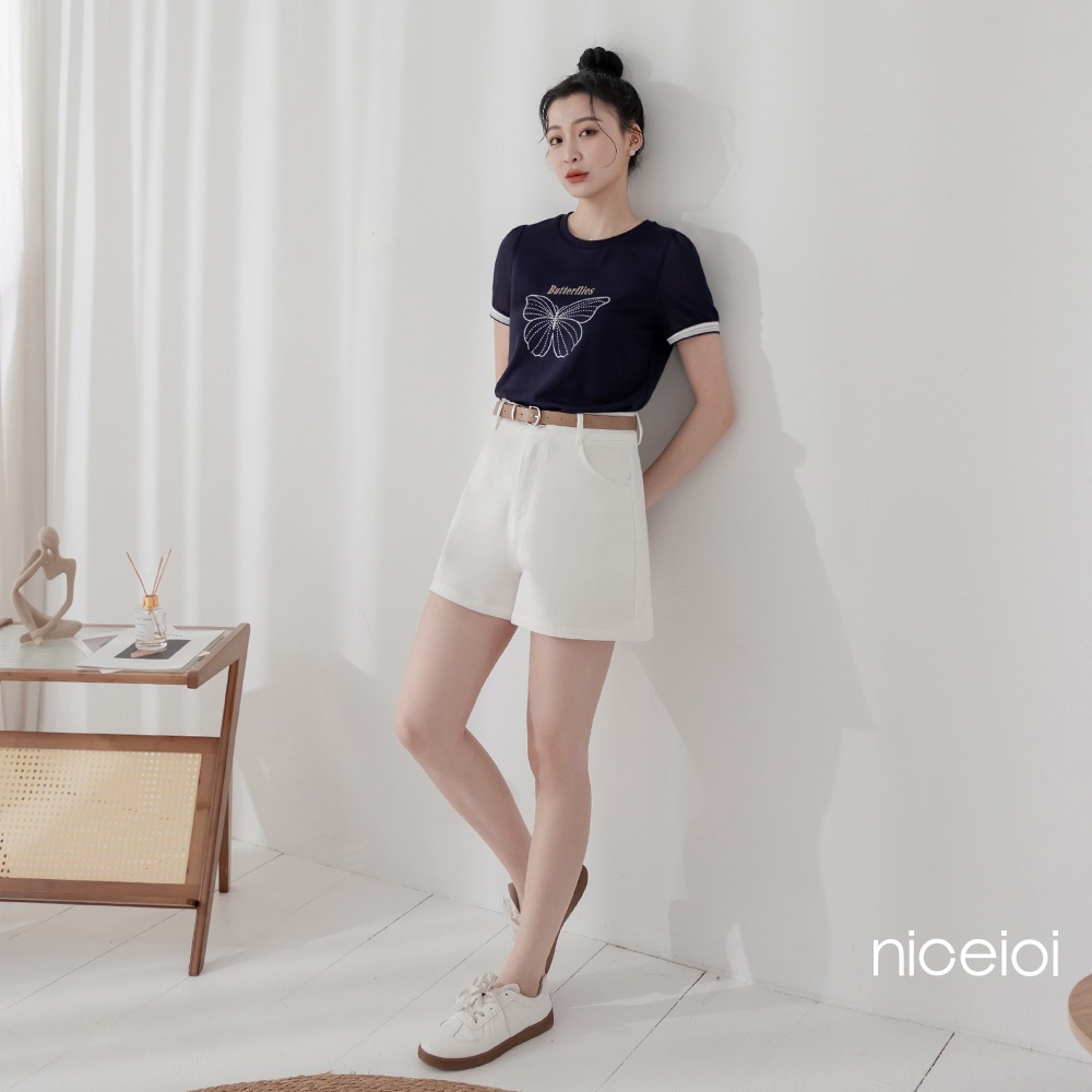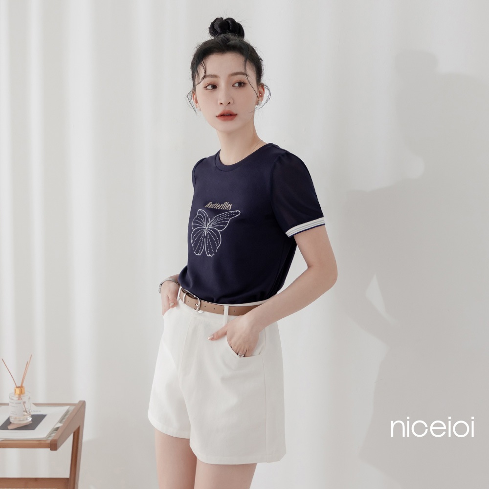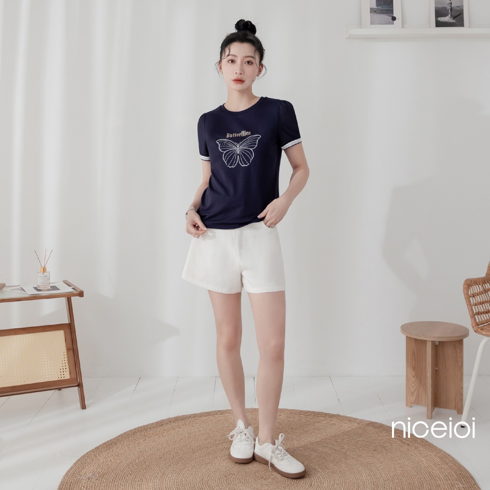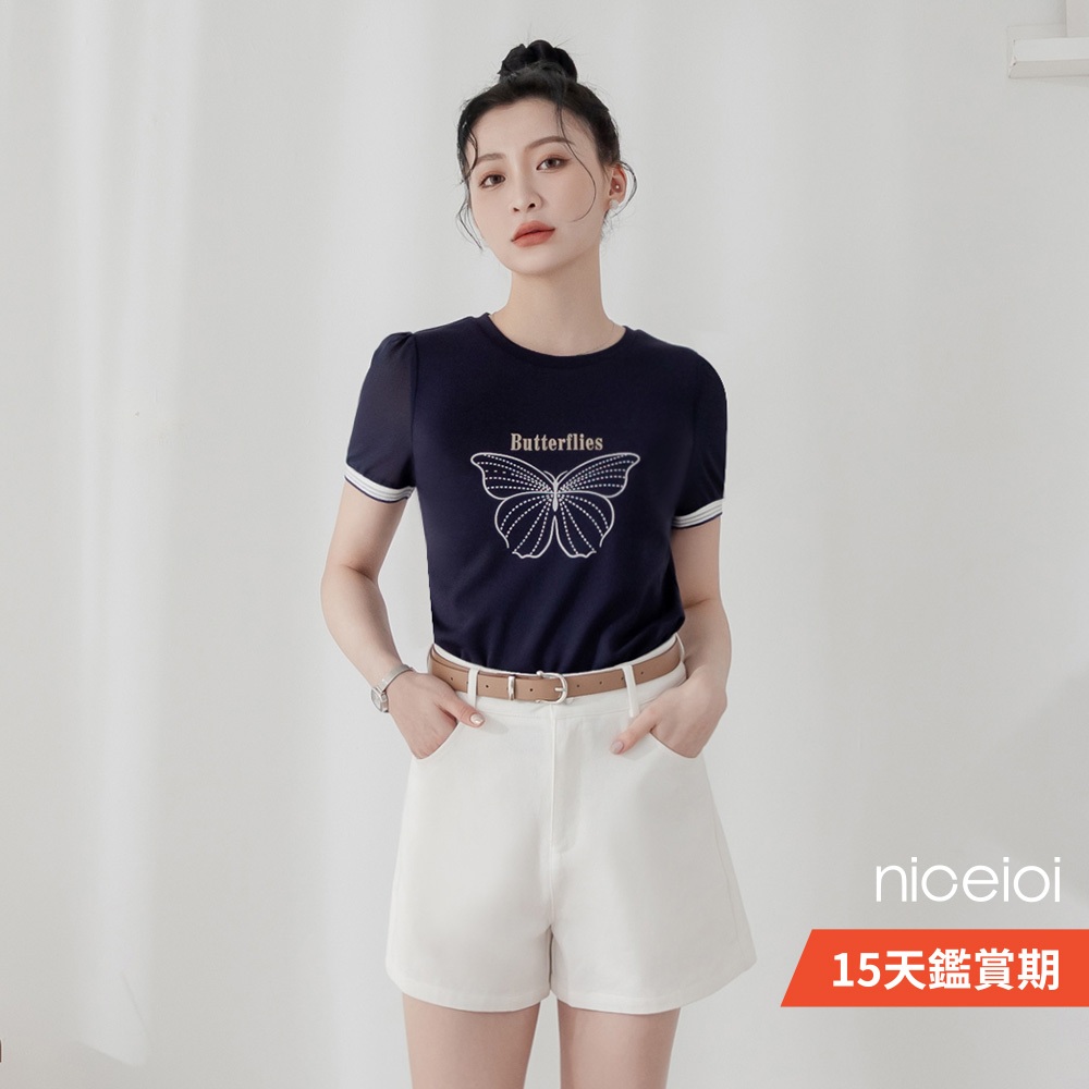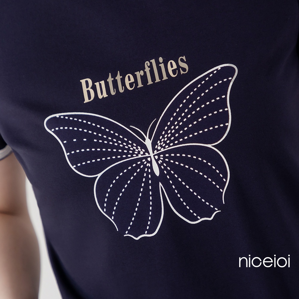 niceioi 圓領上衣 短袖 圖T 深藍色 [午夜蝴蝶撞色滾邊印花上衣] 雪紡上衣 女裝圓領上衣-深藍,L|圓領上衣-深藍,XL|圓領上衣-深藍,S|圓領上衣-深藍,MT-shirtsniceioi 官方旗艦店