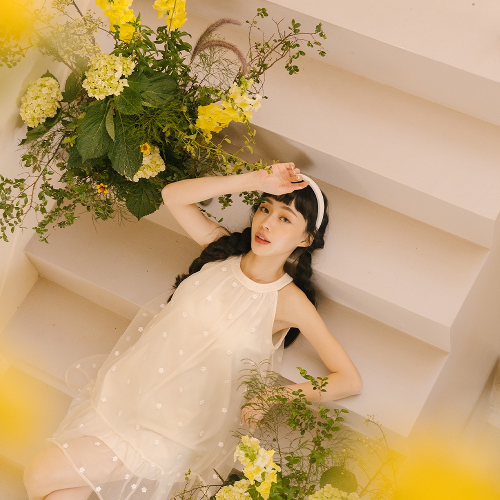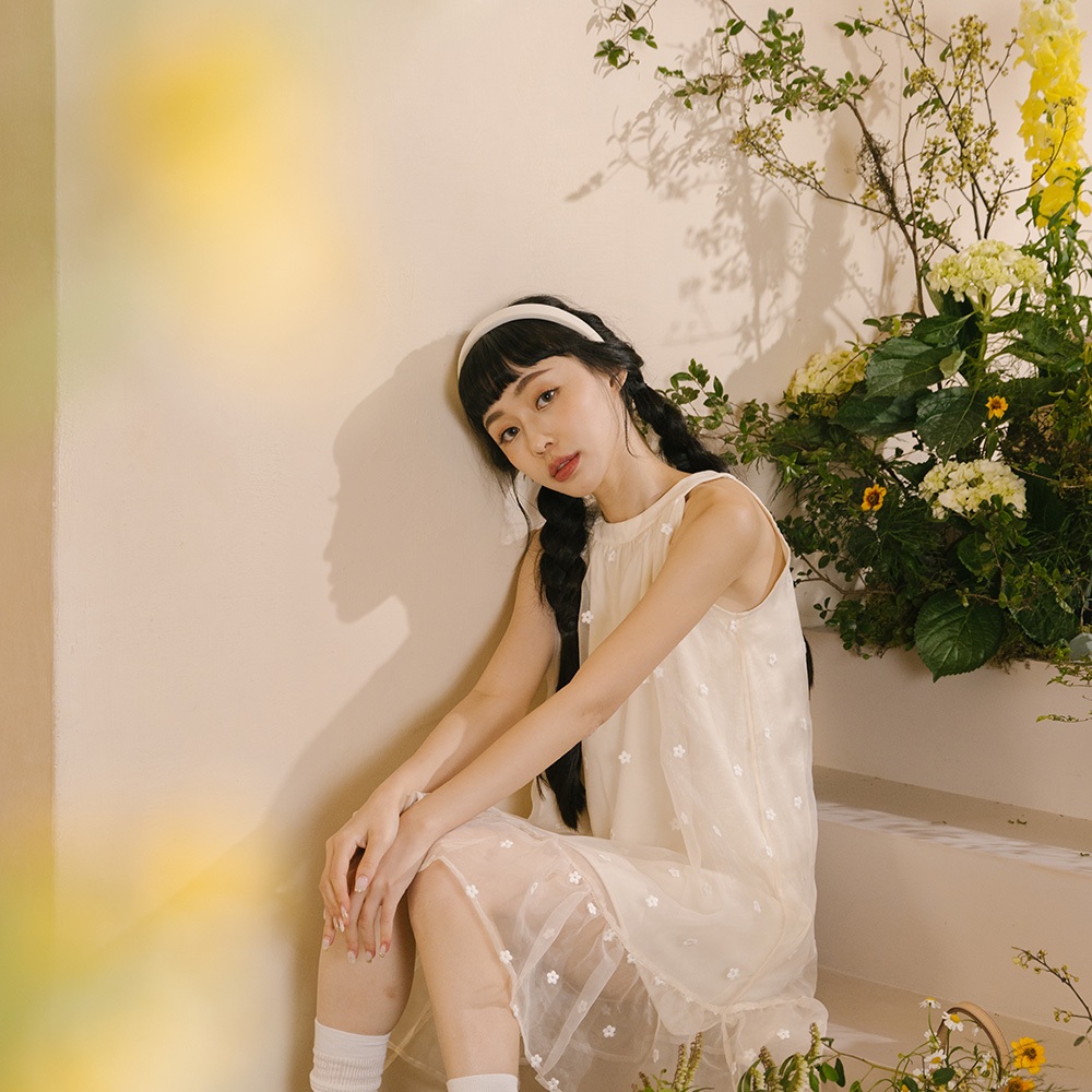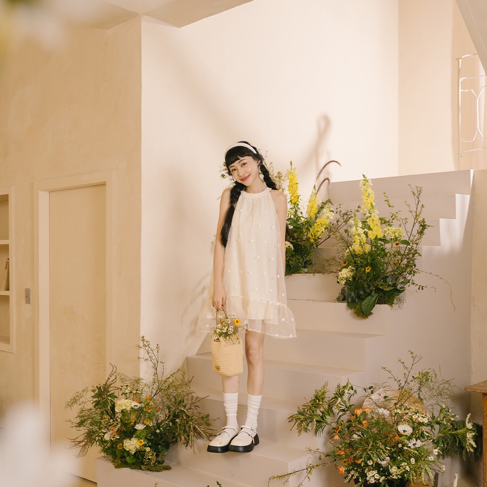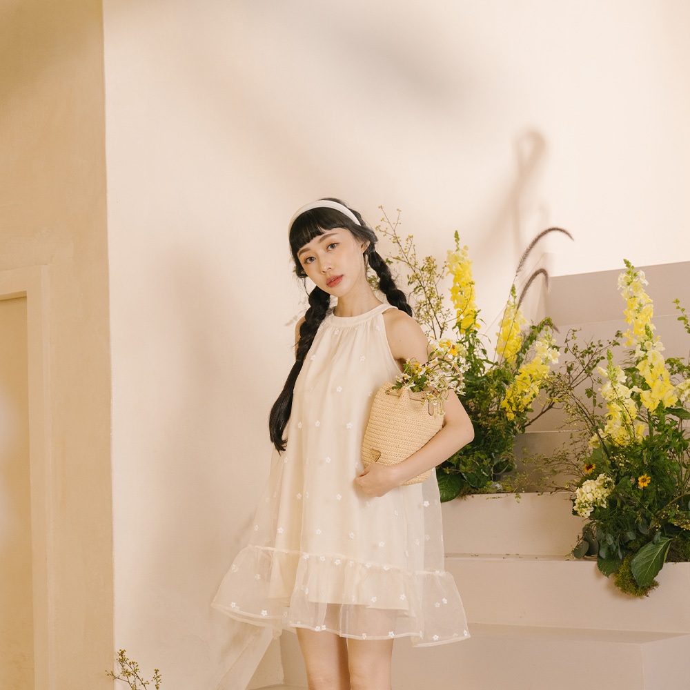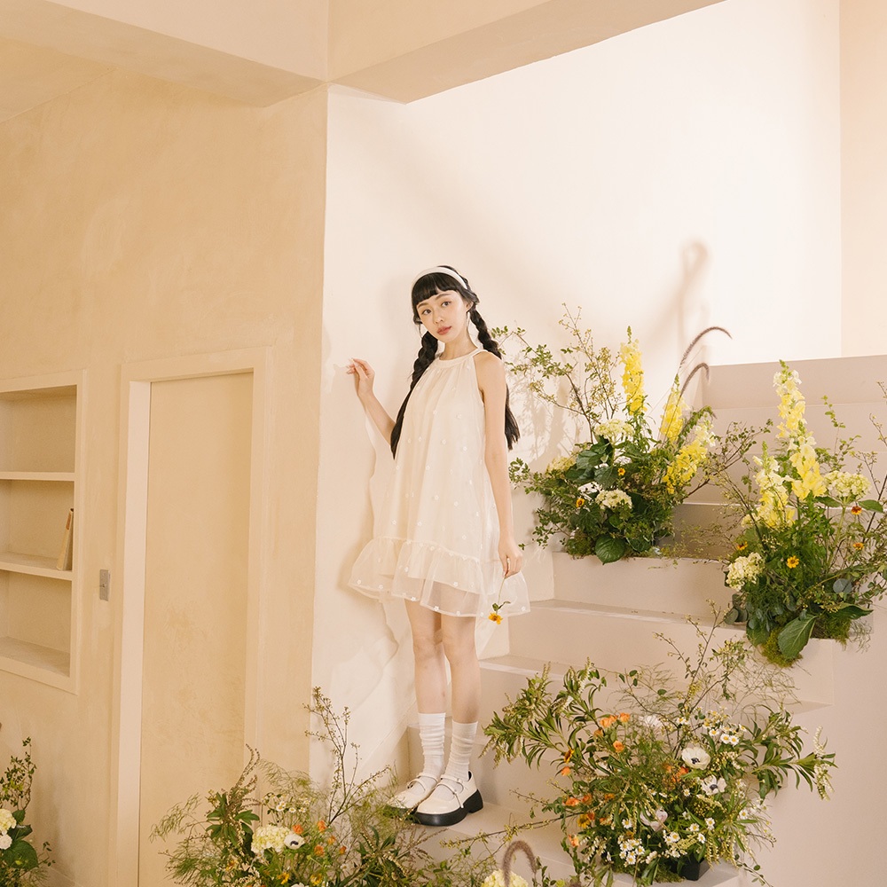 QUEENSHOP_ S 女裝 柏心聯名 刺繡小花削肩透紗短洋裝-杏 S/M 現+預 【01086998】杏S|杏MQUEENSHOP