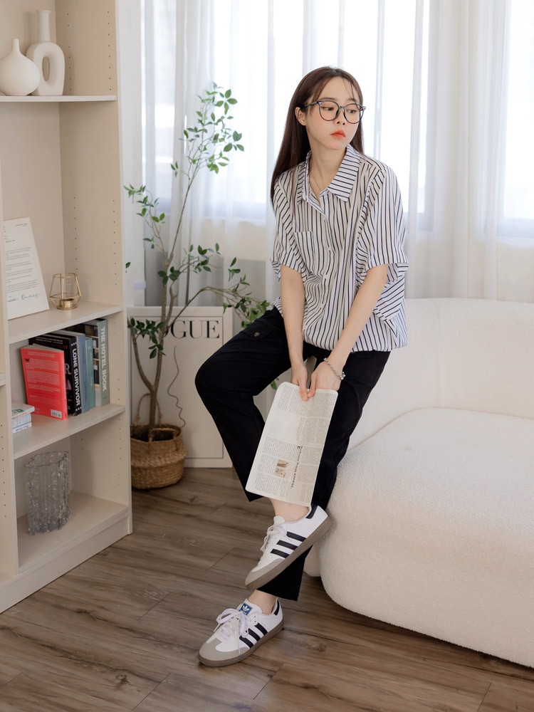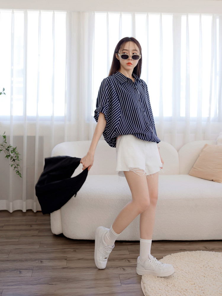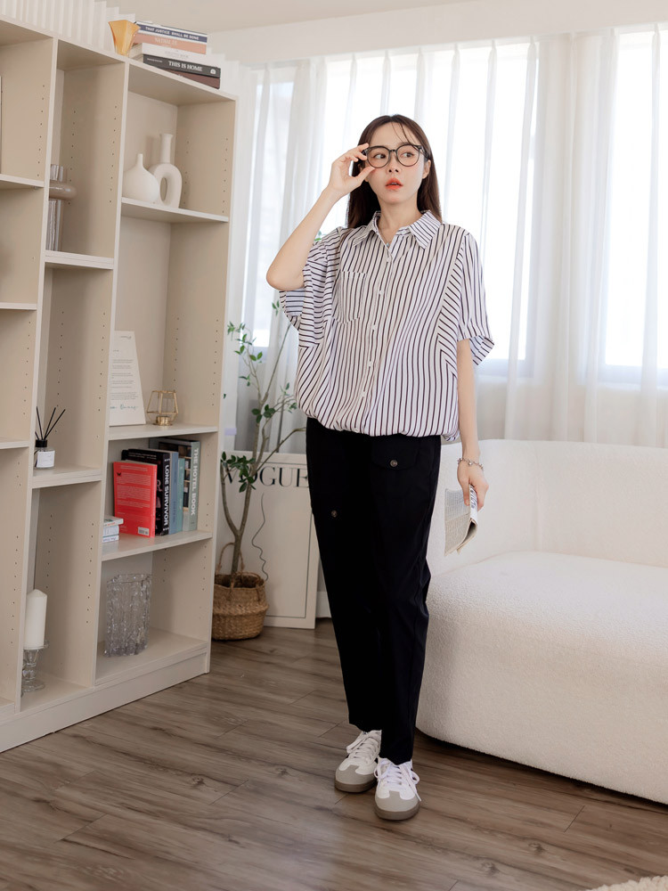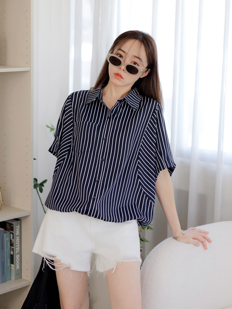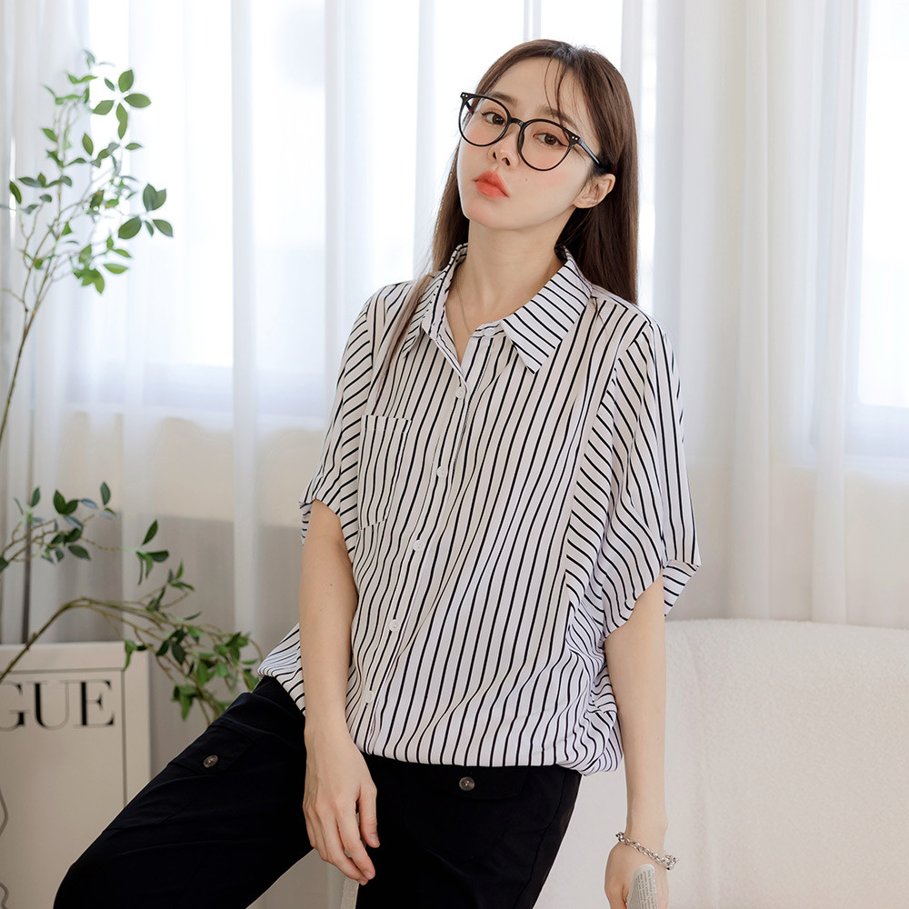 OB嚴選 直條紋縮口下襬蝙蝠袖襯衫上衣 《AB20360》白,F|白,XL|白,2L|白,3L|深藍,F|深藍,XL|深藍,2L|深藍,3LT-shirtsOB嚴選官方旗艦店