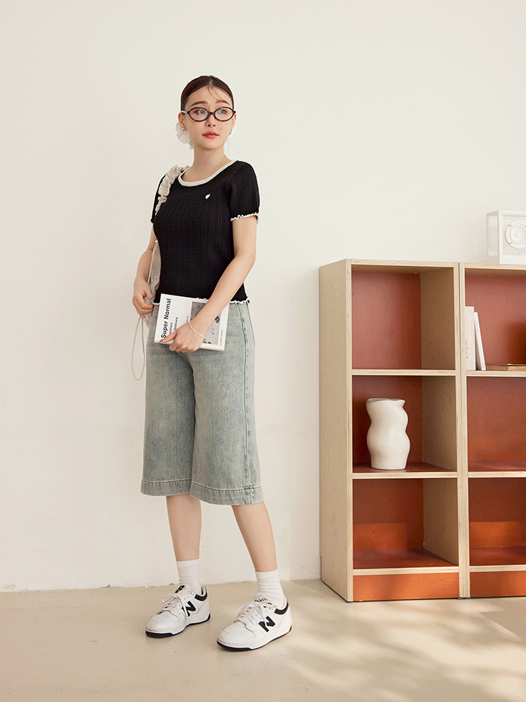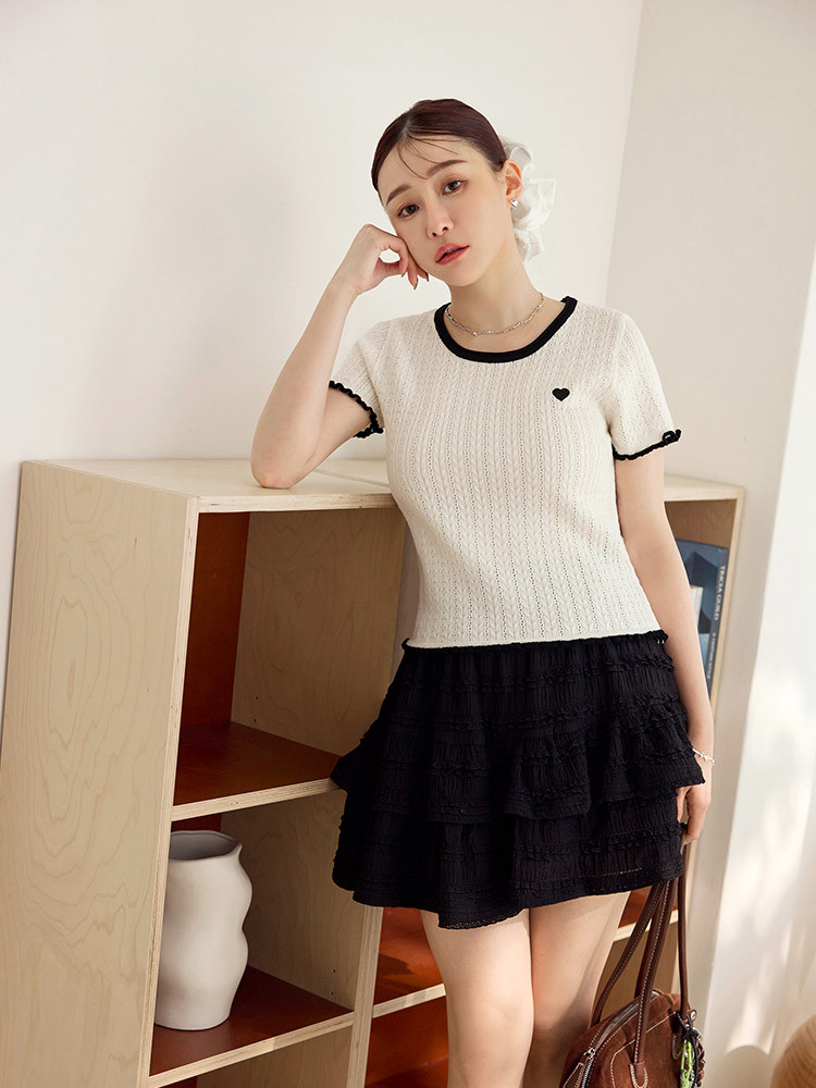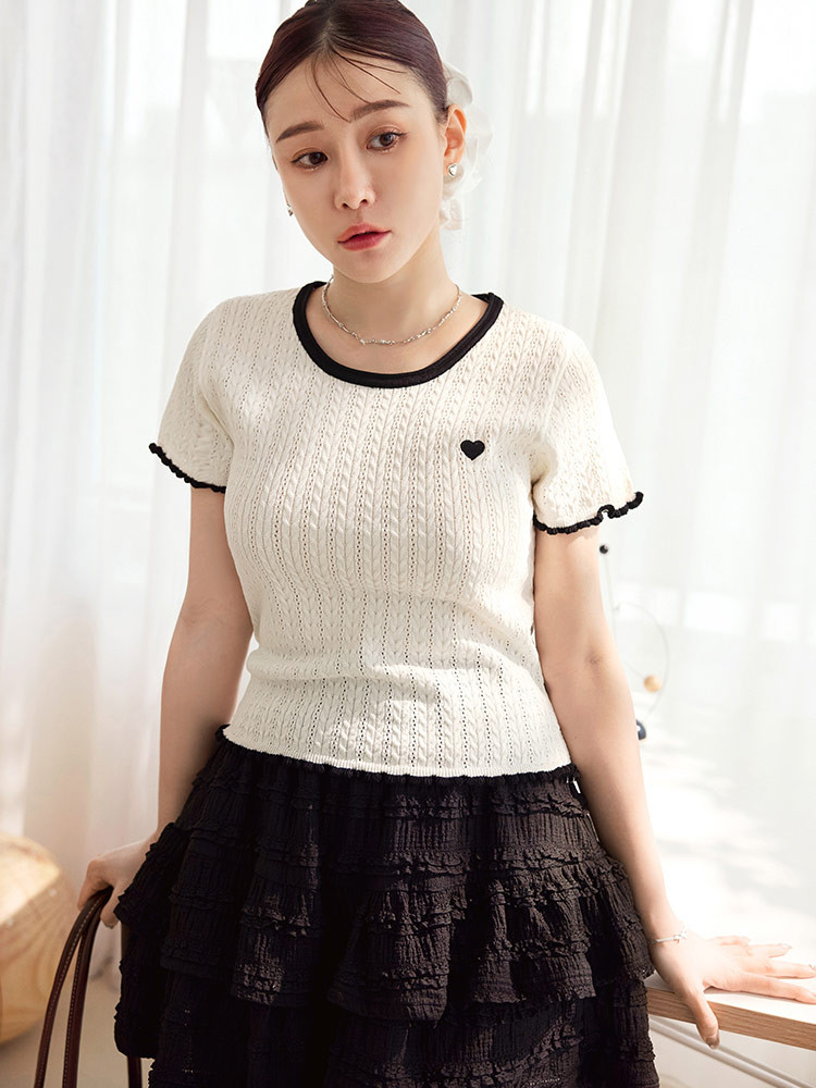OB嚴選 撞色滾邊愛心刺繡針織短袖上衣 《FA3159》白,F|白,XL|白,3L|黑,F|黑,XL|黑,3LOB嚴選官方旗艦店