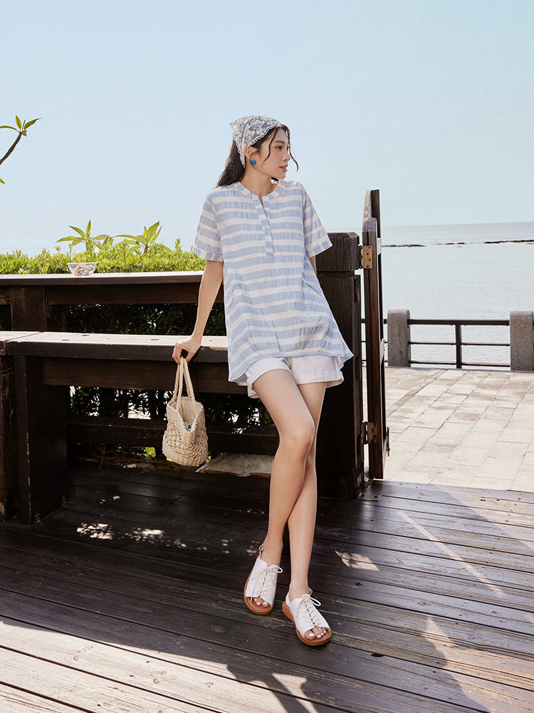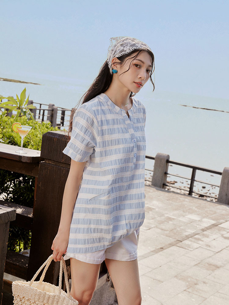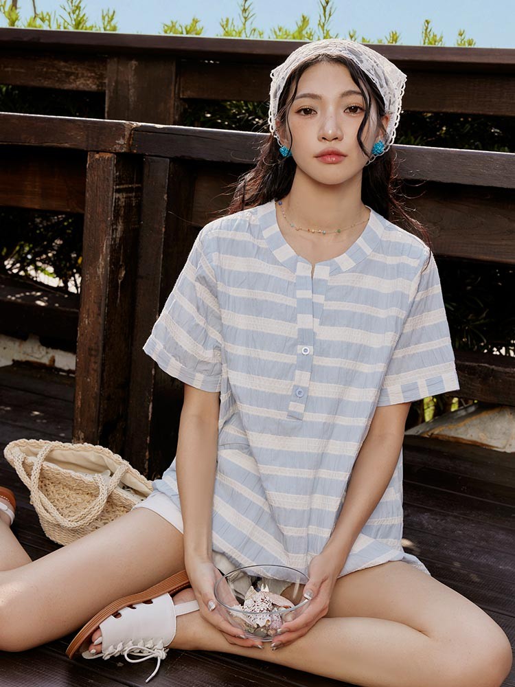 OB嚴選 日系純棉假兩件亨利領寬鬆條紋拼接上衣 《AB20277》卡其杏,F|卡其杏,XL|卡其杏,2L|卡其杏,3L|淺水藍,F|淺水藍,XL|淺水藍,2L|淺水藍,3LT-shirtsOB嚴選官方旗艦店