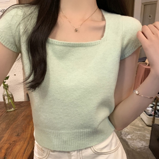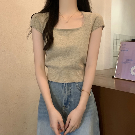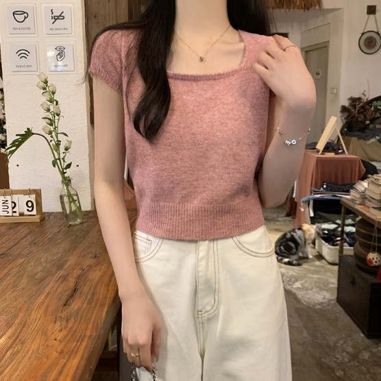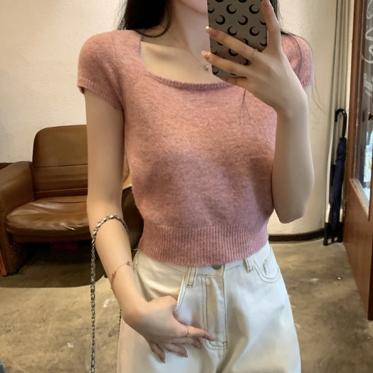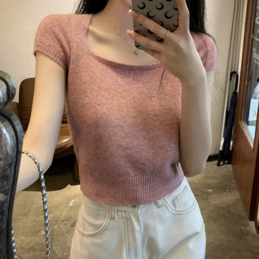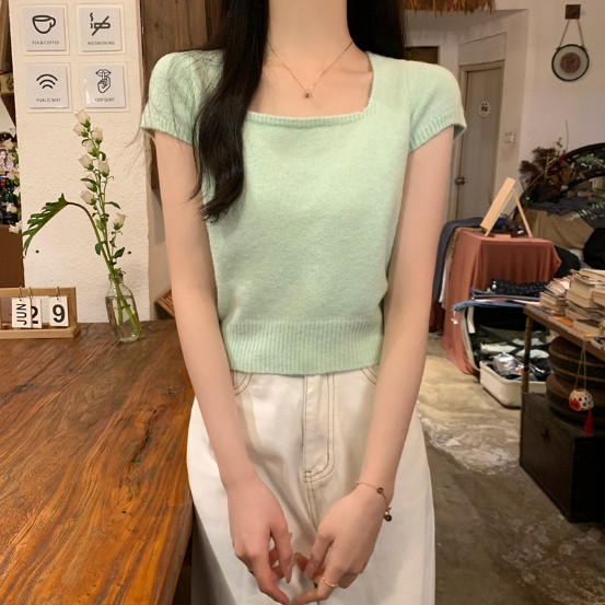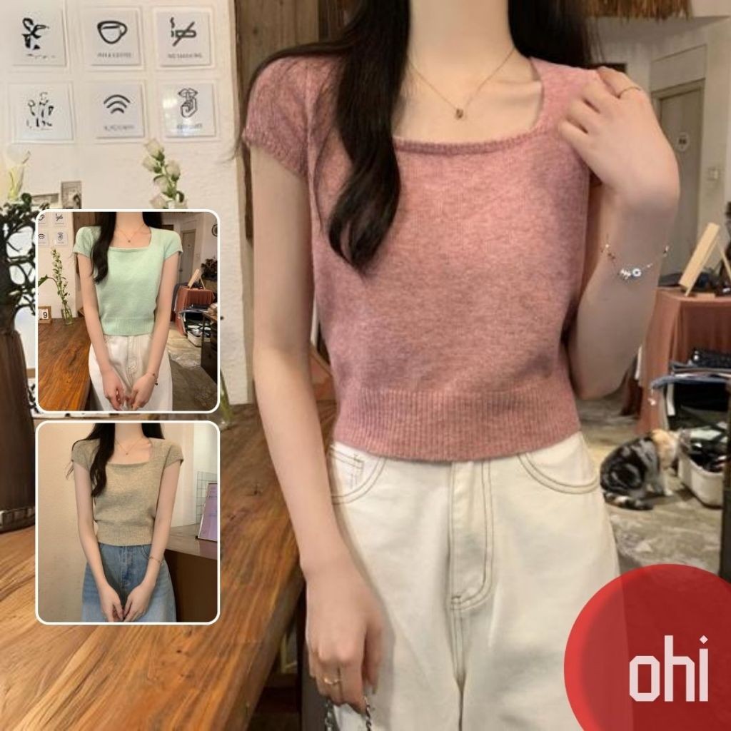 【ohi】法式甜辣短袖上衣 純欲風修身方領針織T恤 顯瘦上衣 韓版上衣 簡約上衣 夏天衣服 女裝 GTD5660卡其色,均碼-F(40-65KG可穿)|粉色,均碼-F(40-65KG可穿)|綠色,均碼-F(40-65KG可穿)T-shirtsOHI衣著