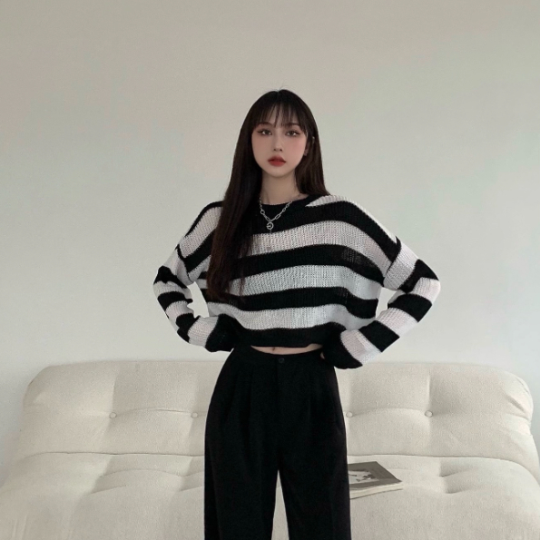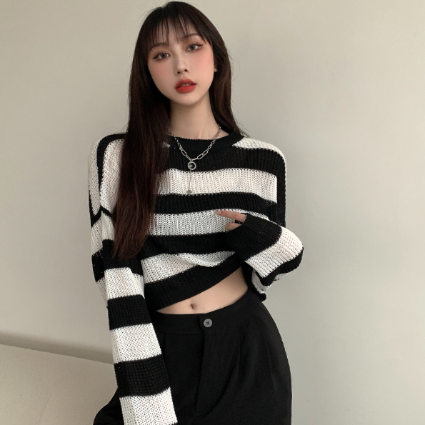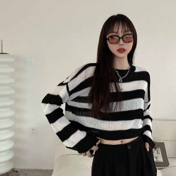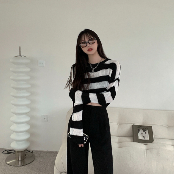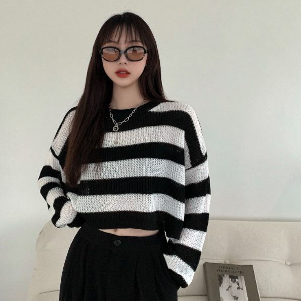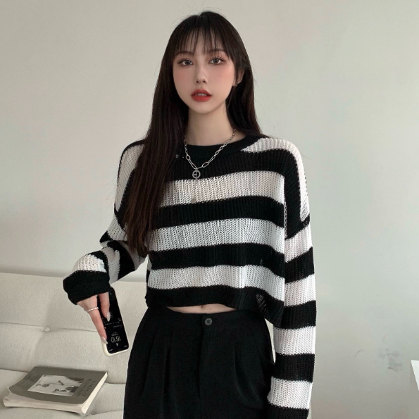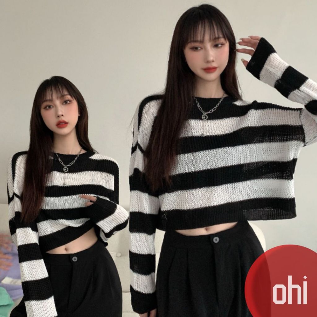 【ohi】條紋針織衫 長袖毛衣 長袖罩衫 洋氣寬鬆短款上衣 休閒百搭 上衣 針織衫 秋款女裝 GWD2585黑白條紋,F-(均碼40-55KG可穿)OHI衣著