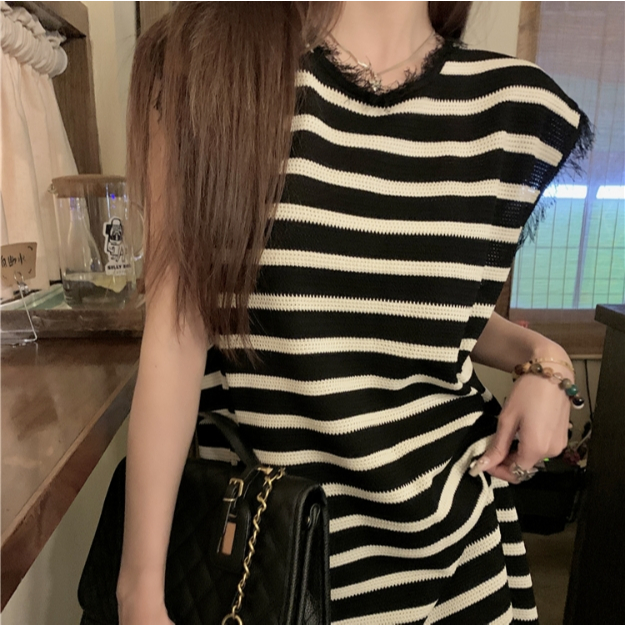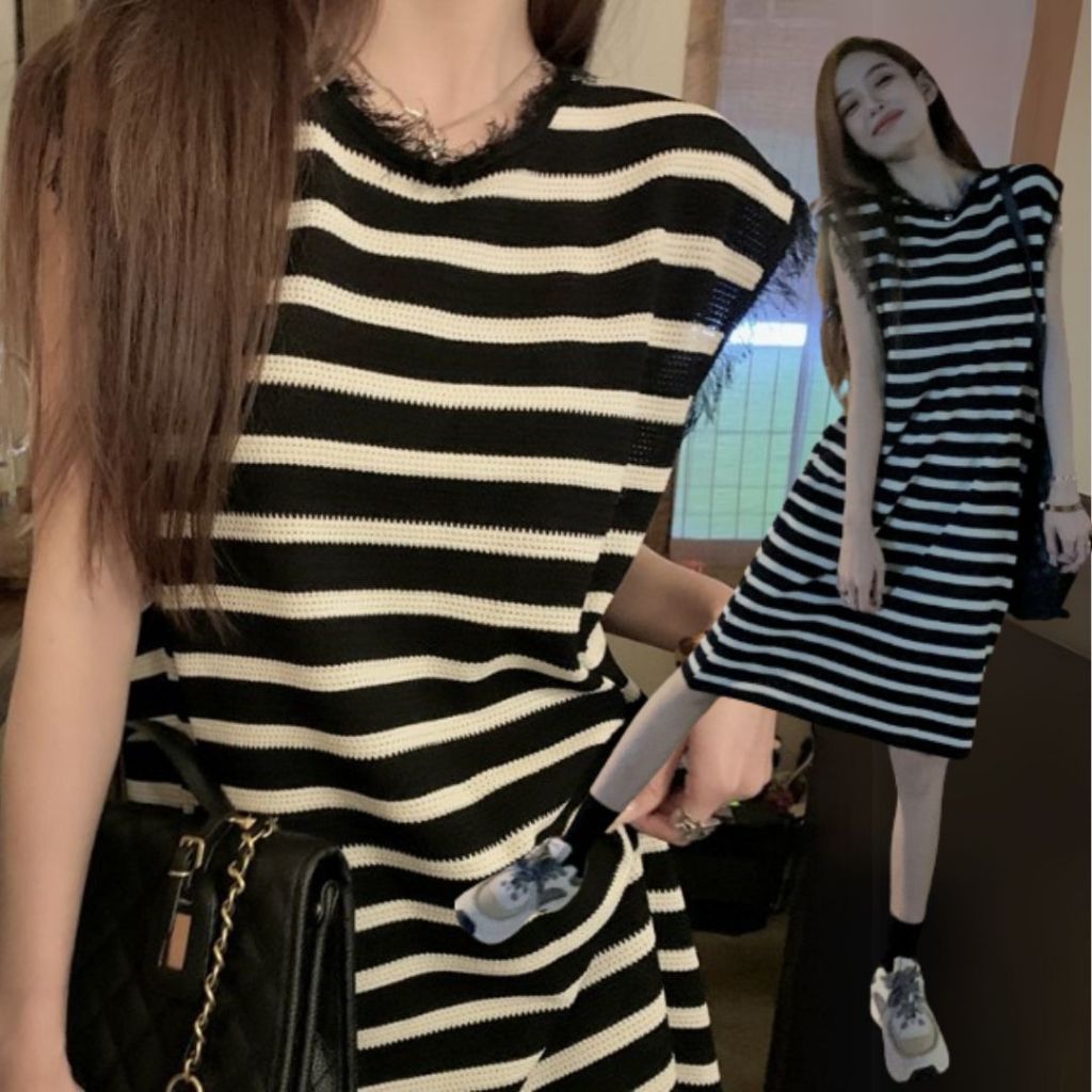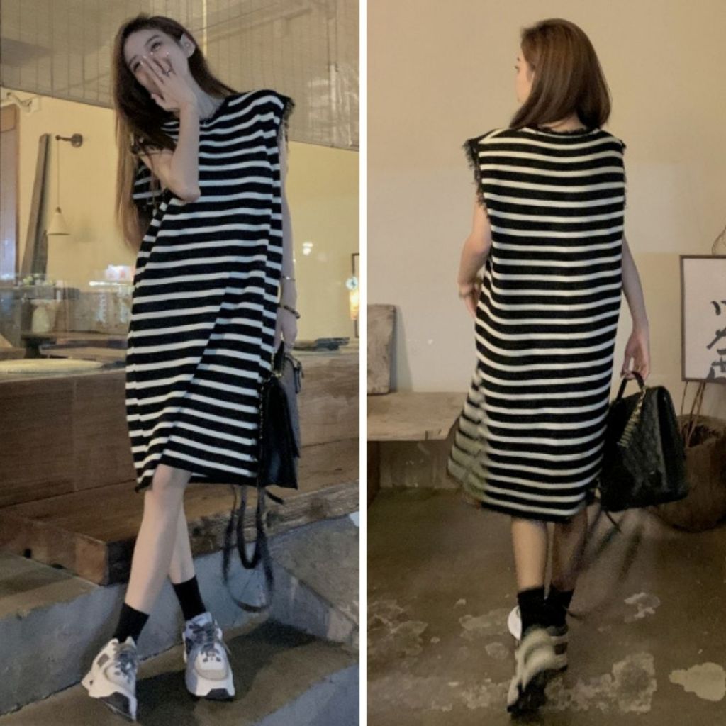 【ohi】韓版寬鬆撞色條紋氣質連身裙 中長款背心裙 顯瘦連身裙 連身裙 長裙 裙子 洋裝 連衣裙 女裝 GKD3711粉條紋,F碼(40-65KG可穿)|黑杏條紋,F碼(40-65KG可穿)OHI衣著