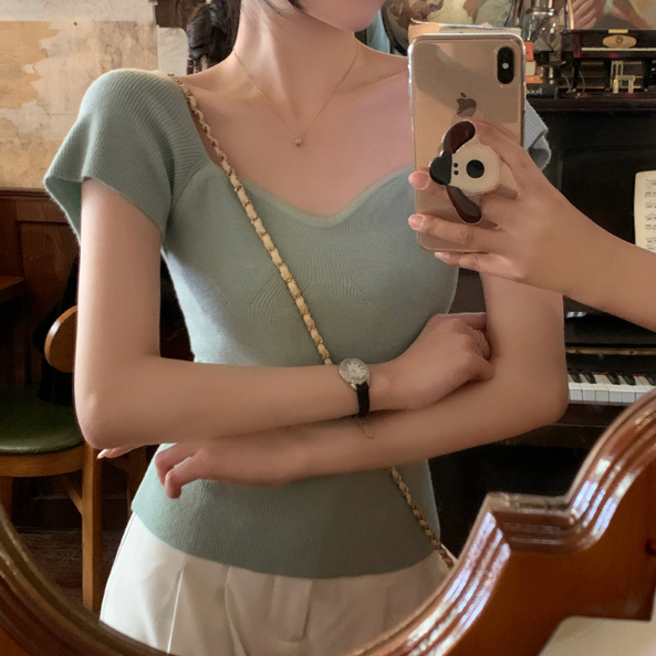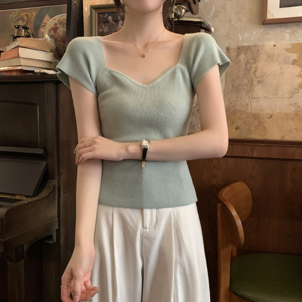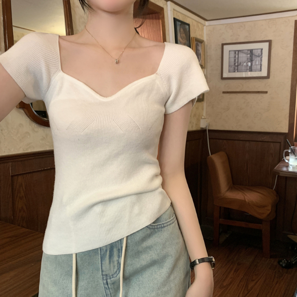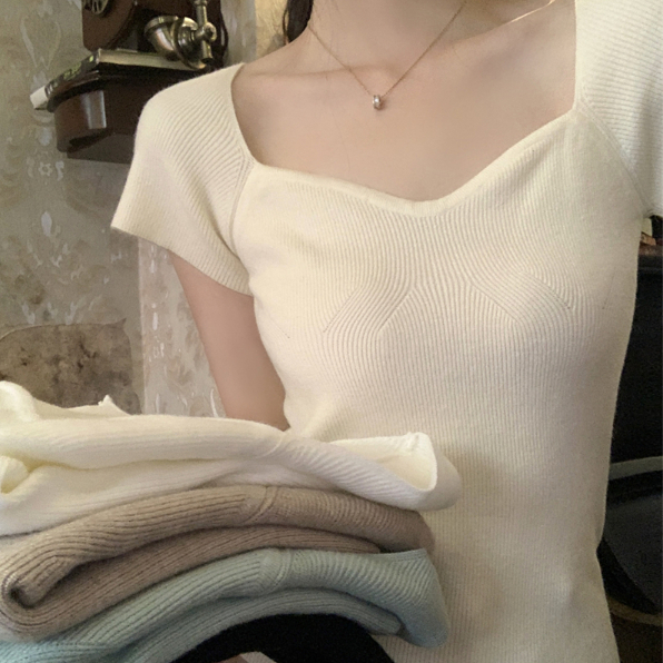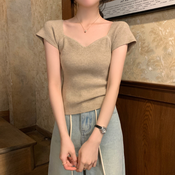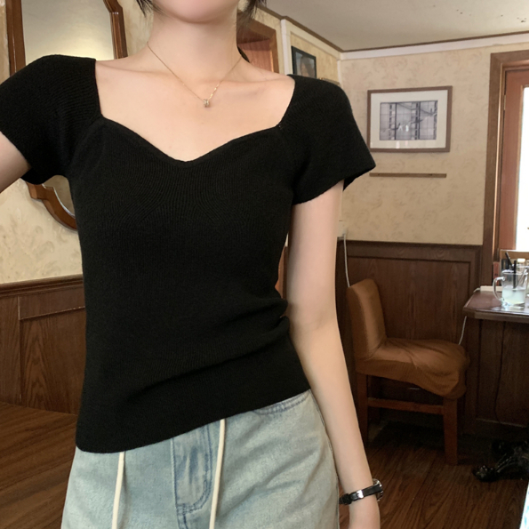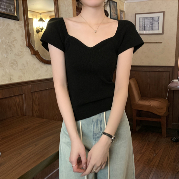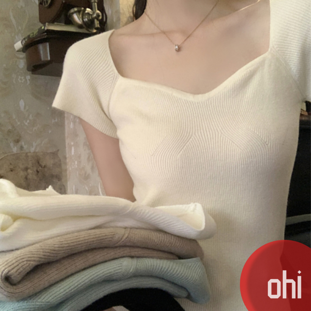 【ohi】法式露鎖骨 針織短袖 性感低領上衣 修身短款上衣 氣質女裝 夏天衣服 女裝 GWH6478黑色,均碼-65KG以內都可穿|白色,均碼-65KG以內都可穿|杏色,均碼-65KG以內都可穿|卡其色,均碼-65KG以內都可穿OHI衣著