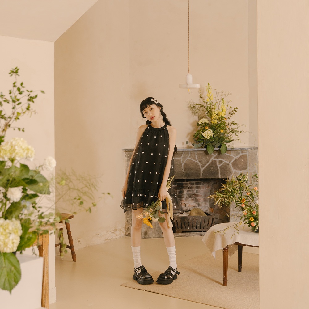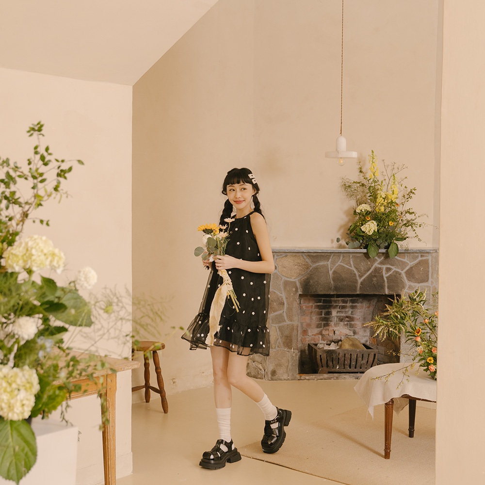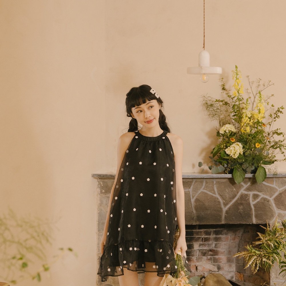 QUEENSHOP_ S 女裝 柏心聯名 刺繡小花削肩透紗短洋裝-黑 S/M 現+預 【01086999】黑S|黑MQUEENSHOP