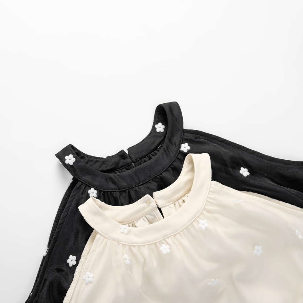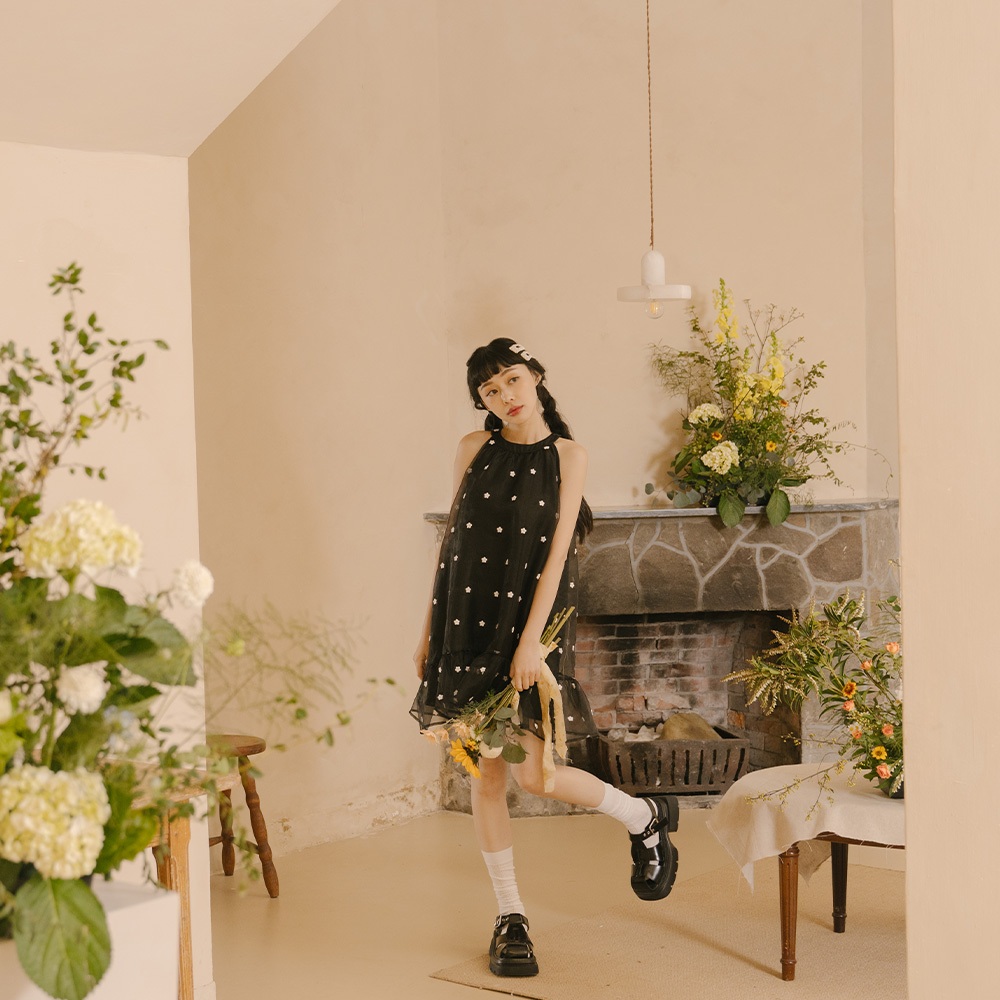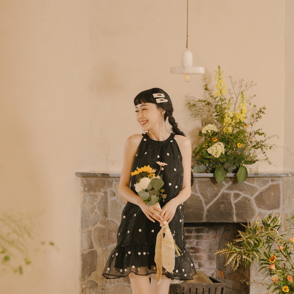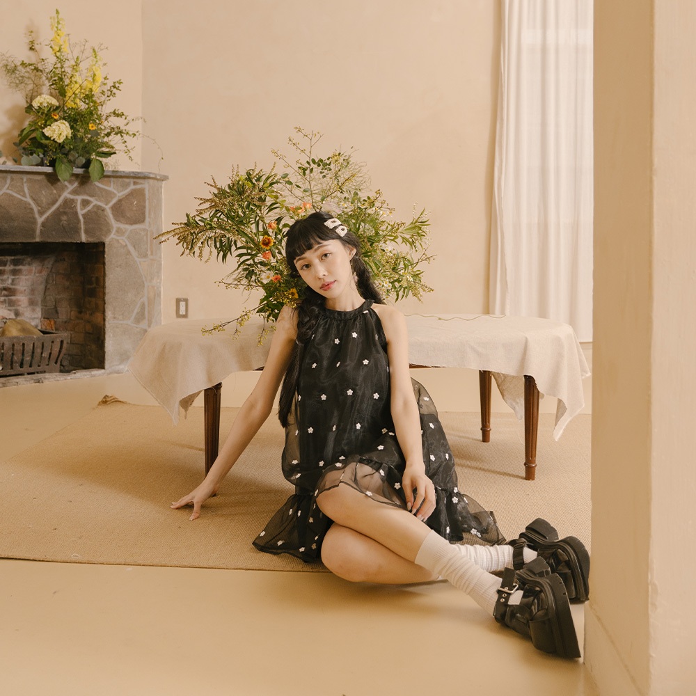 QUEENSHOP_ S 女裝 柏心聯名 刺繡小花削肩透紗短洋裝-黑 S/M 現+預 【01086999】黑S|黑MQUEENSHOP