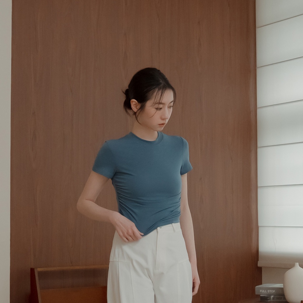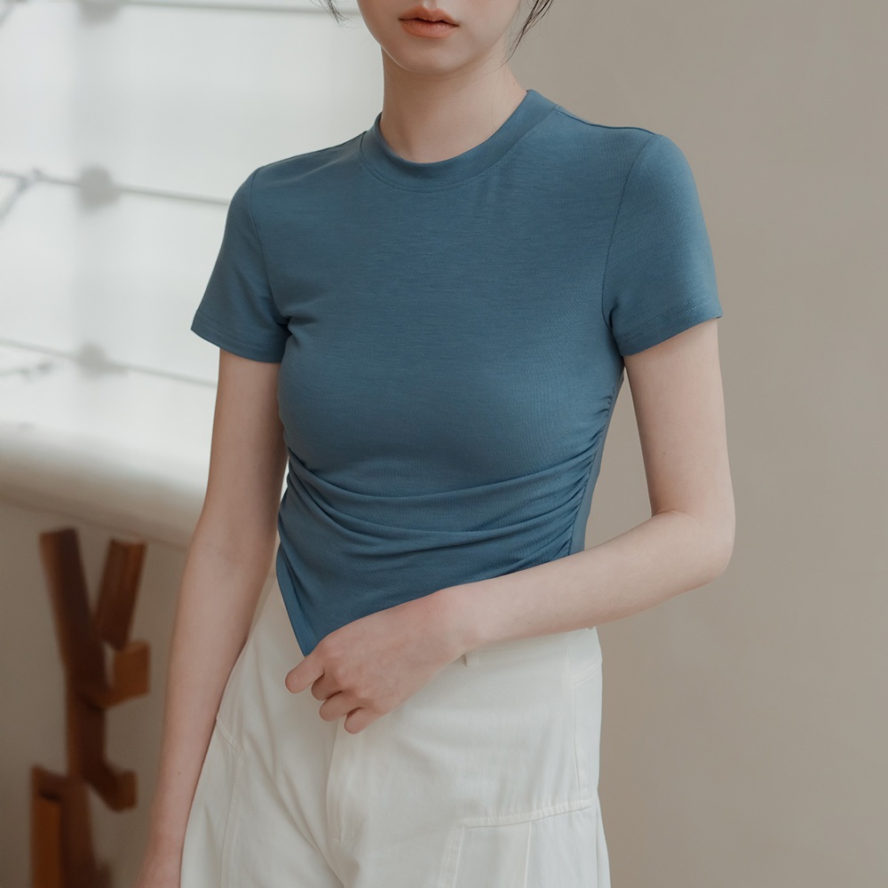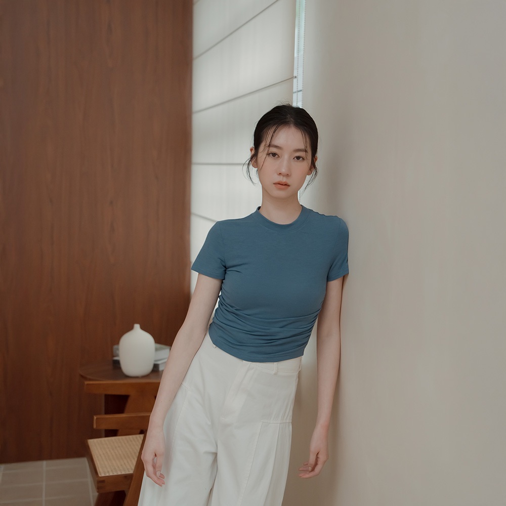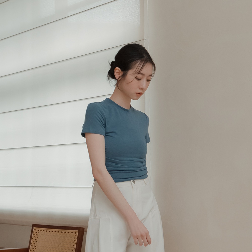 QUEENSHOP_ S 女裝 短袖 簡約側抽皺設計合身圓領上衣-藍 現+預 【01098881】藍OthersQUEENSHOP