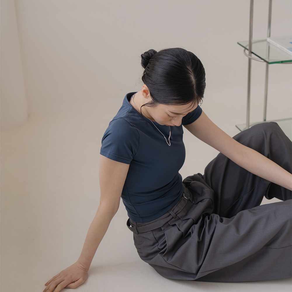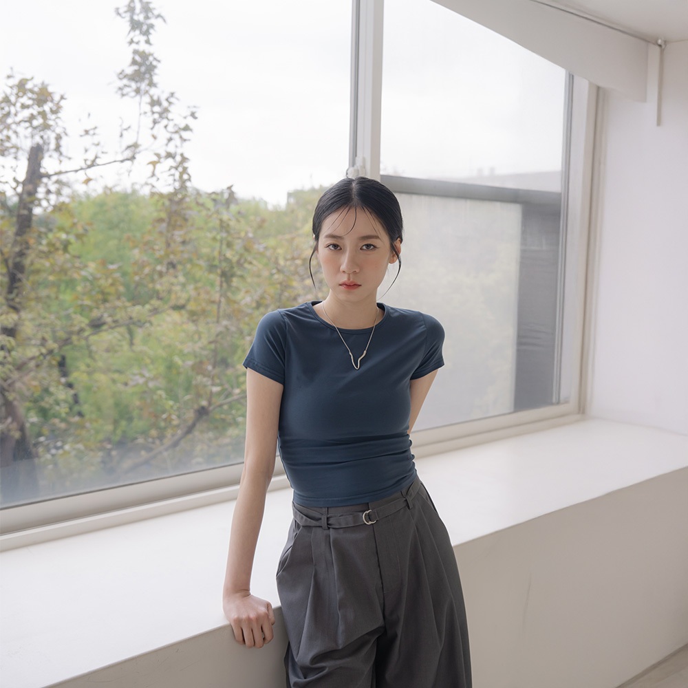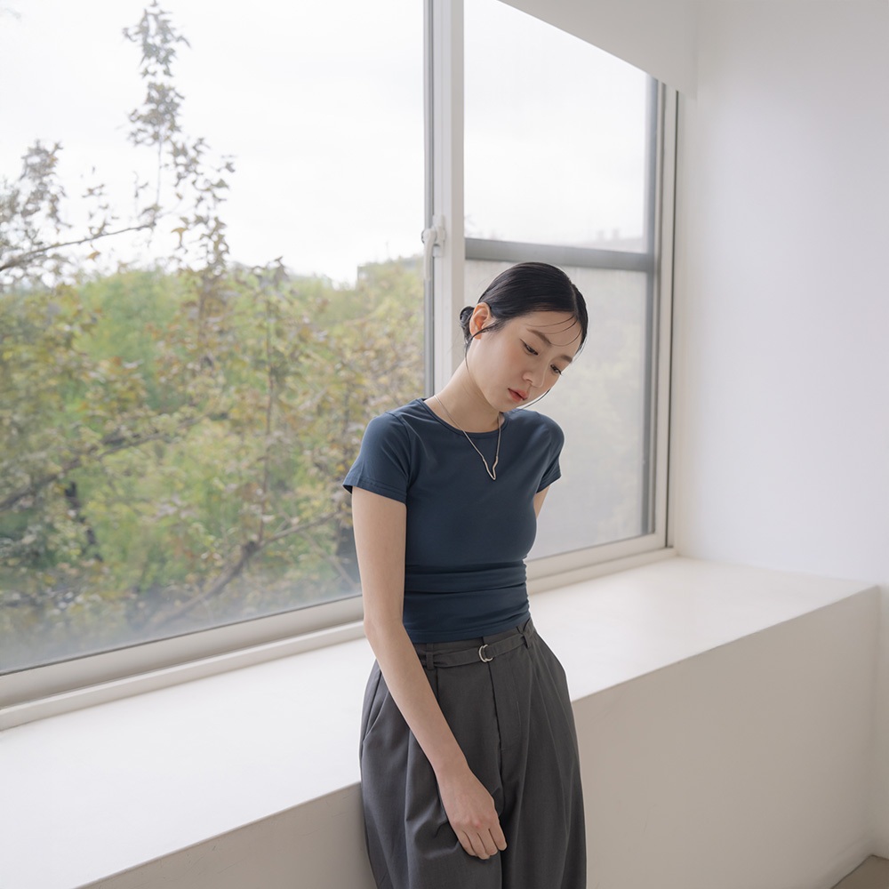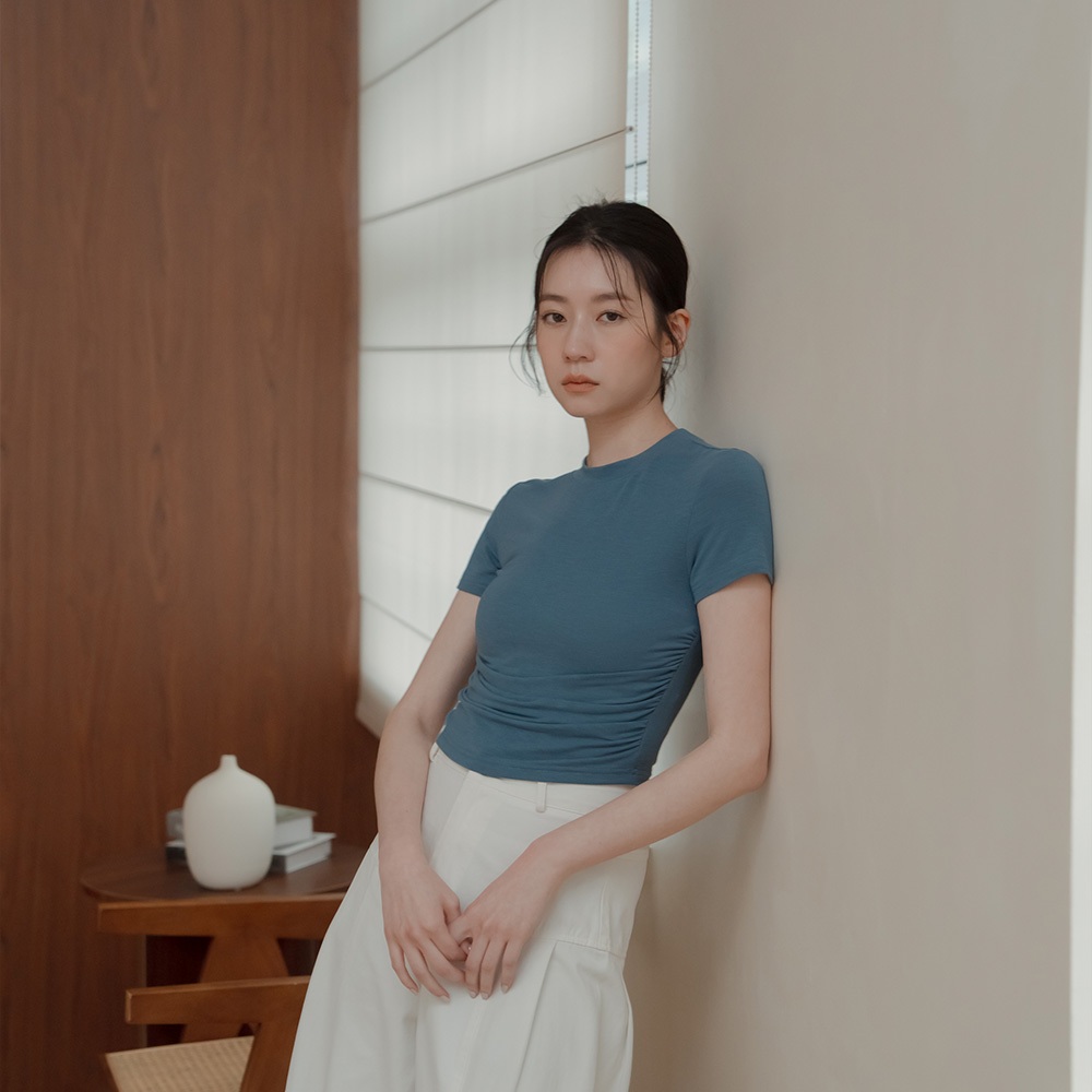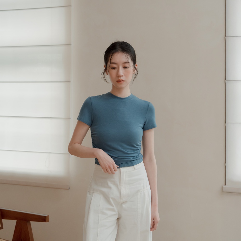 QUEENSHOP_ S 女裝 短袖 簡約側抽皺設計合身圓領上衣-藍 現+預 【01098881】藍OthersQUEENSHOP
