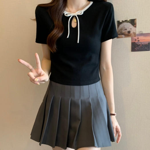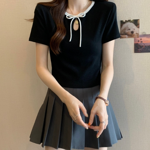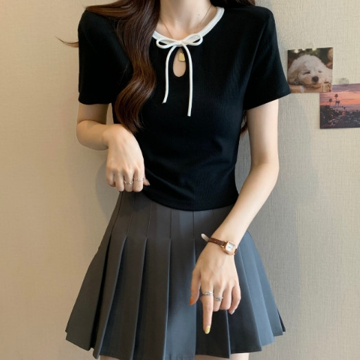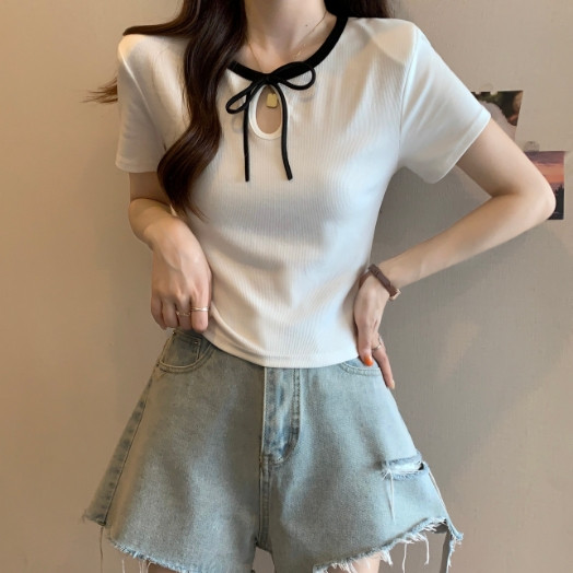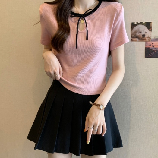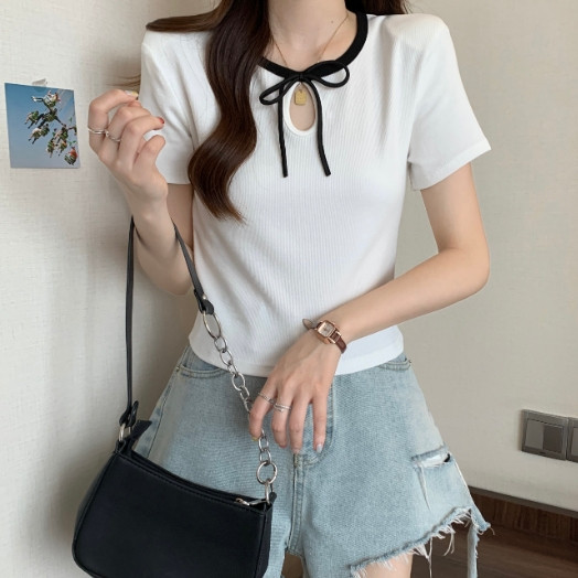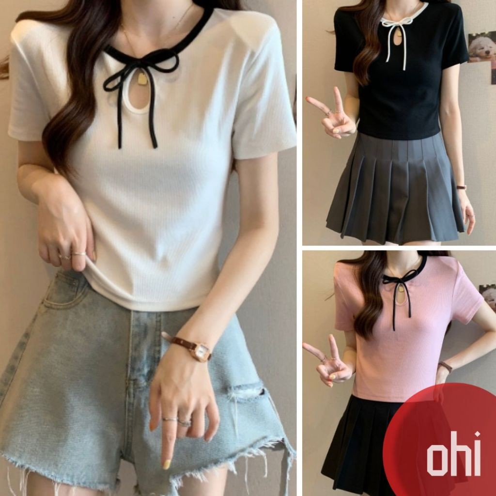 【ohi】蝴蝶結縷空正肩短袖T恤 短款漂亮小衫 女生顯瘦百搭 顯瘦上衣 簡約上衣 夏天衣服 女裝 GTD5777白色,均碼-F(40-65KG可穿)|黑色,均碼-F(40-65KG可穿)|粉色,均碼-F(40-65KG可穿)T-shirtsOHI衣著