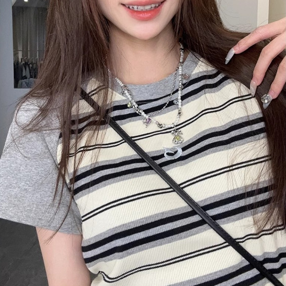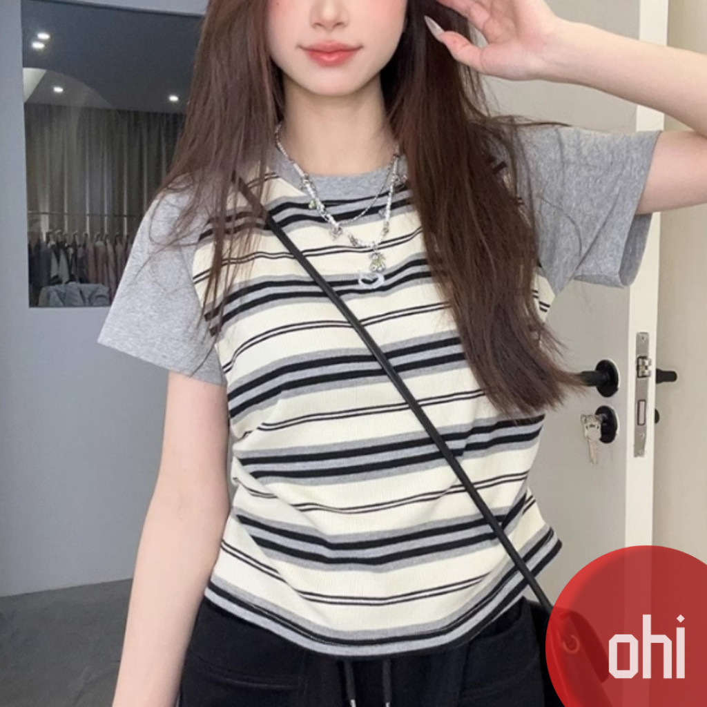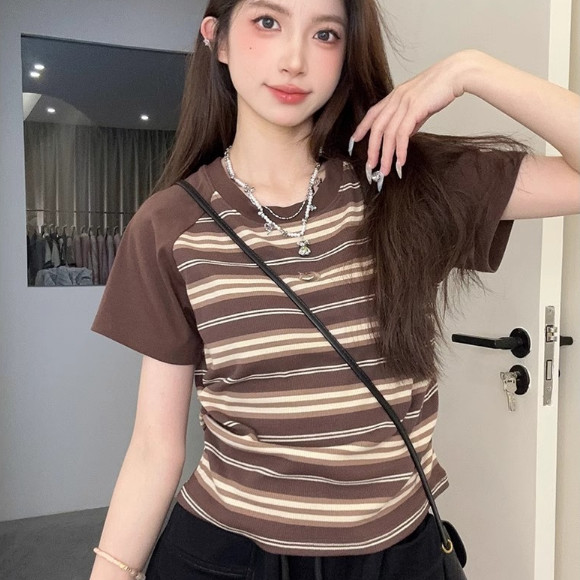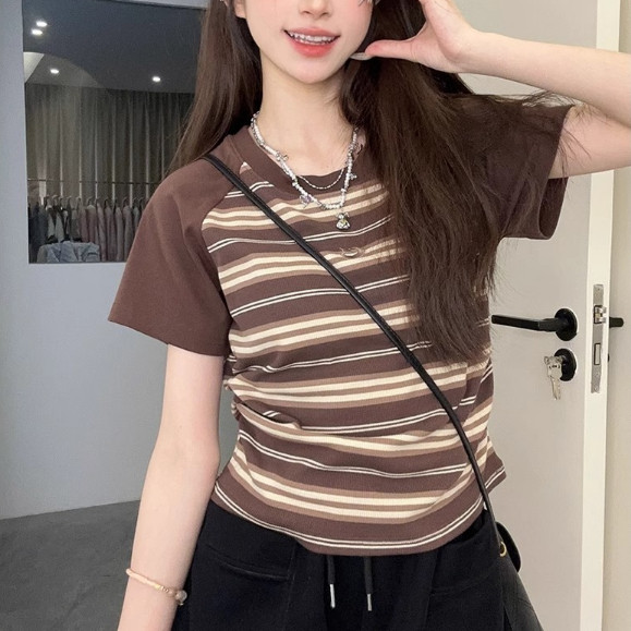 【ohi】韓版條紋短袖上衣 小眾設計感 甜妹風 修身短款 刺繡插肩上衣 針織上衣T恤 夏天衣服 女裝 GWH6504杏色,均碼-65KG以內都可穿|卡其色,均碼-65KG以內都可穿T-shirtsOHI衣著