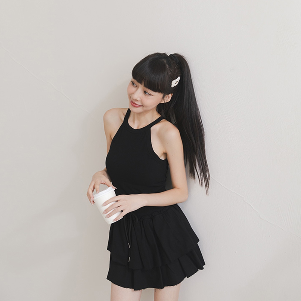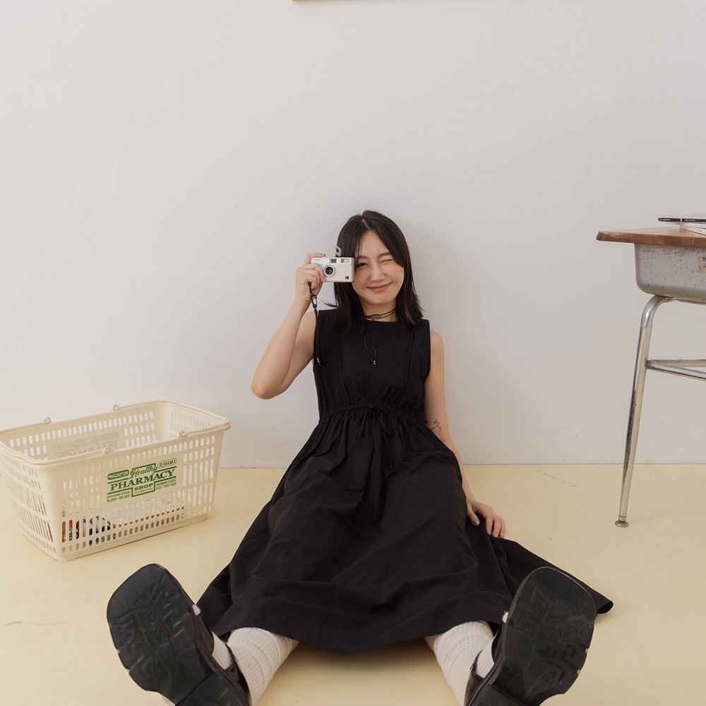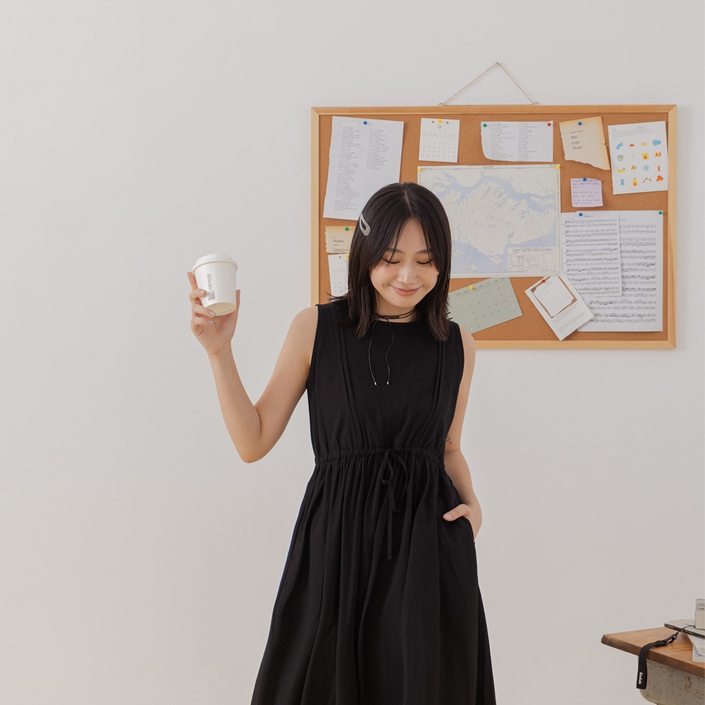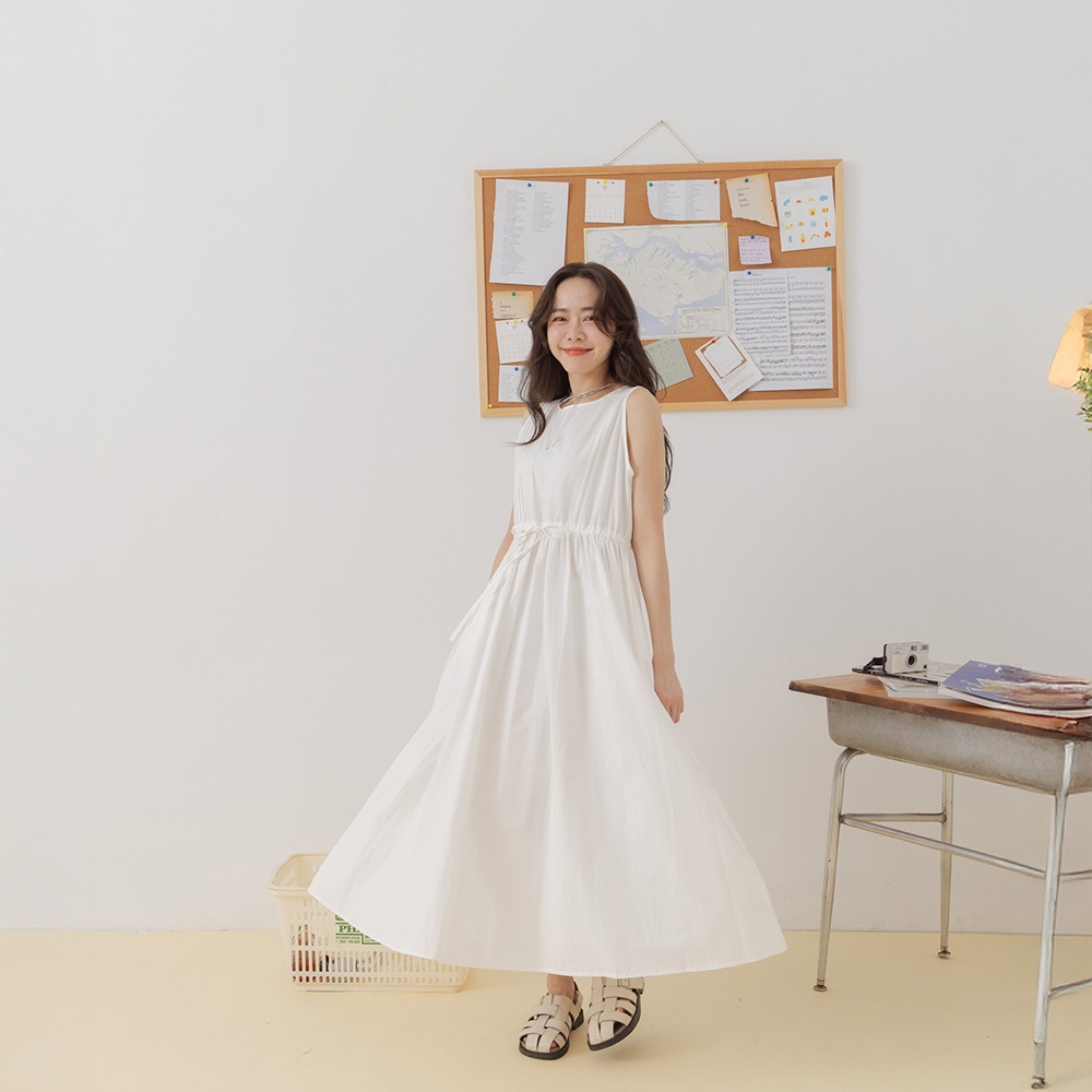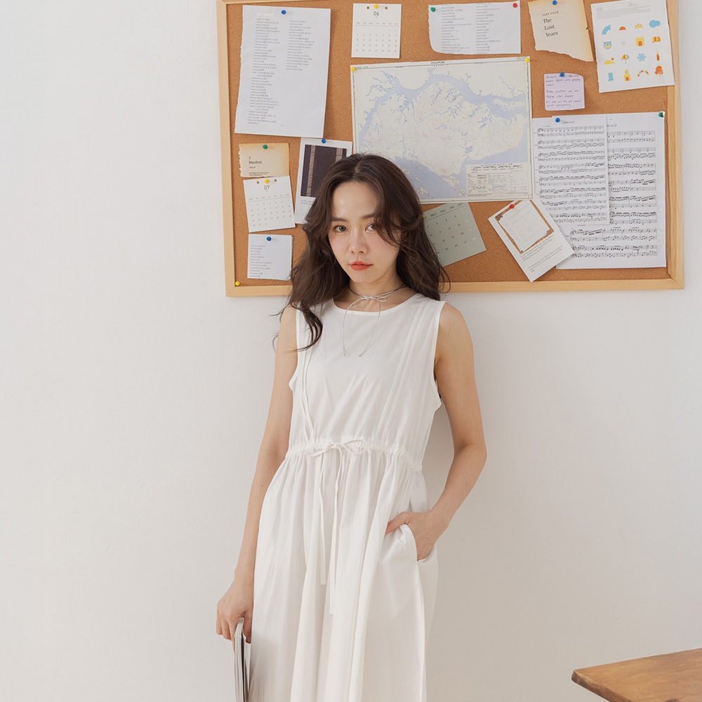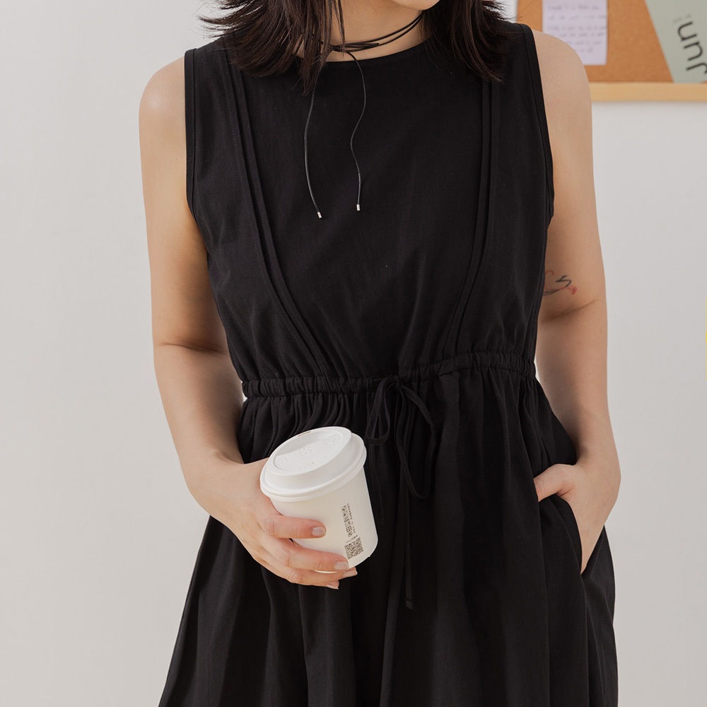QUEENSHOP_ S 女裝 簡約腰抽繩細褶背心長洋裝 兩色售 現+預 【01086985】黑|米白QUEENSHOP
