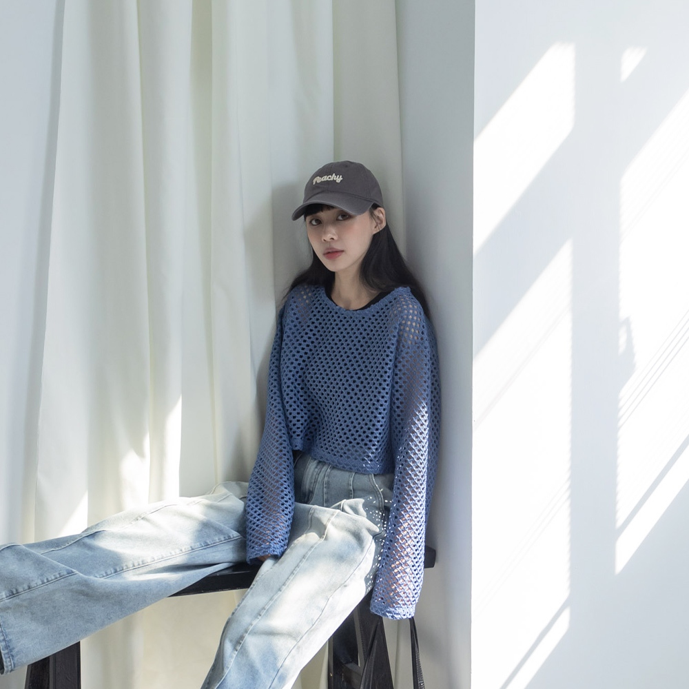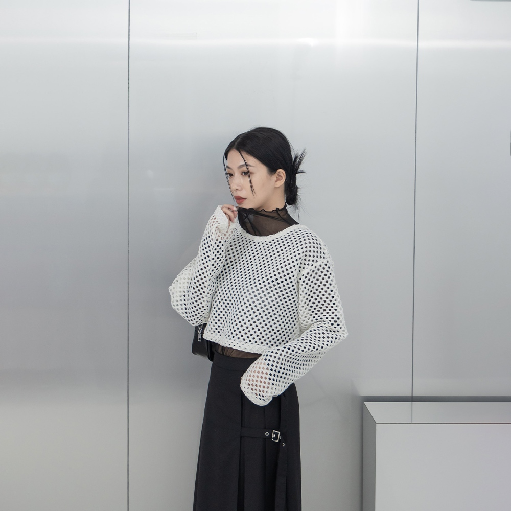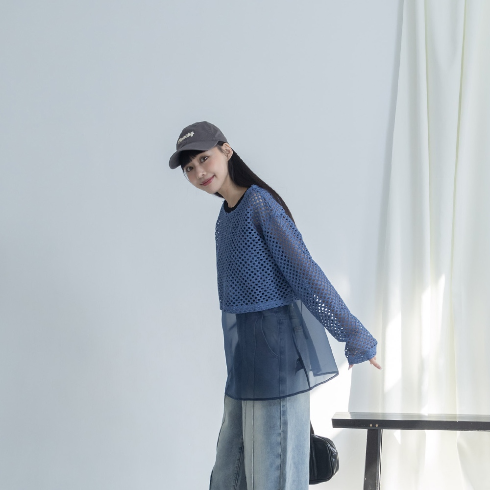 QUEENSHOP_ S 女裝 長袖 鏤空洞洞網布短版上衣 四色售 現+預 【01098438】黑|米白|灰藍|淺紫OthersQUEENSHOP