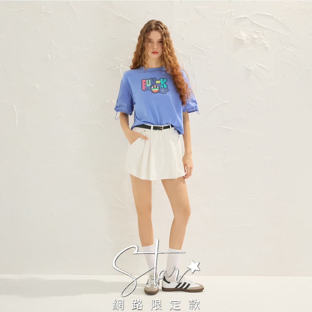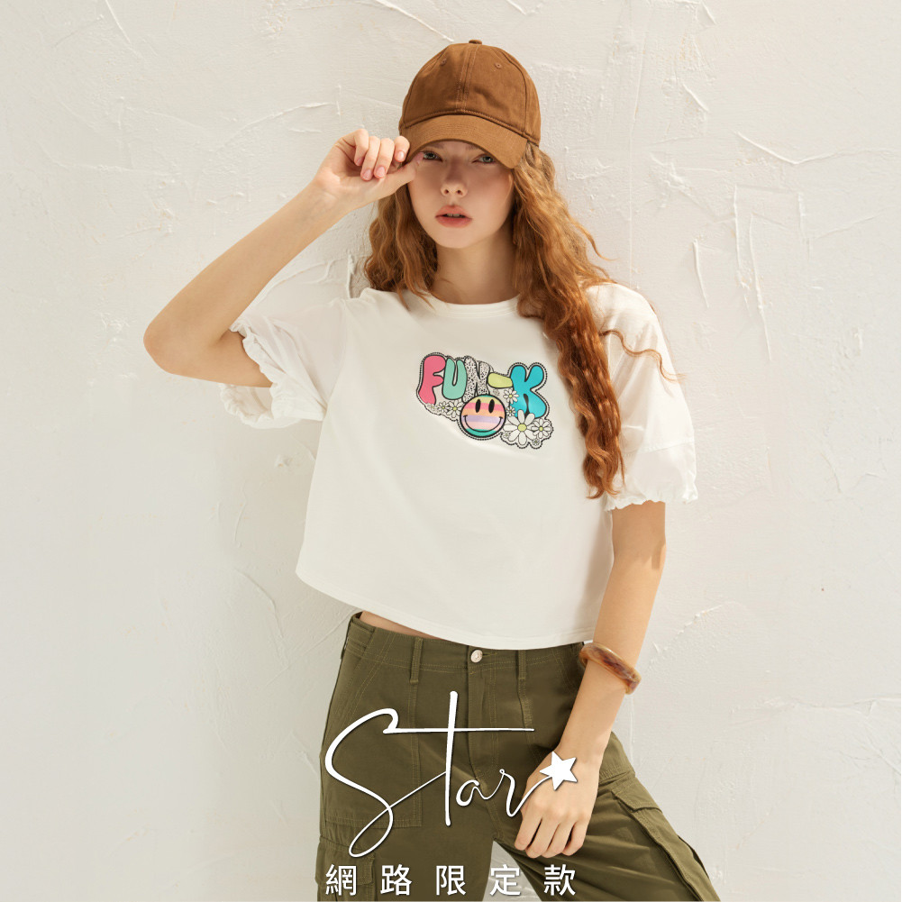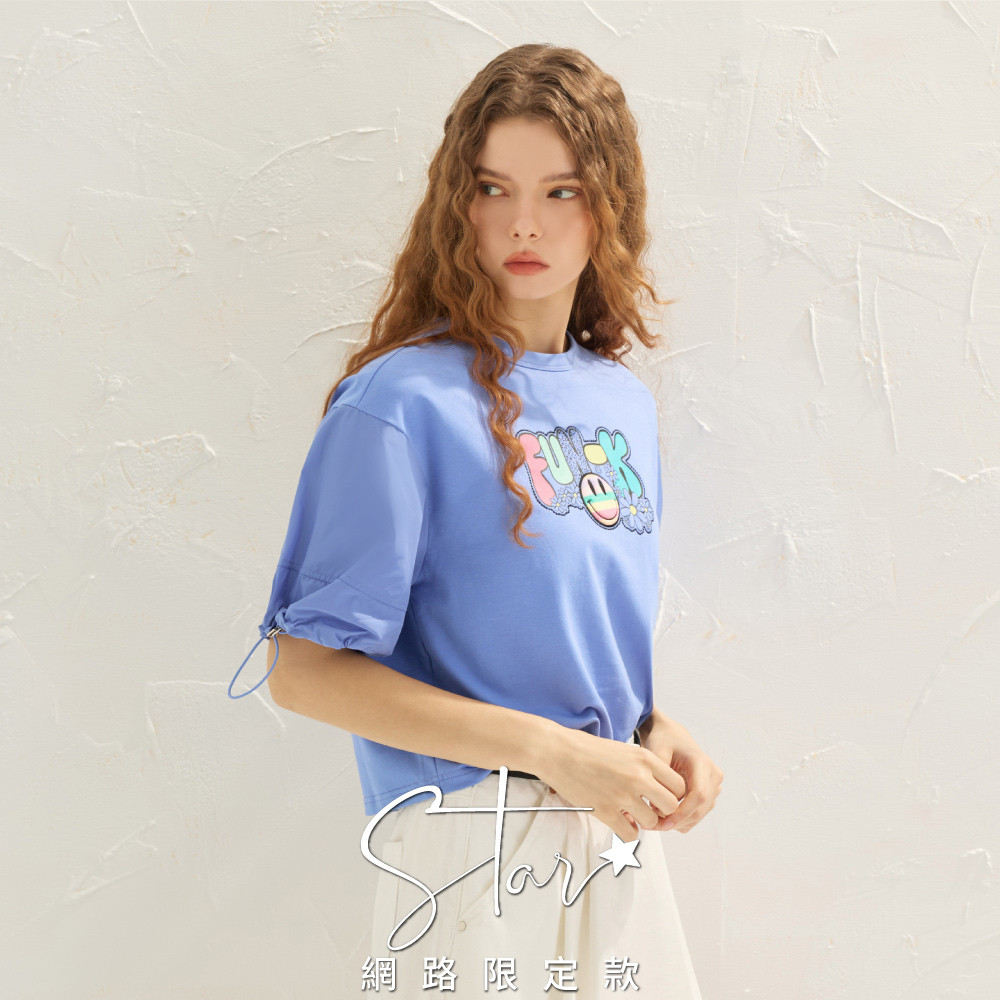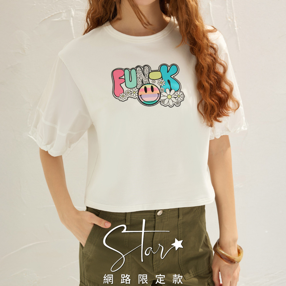 SO NICE 彩虹笑臉字母印花五分澎袖棉質上衣|白/藍|STAR|都會時尚女裝【3553F018】白,36(S)|白,38(M)|白,42(XL)|藍,34(XS)|白,34(XS)|白,40(L)|藍,36(S)|藍,38(M)|藍,40(L)|藍,42(XL)T-shirtsSO NICE 官方旗艦店