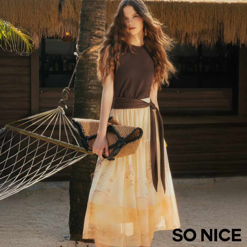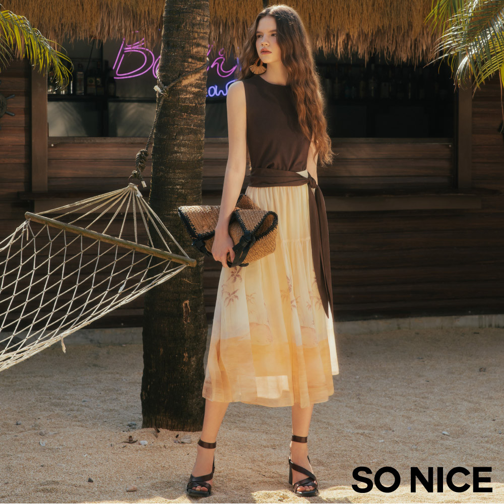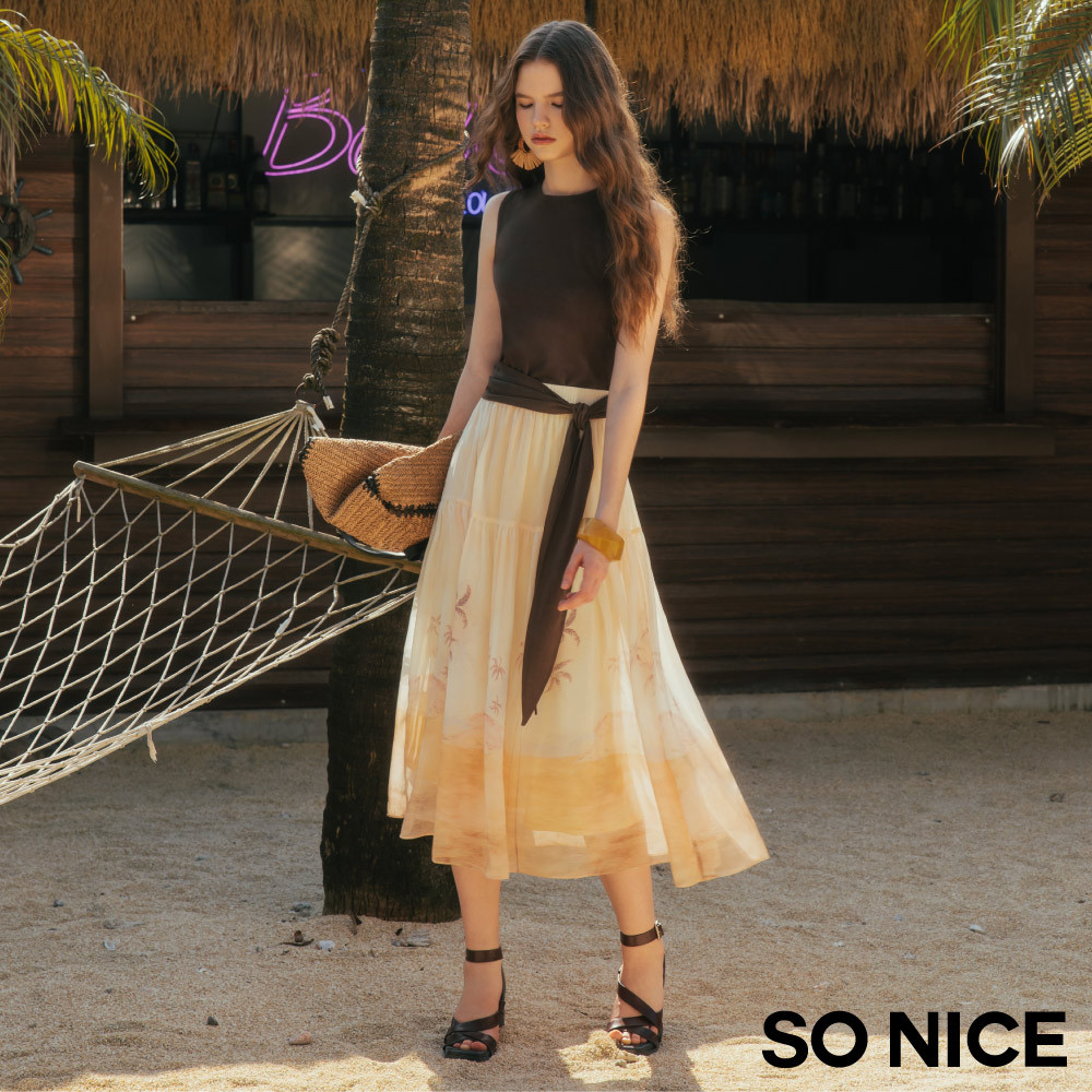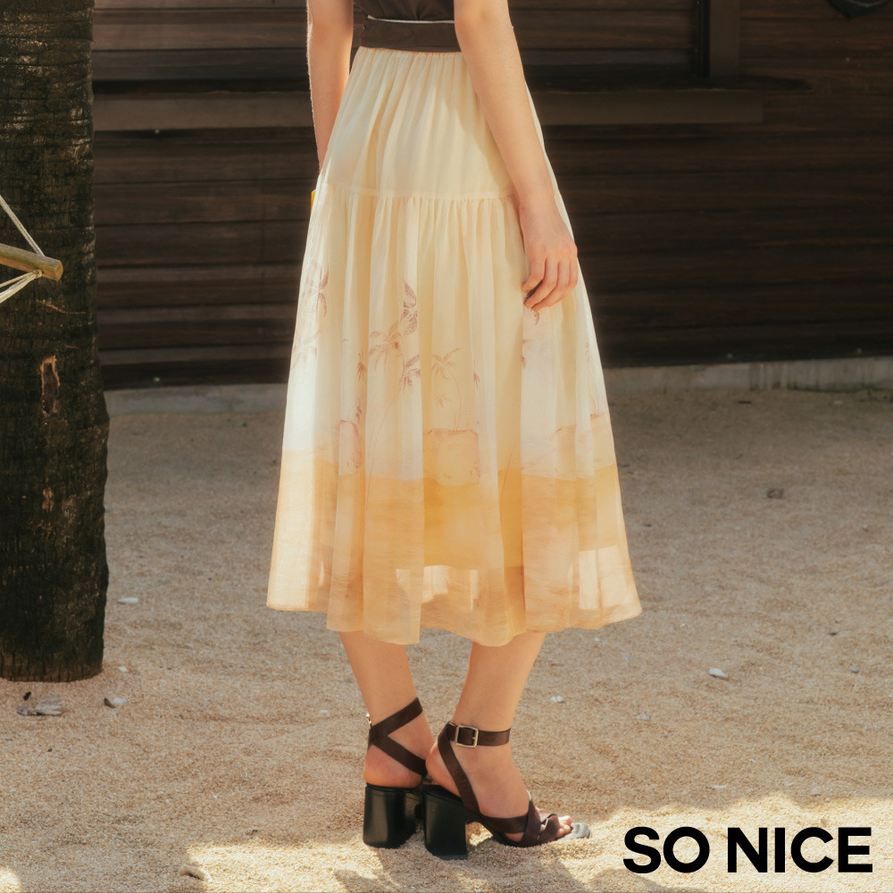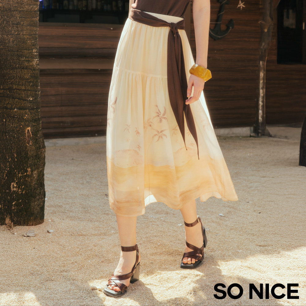 SO NICE 波希米亞風海島印花蛋糕雪紡長裙|都會時尚女裝【65543004】淺桔,34(XS)|淺桔,36(S)|淺桔,38(M)|淺桔,40(L)SO NICE 官方旗艦店
