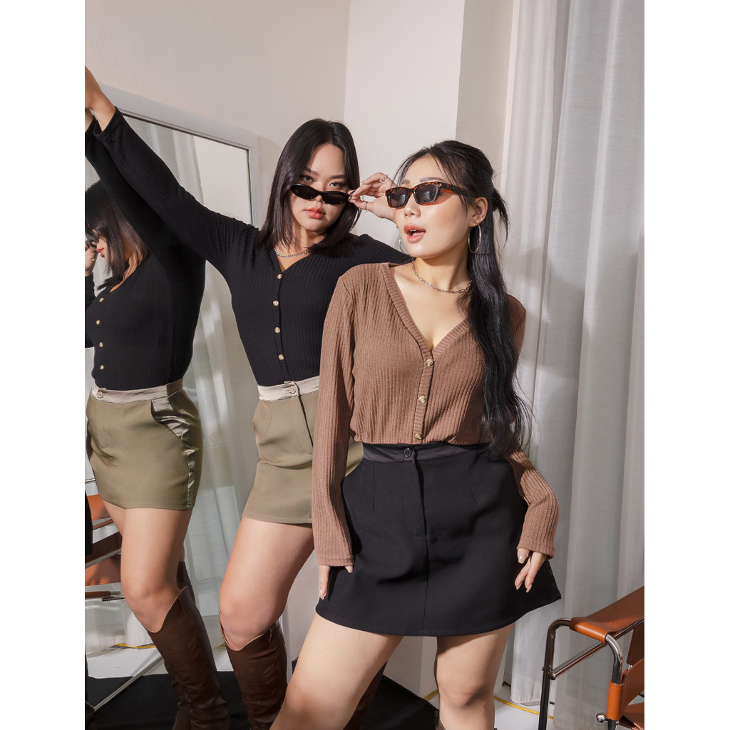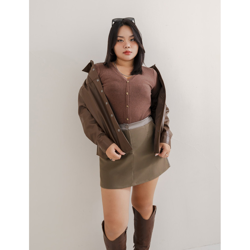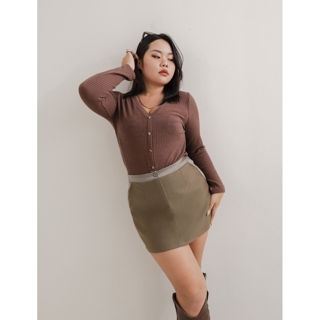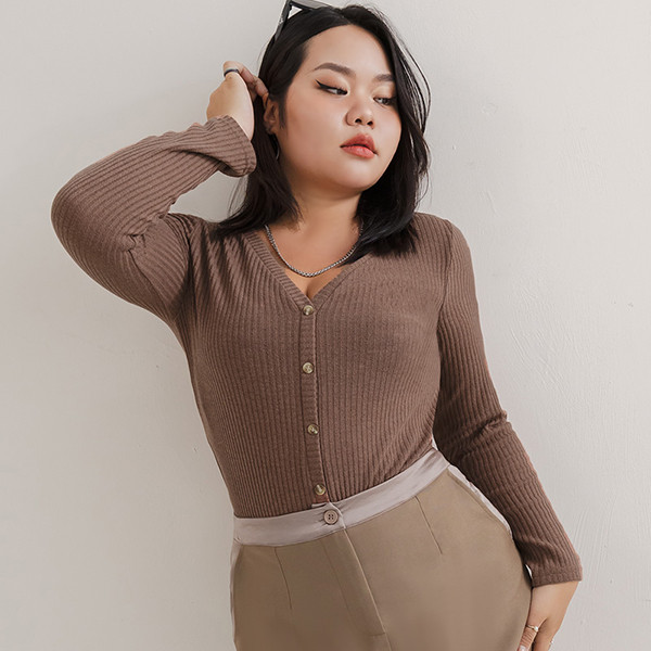 【PolyLulu】 MUA!歐美辣妹V領假門襟坑條長袖上衣 中大尺碼上衣 棕色3XL|L|XL|2XLOthersPOLY LULU丨BEAUTY HAS NO SIZE 中大尺碼女裝