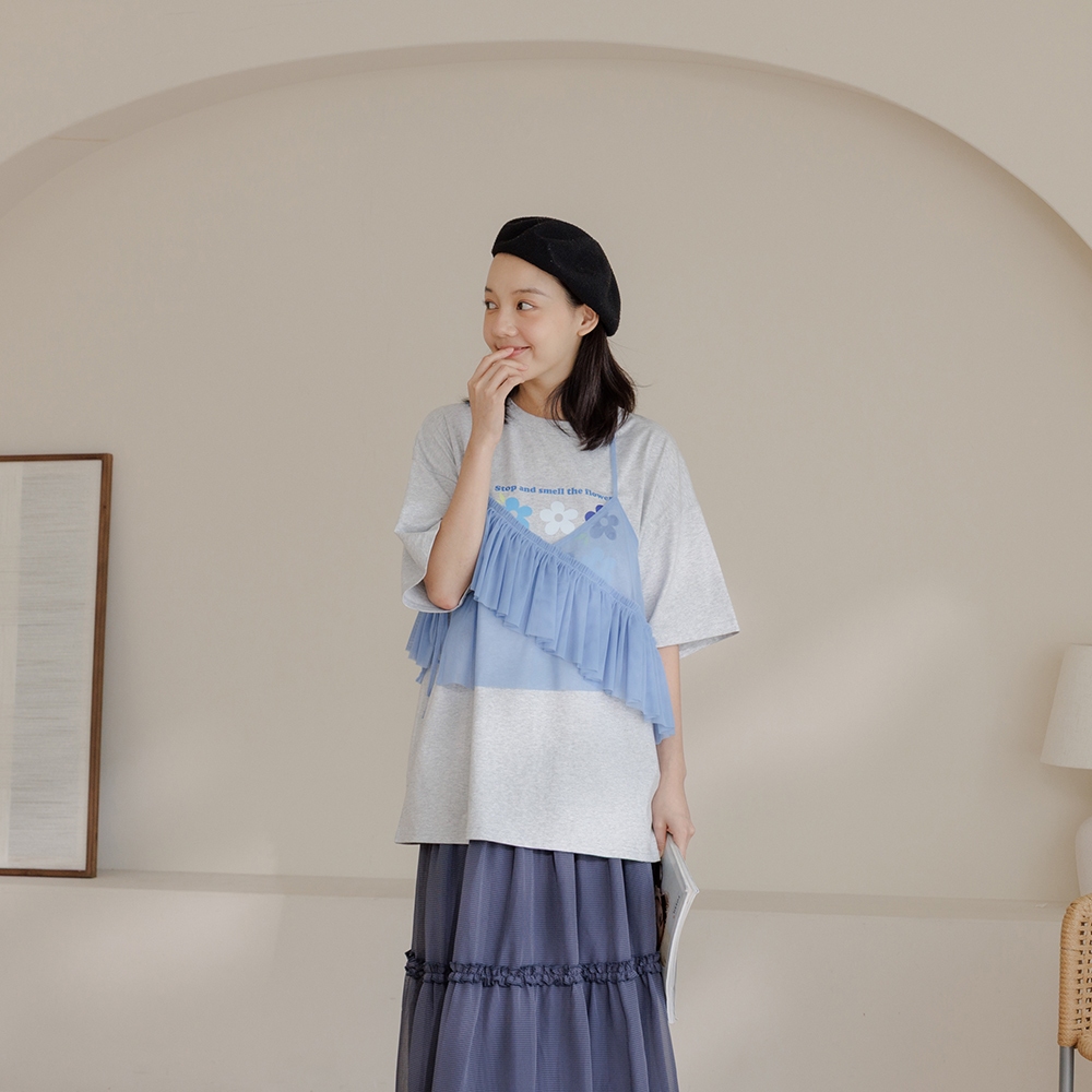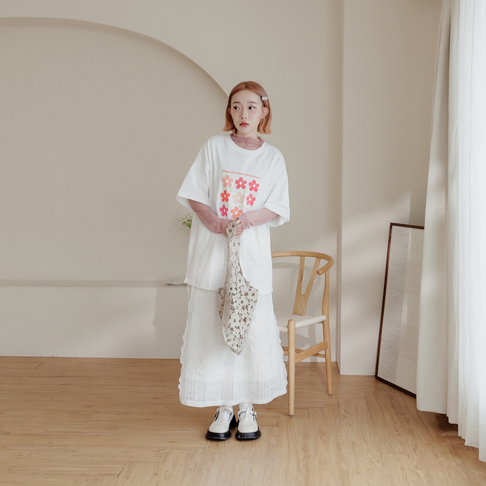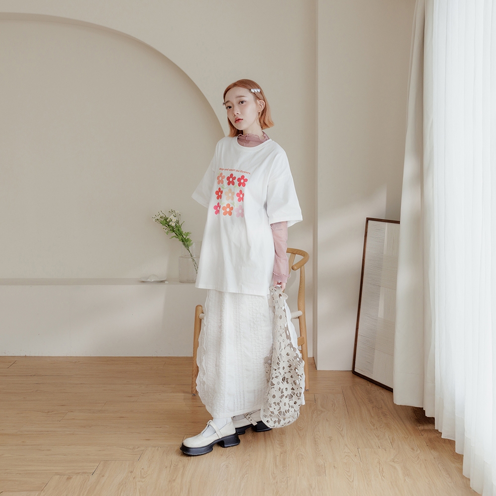 QUEENSHOP_ S 女裝 繽紛小花印圖寬版短袖上衣 兩色售 現+預 【01190265】灰|米白T-shirtsQUEENSHOP