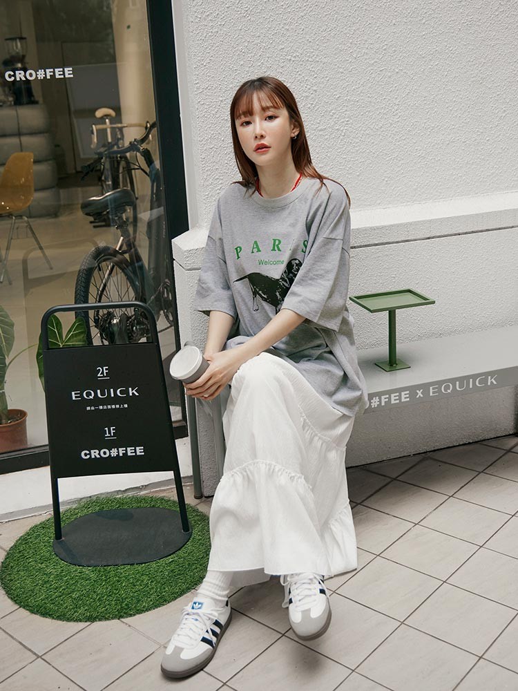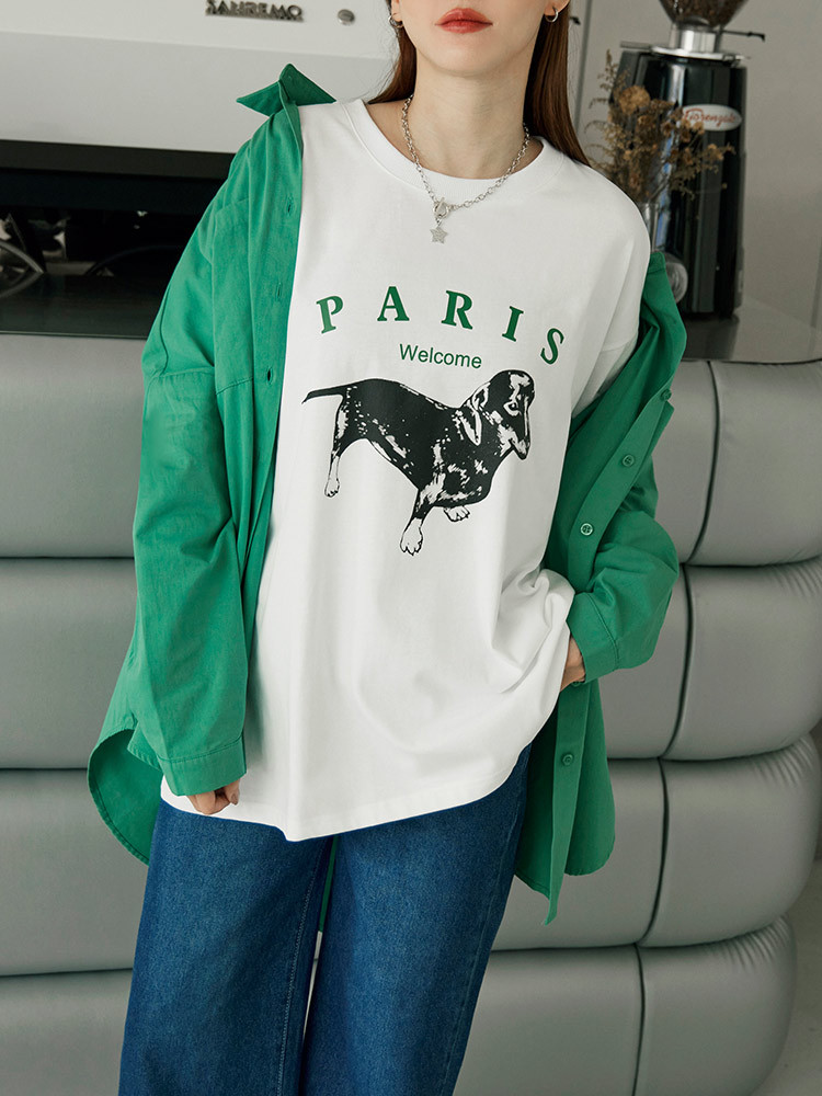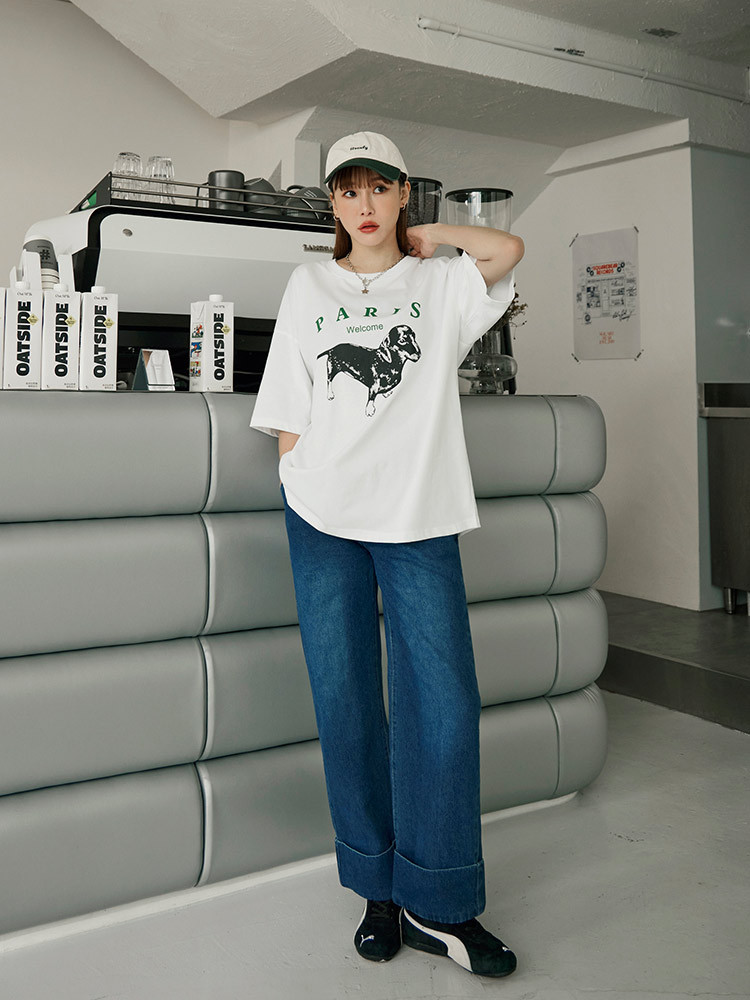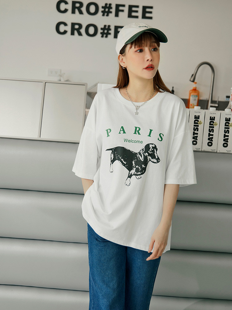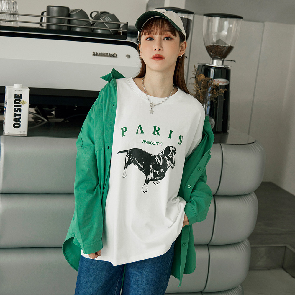 OB嚴選 純棉小狗字母印花寬版短袖上衣 《AB20039》白,F|白,XL|白,2L|白,3L|灰,F|灰,XL|灰,2L|灰,3LT-shirtsOB嚴選官方旗艦店