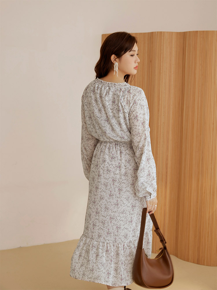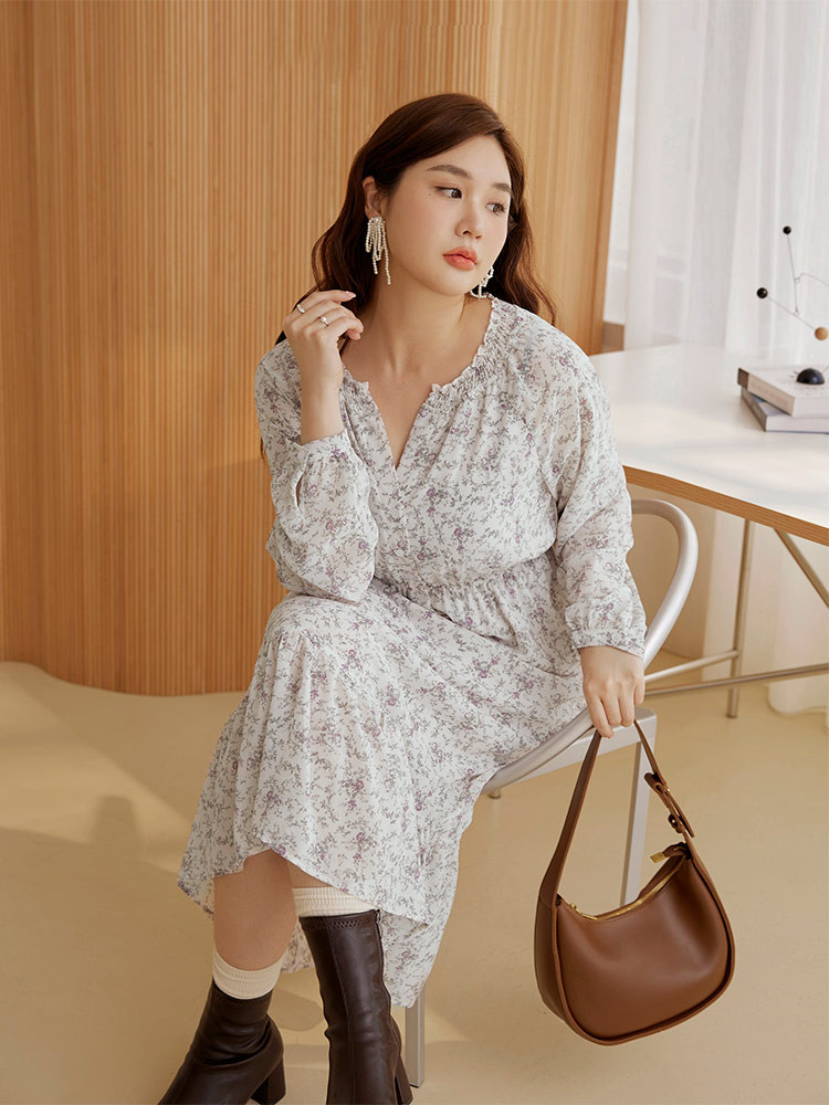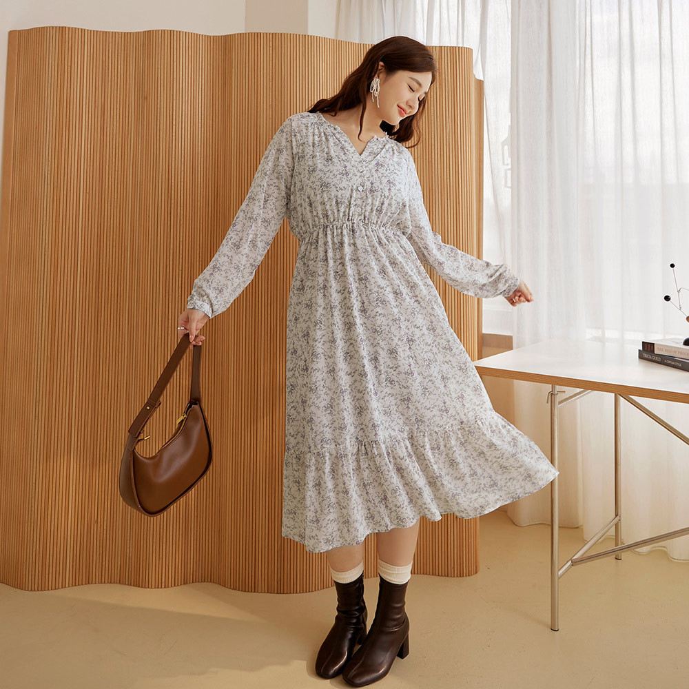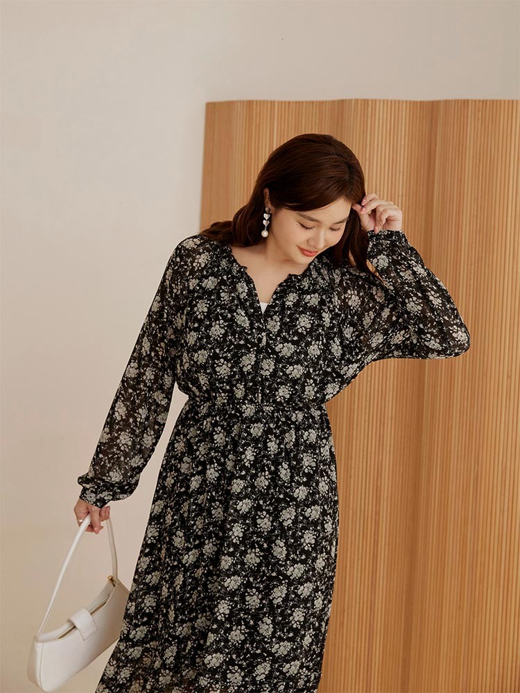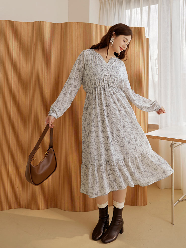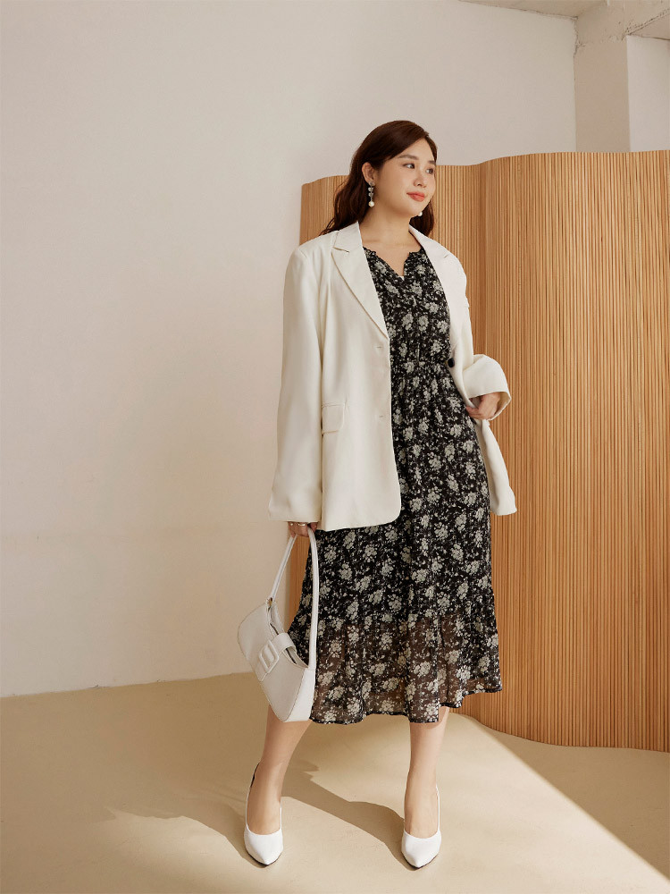 OB嚴選 雲朵自訂款-質感碎花小V領收腰傘襬洋裝 《DA10172》大尺碼/女裝/現貨灰,3L|黑,XL|黑,2L|黑,3L|灰,XL|灰,2LOB嚴選官方旗艦店