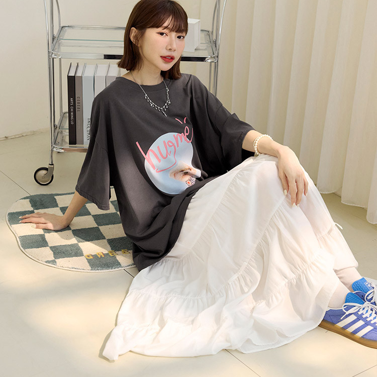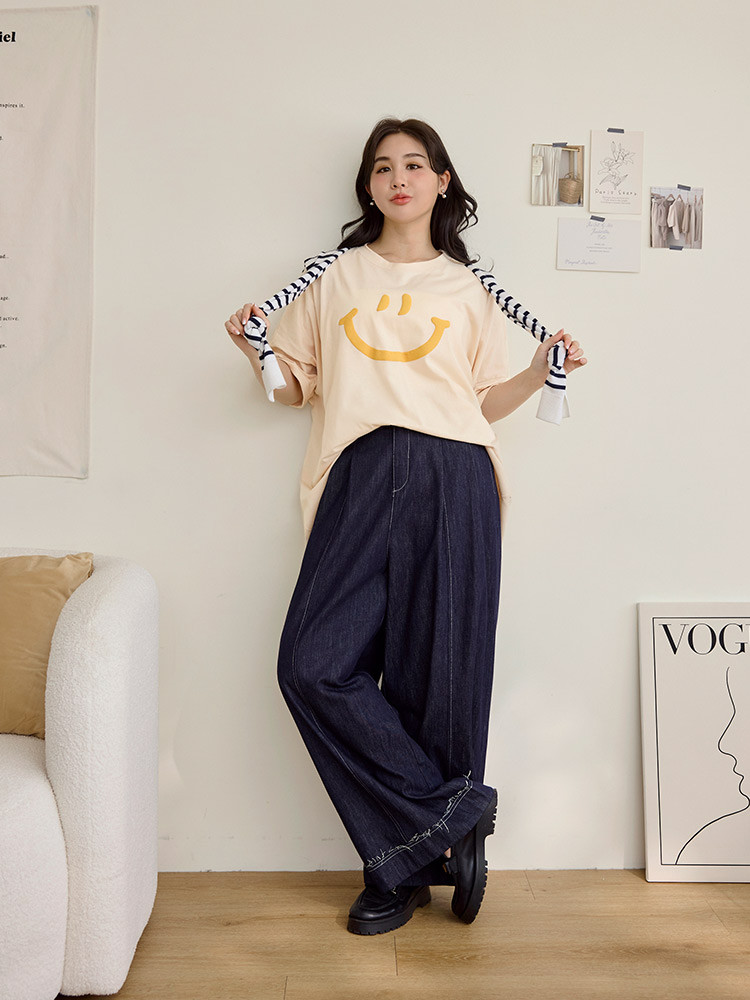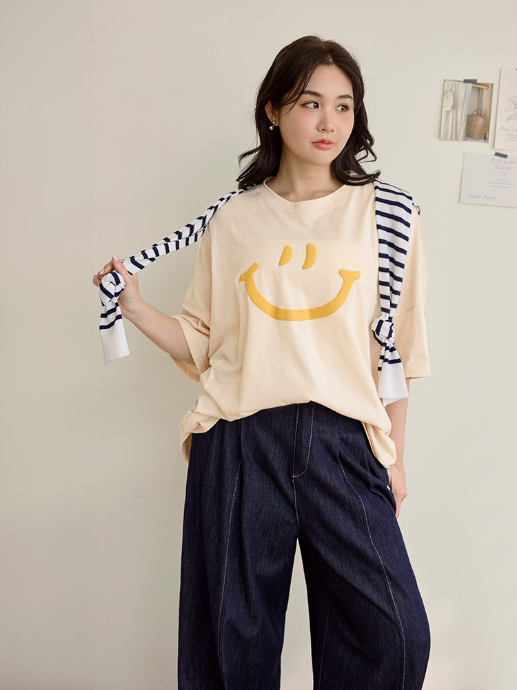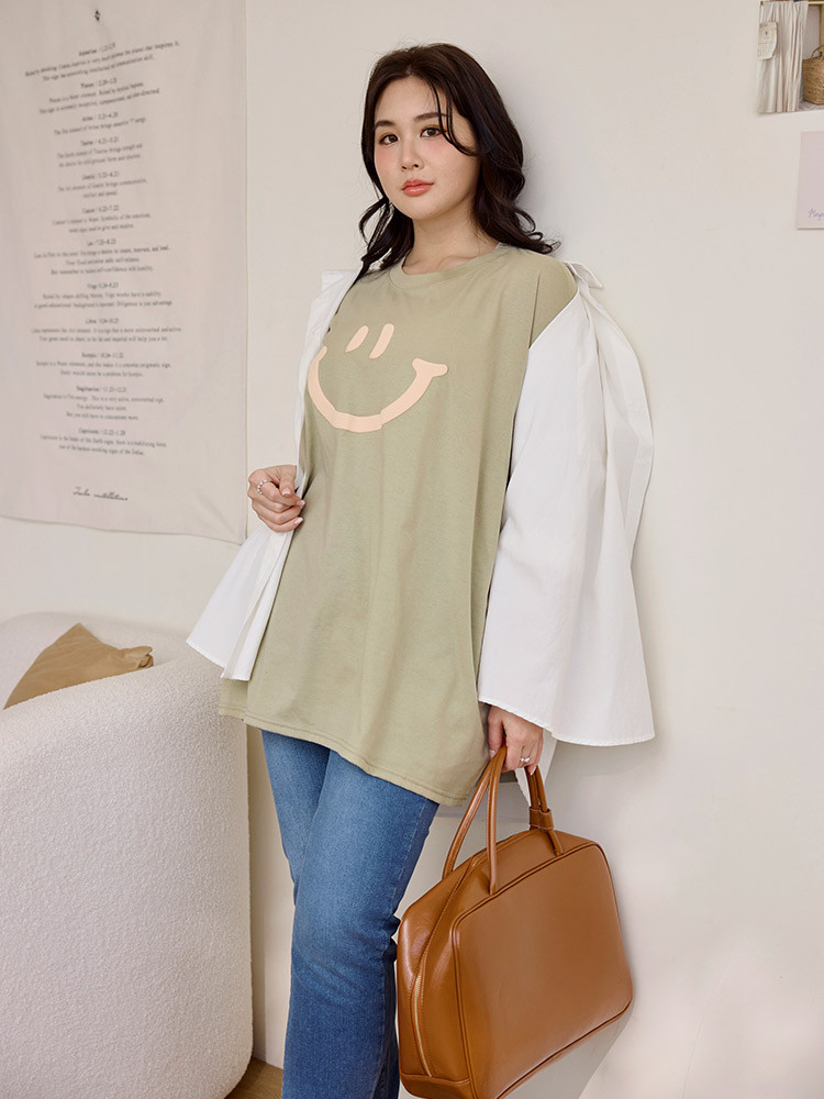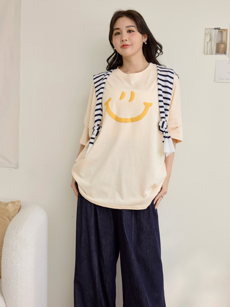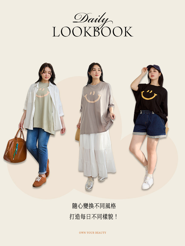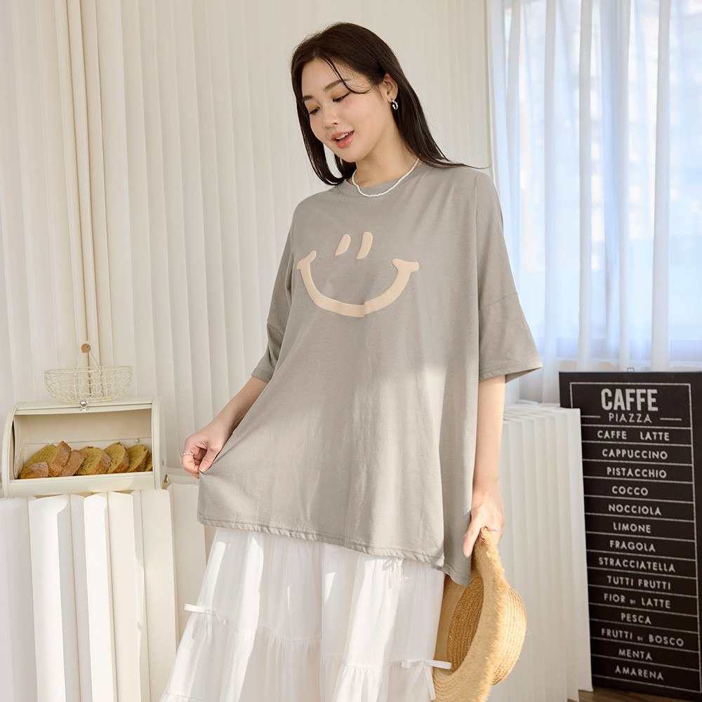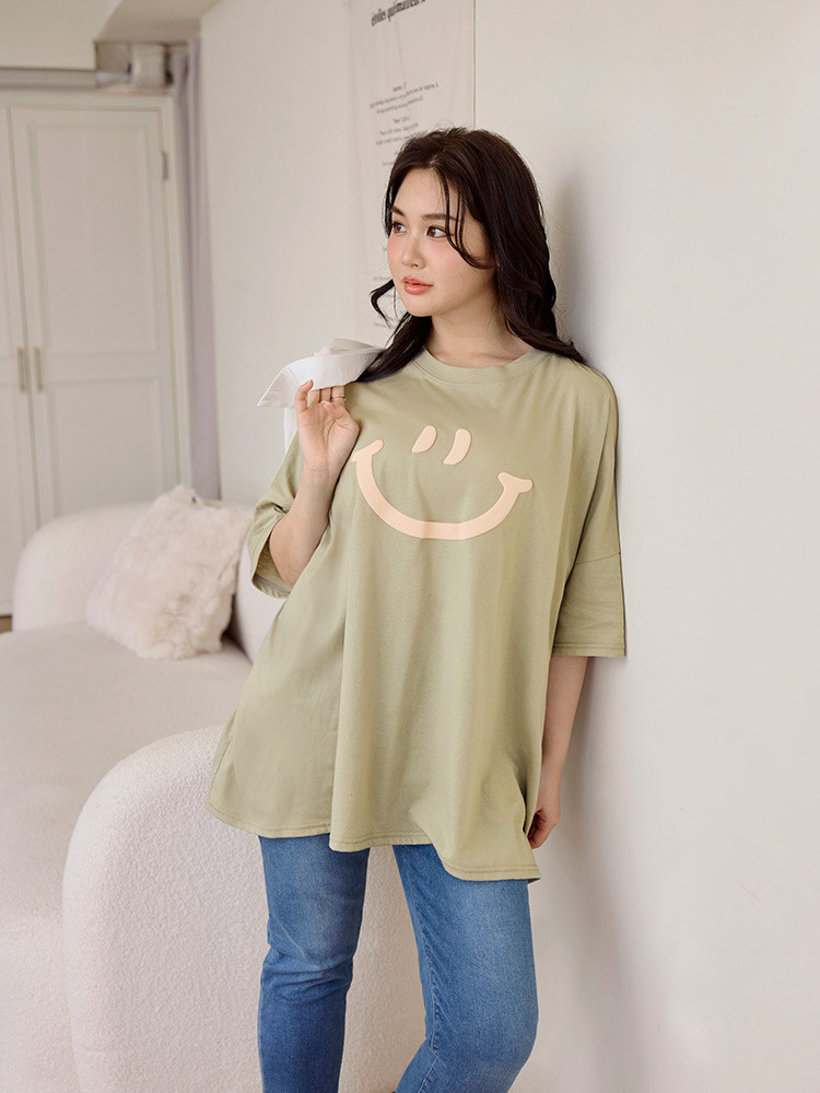 OB嚴選 雲朵自訂款-親膚棉質笑臉發泡印花寬版上衣 《AB20282》湖綠,2L|黑,2L|大象灰,2L|杏,2LT-shirtsOB嚴選官方旗艦店