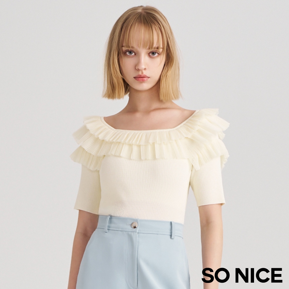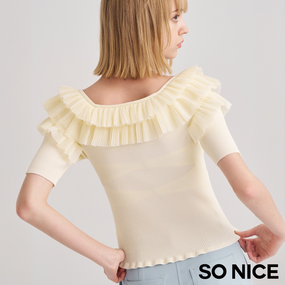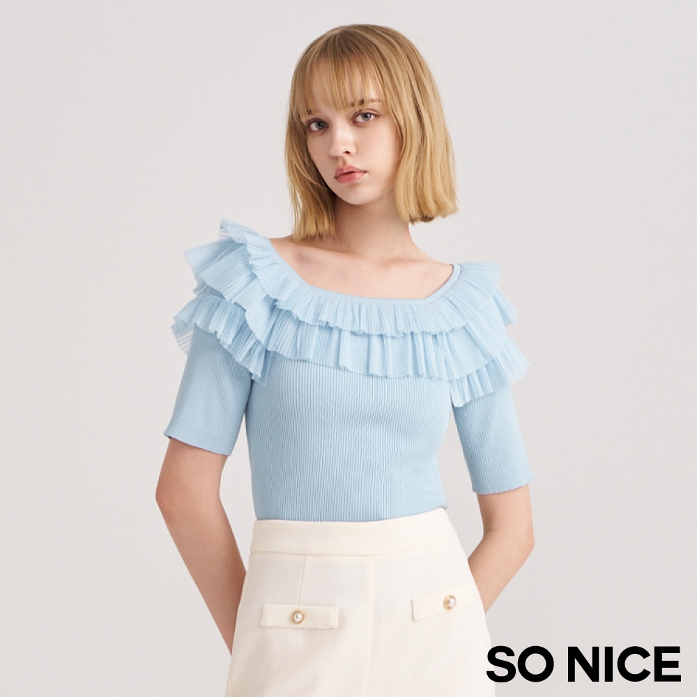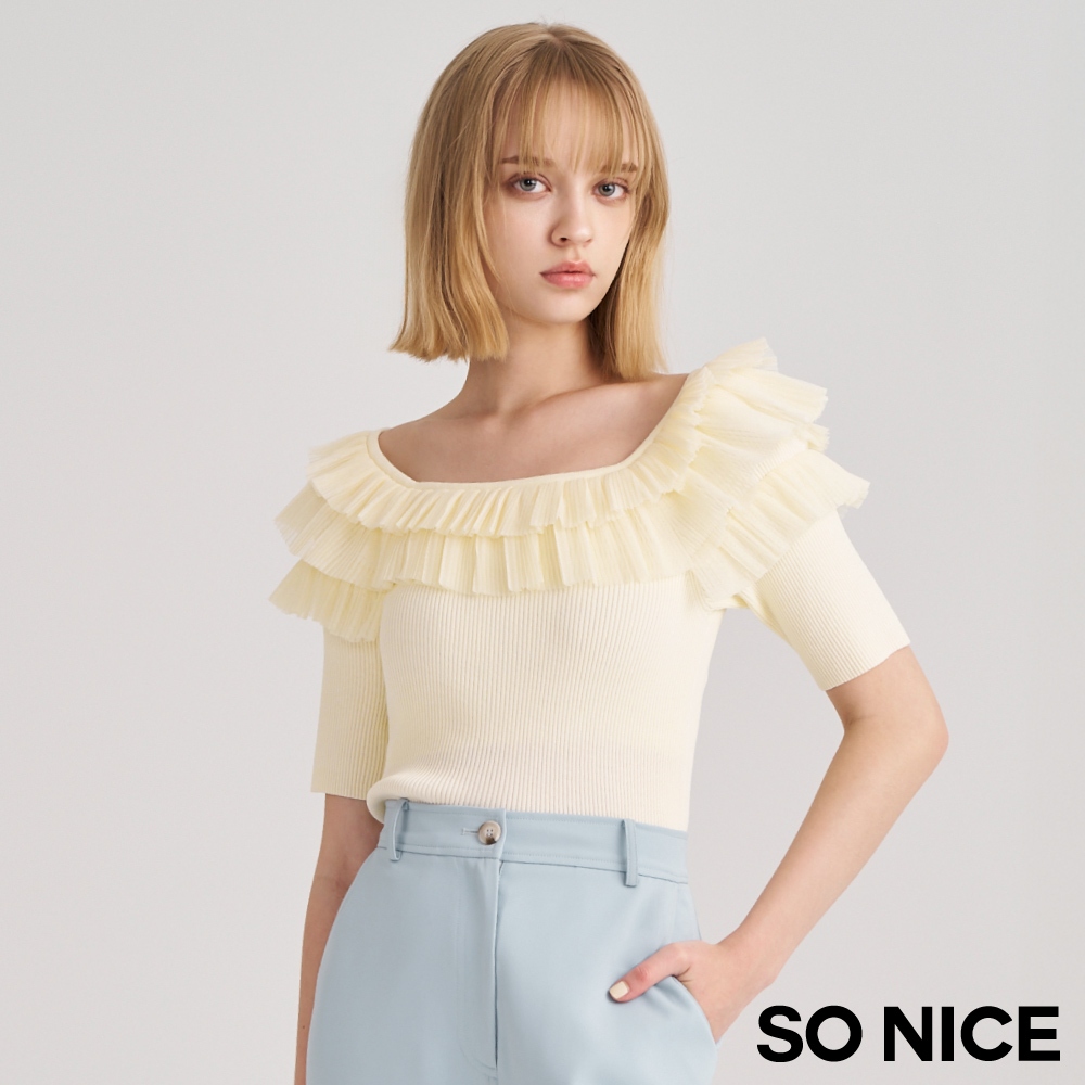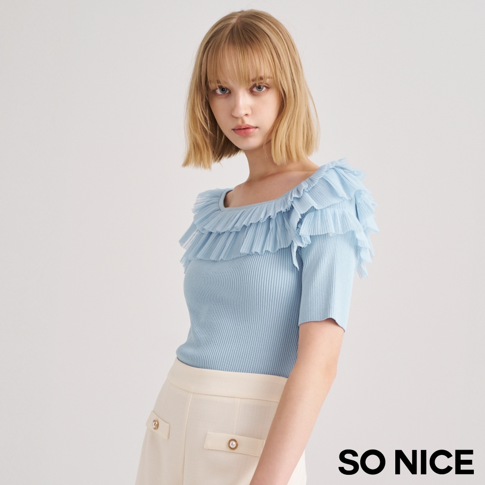 SO NICE【特惠】法式網紗壓褶荷葉領拼接針織上衣|米黃/淺藍|都會時尚女裝 【93430019】米黃,36(S)|米黃,38(M)|米黃,40(L)|淺藍,34(XS)|淺藍,36(S)|淺藍,38(M)|淺藍,40(L)|米黃,34(XS)SO NICE 官方旗艦店