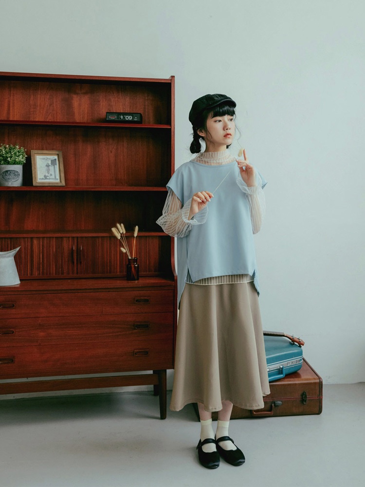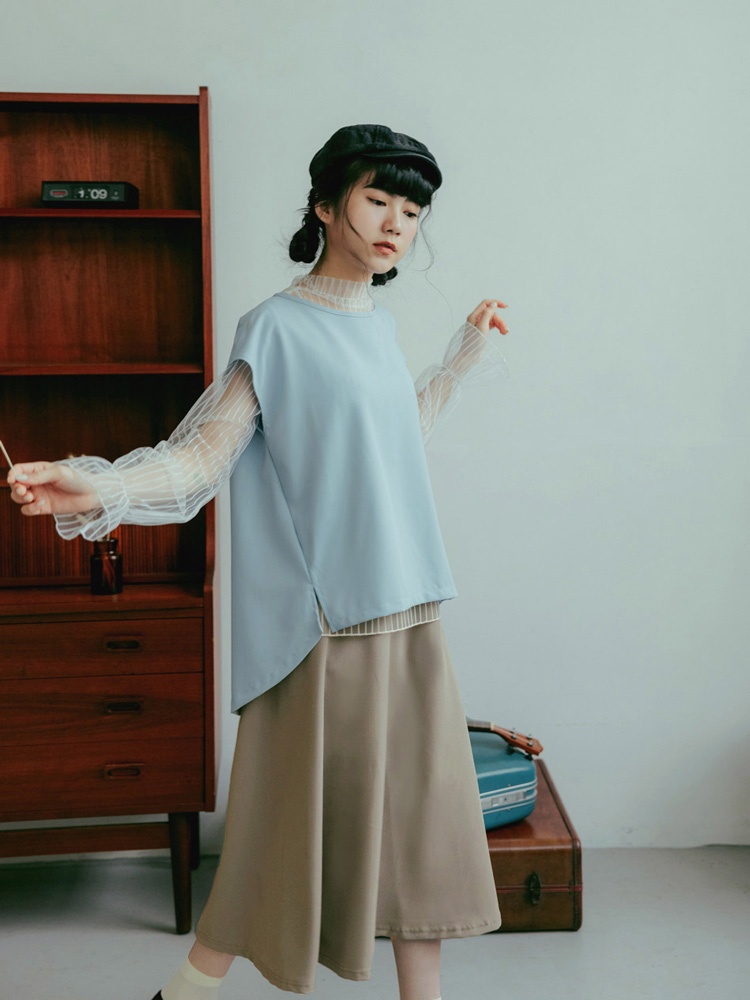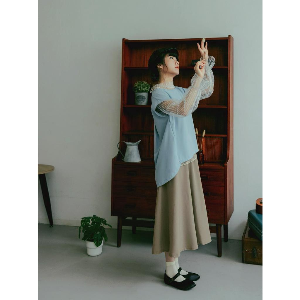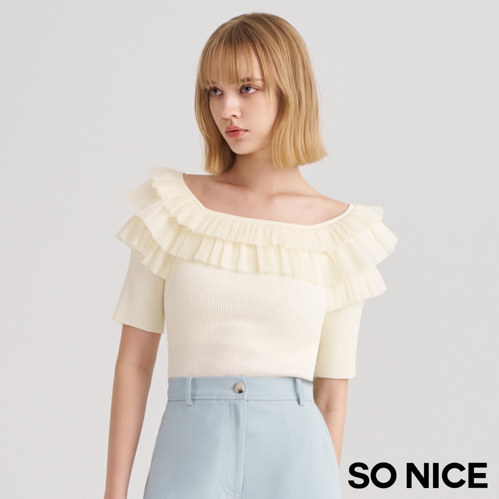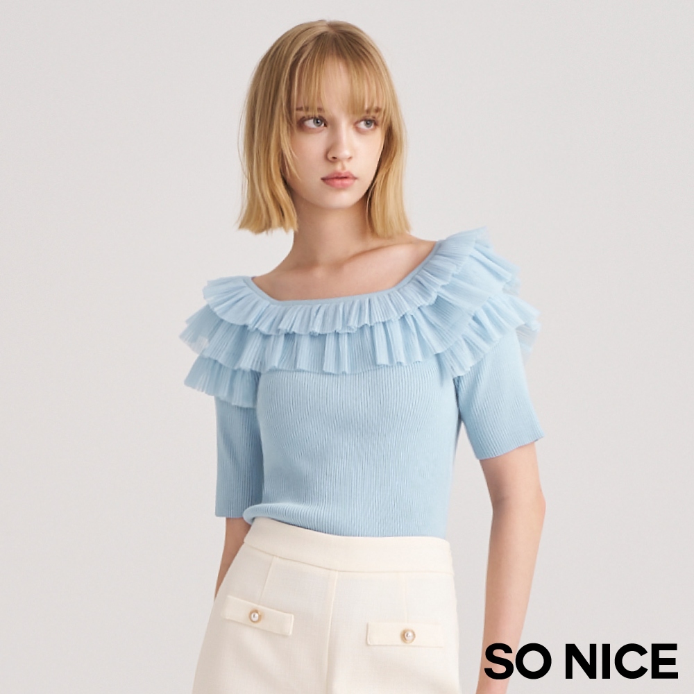 SO NICE【特惠】法式網紗壓褶荷葉領拼接針織上衣|米黃/淺藍|都會時尚女裝 【93430019】米黃,36(S)|米黃,38(M)|米黃,40(L)|淺藍,34(XS)|淺藍,36(S)|淺藍,38(M)|淺藍,40(L)|米黃,34(XS)SO NICE 官方旗艦店