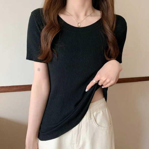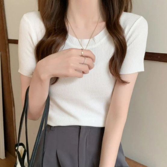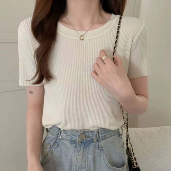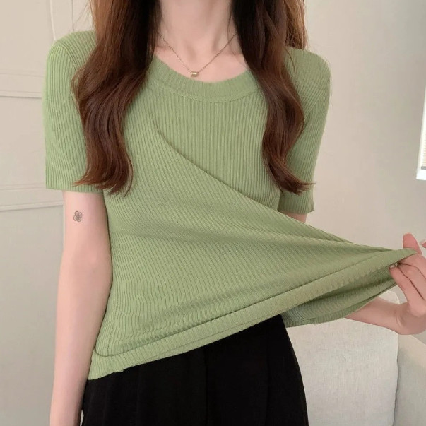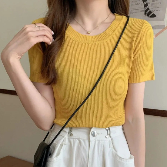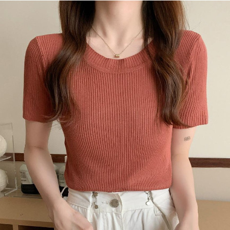 【ohi】百搭溫柔針織短版短袖上衣 短袖t恤 顯瘦上衣 針織上衣 短T 女裝GWH3027黑色|白色|卡其|杏色|黃色|橘色|磚紅|果綠|粉色|霧藍T-shirtsOHI衣著