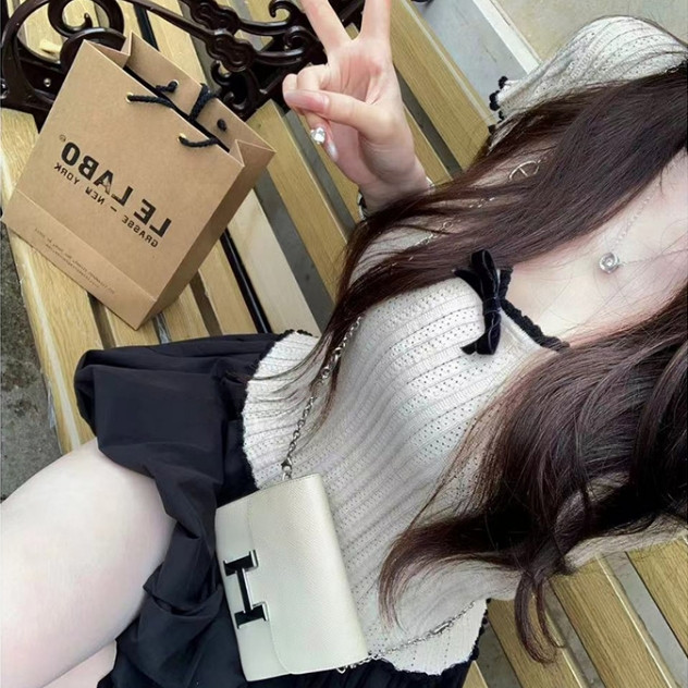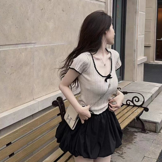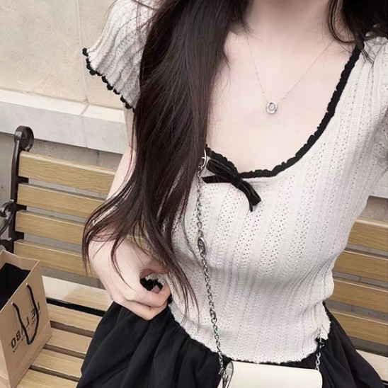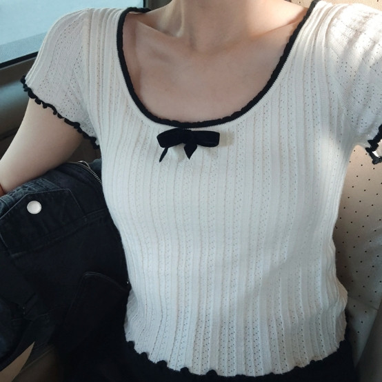 【ohi】美式正肩撞色花邊蝴蝶結短袖T恤 辣妹短款上衣 女生上衣 針織上衣 女裝 顯瘦上衣 韓版上衣 GWD5755白色,均碼-F(40-65KG可穿)|杏色,均碼-F(40-65KG可穿)OthersOHI衣著