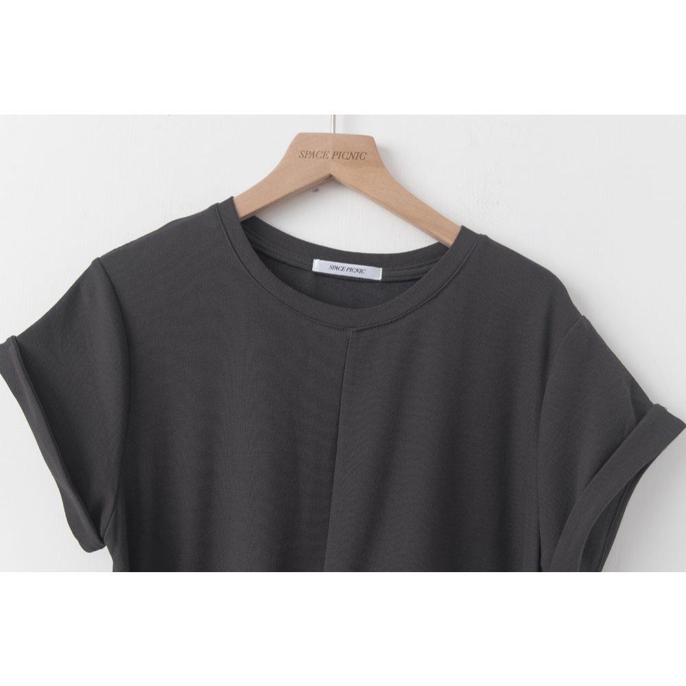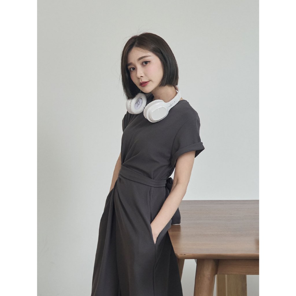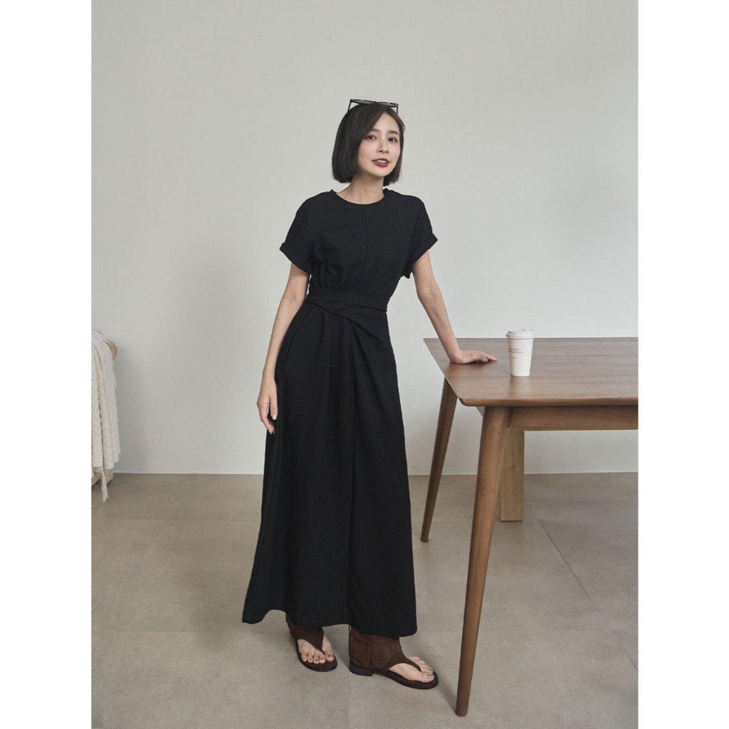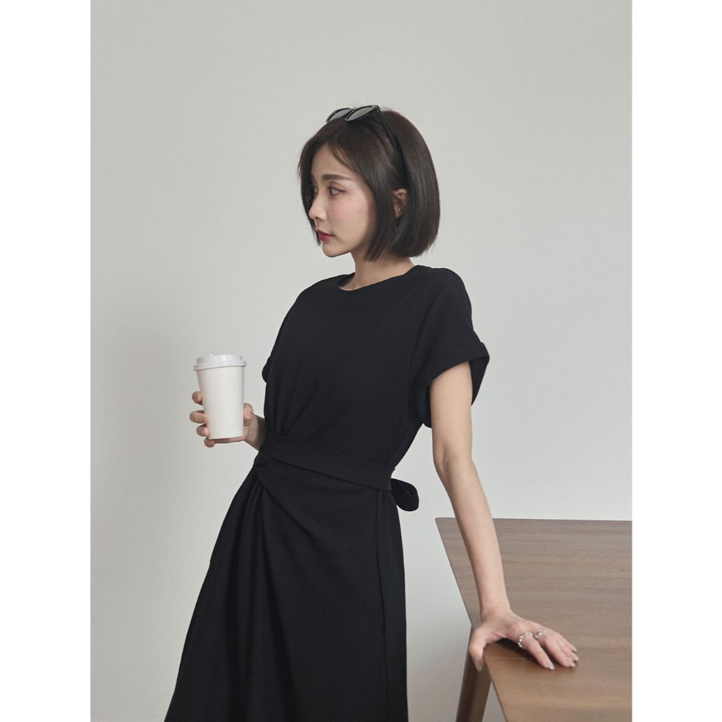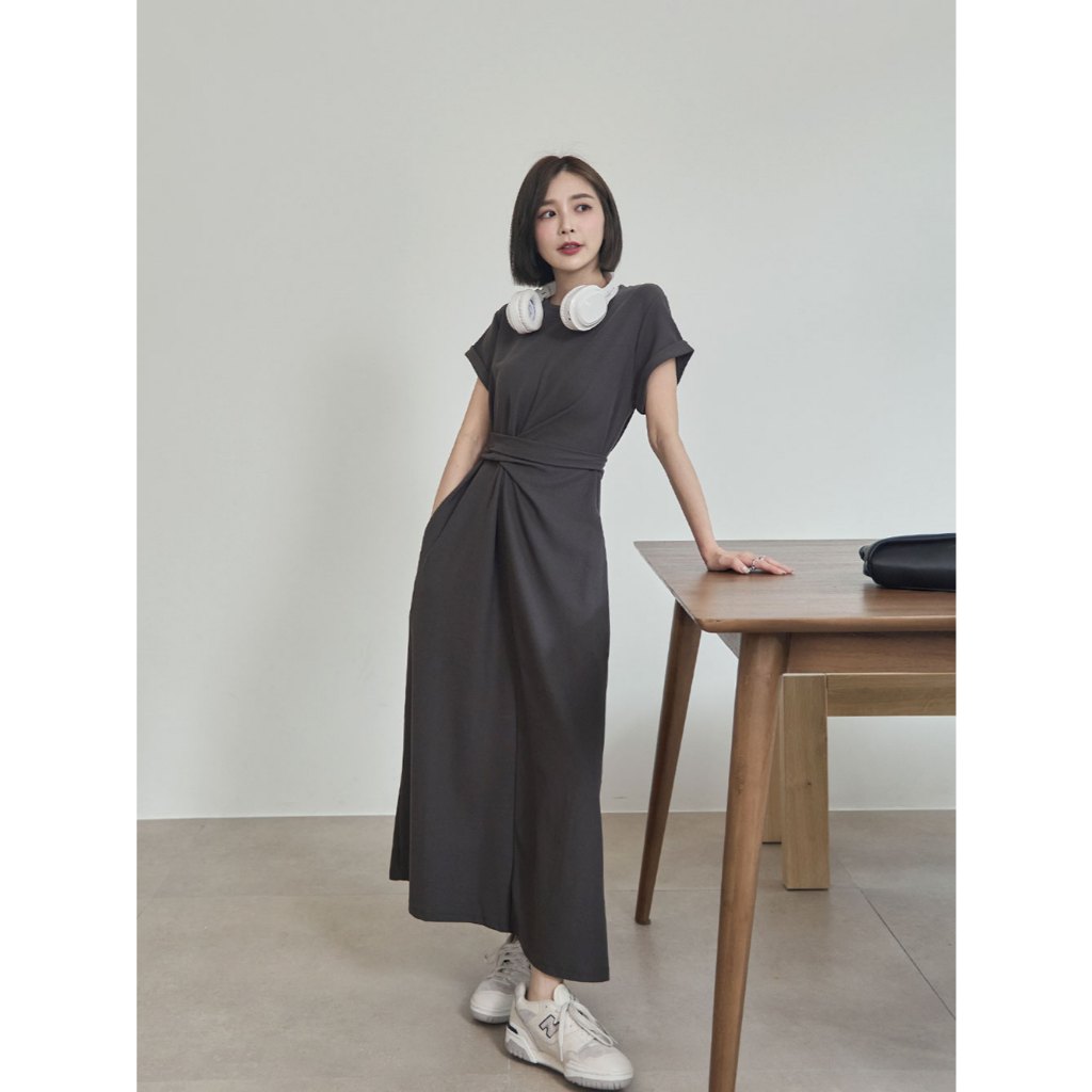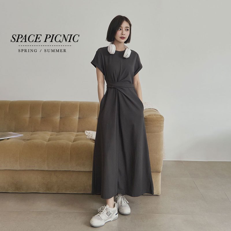Space Picnic|抓皺綁繩短袖洋裝-3色【2506325】黑|深灰|花灰Space Picnic