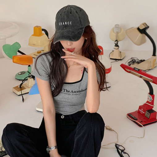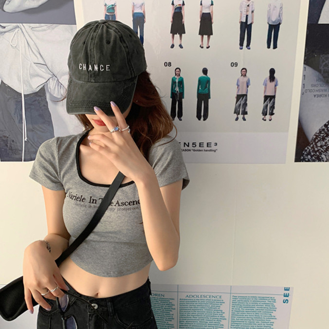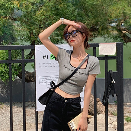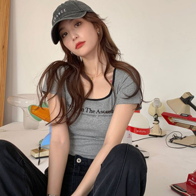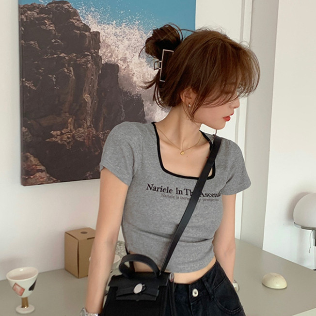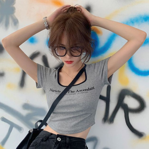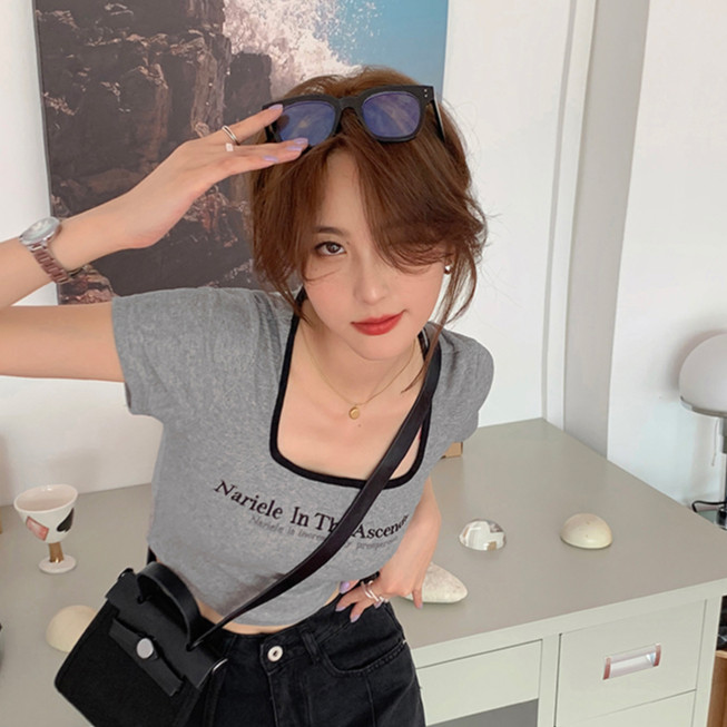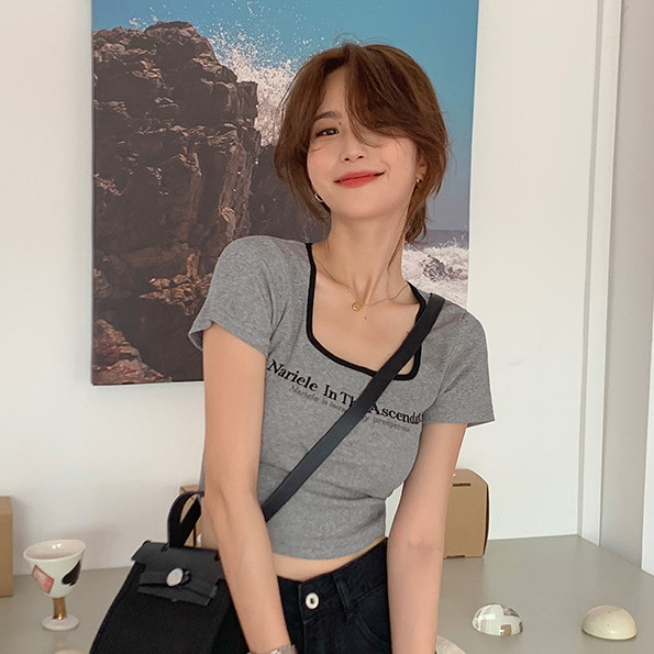 【ohi】方領T恤女裝夏季辣妹修身短袖 短款 t恤 印花 短袖T恤 短T 韓版上衣 女生衣著短袖上衣GTM8309灰色,XL|灰色,S|灰色,M|灰色,LT-shirtsOHI衣著