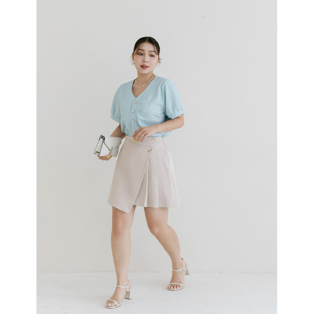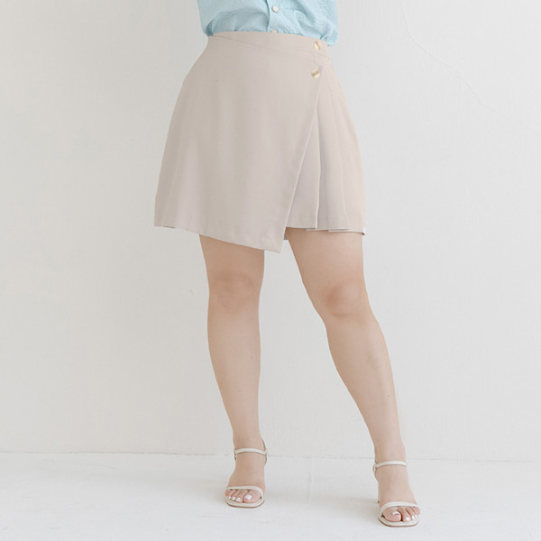【PolyLulu】 MISS.韓系設計款不規則打褶後鬆緊短裙(附褲) 中大尺碼裙 灰杏色L|XL|2XL|3XLPOLY LULU丨BEAUTY HAS NO SIZE 中大尺碼女裝