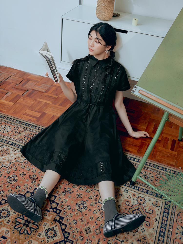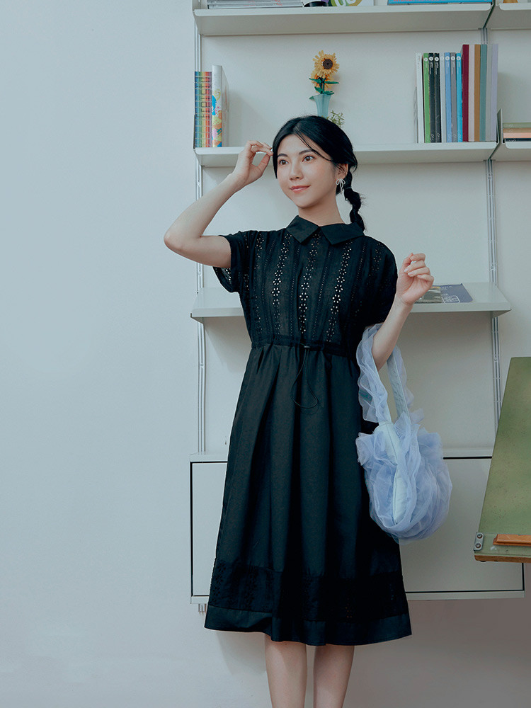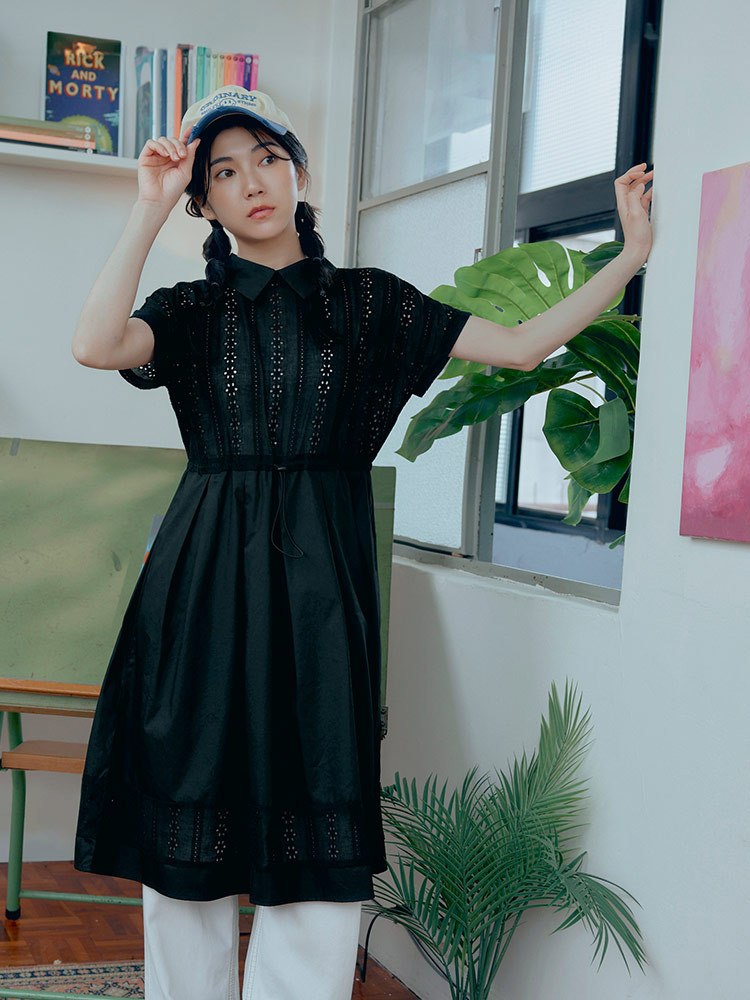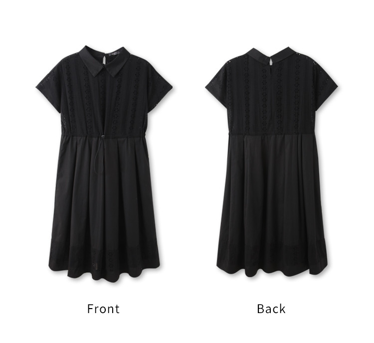OB嚴選 日系純棉拼接蕾絲腰抽繩翻領洋裝 《DA10377》黑,S|黑,M|黑,L|黑,XL|黑,2L|黑,3LOB嚴選官方旗艦店