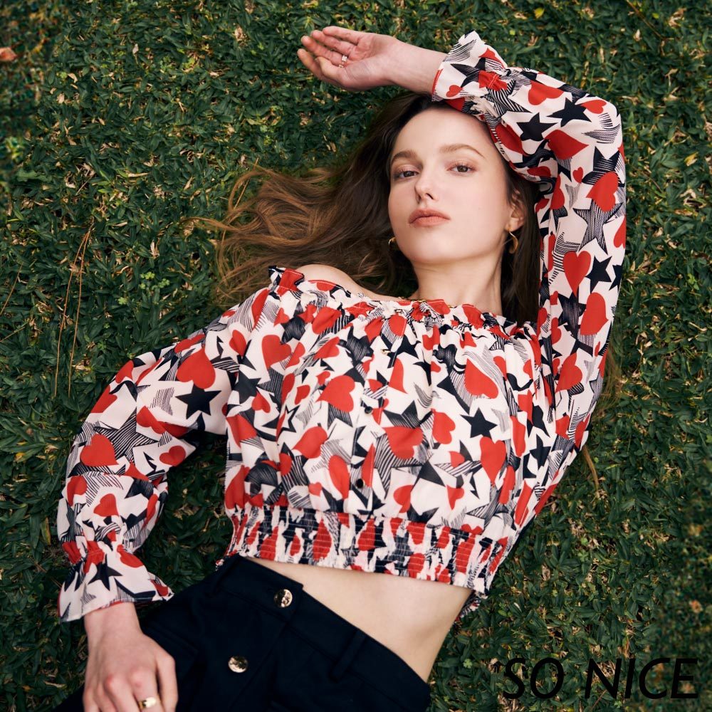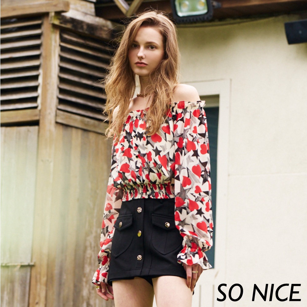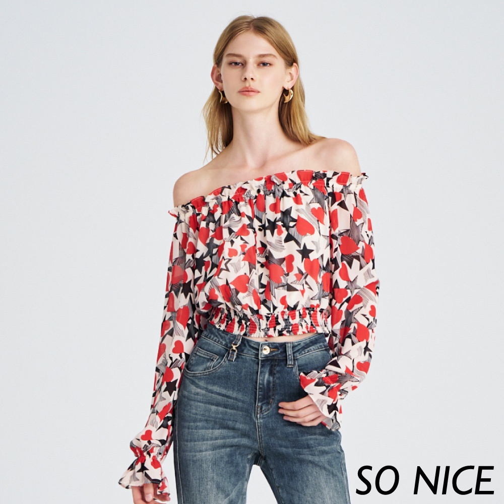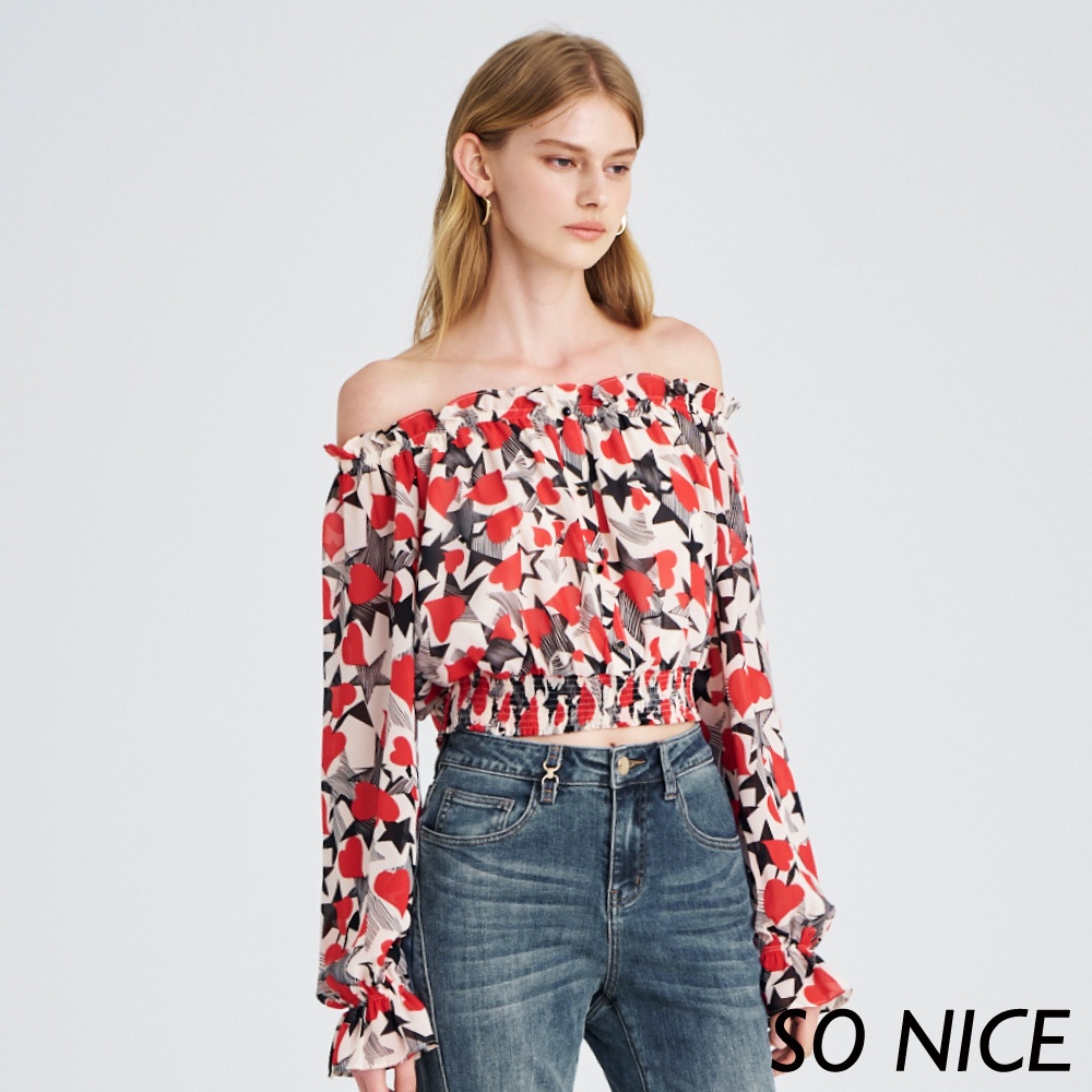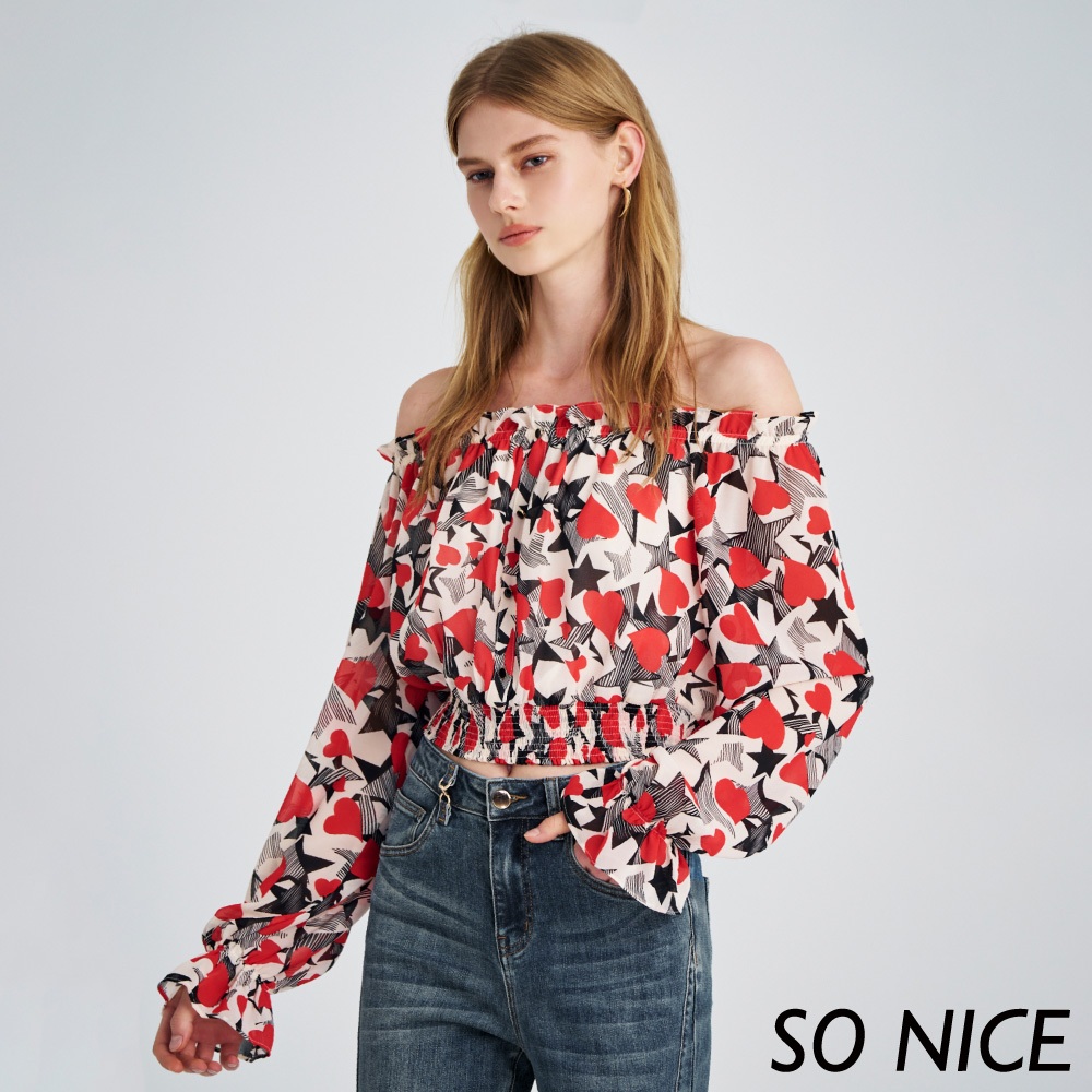 SO NICE【特惠】愛心印花一字領縮腰雪紡上衣|都會時尚女裝 【29431008】紅,38(M)|紅,40(L)|紅,34(XS)|紅,36(S)OthersSO NICE 官方旗艦店