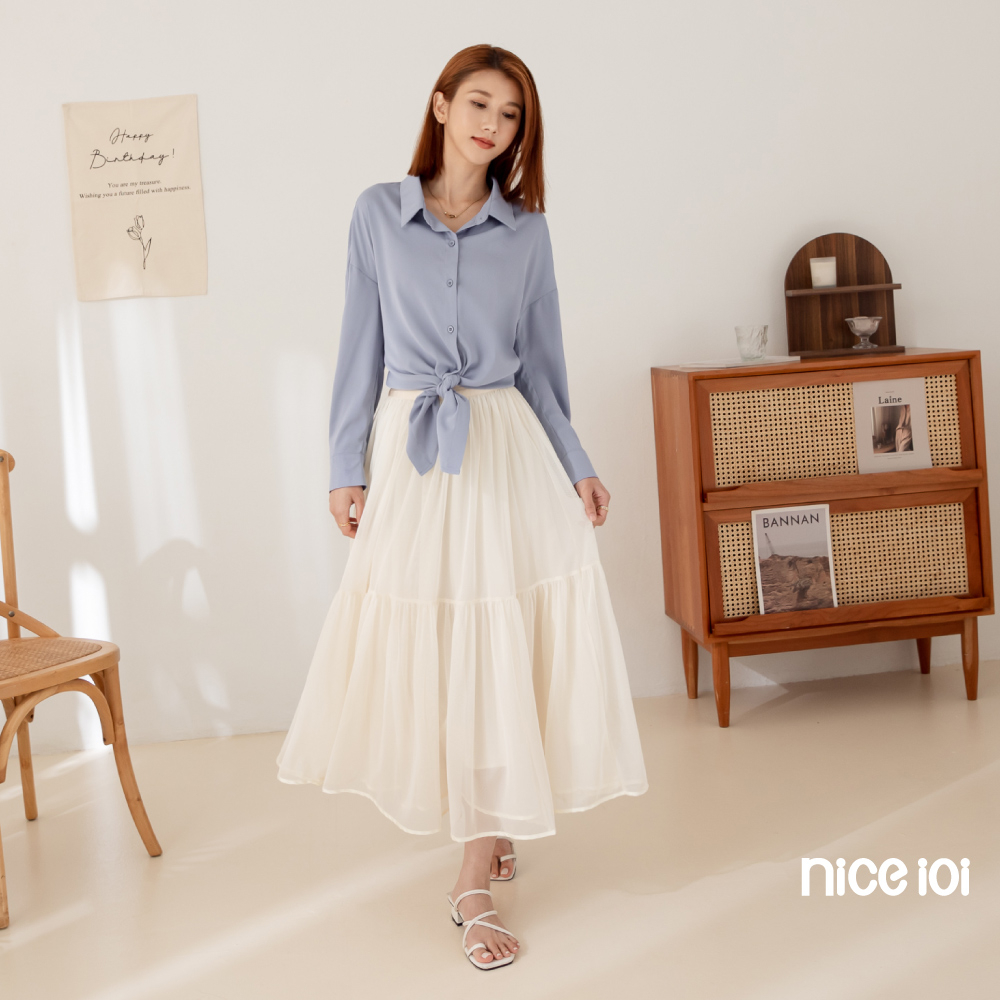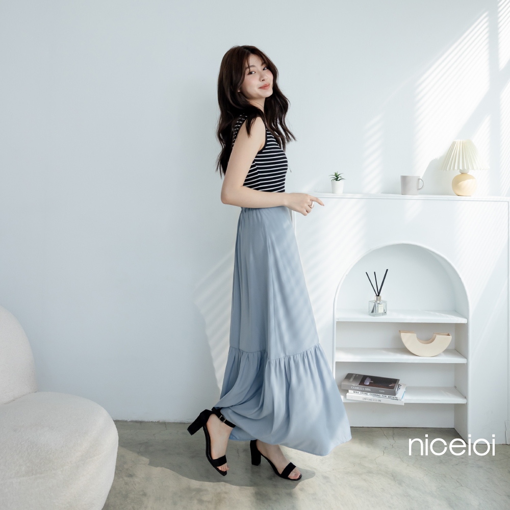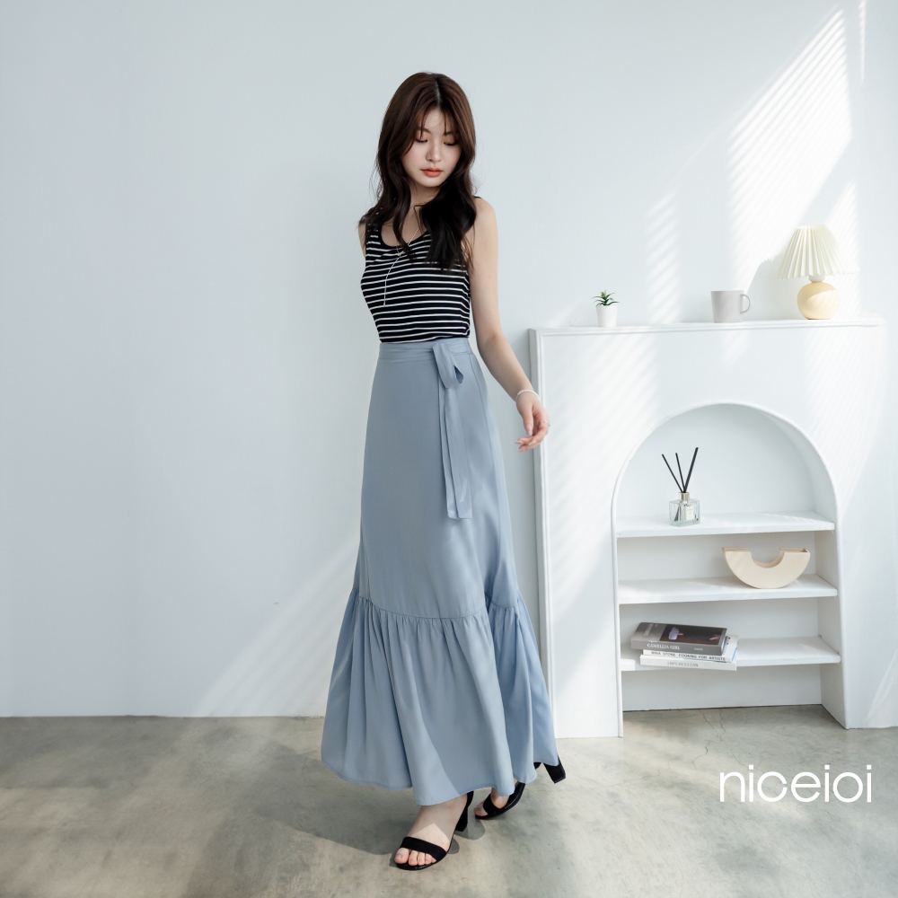 niceioi【特惠】長裙 荷葉下擺 綁帶長裙 藍色 [俏麗綁帶後鬆緊荷葉邊長裙] 女裝藍,S|藍,M|藍,L|藍,XLniceioi 官方旗艦店