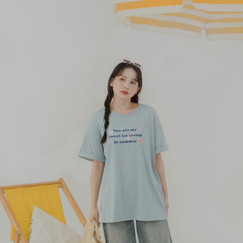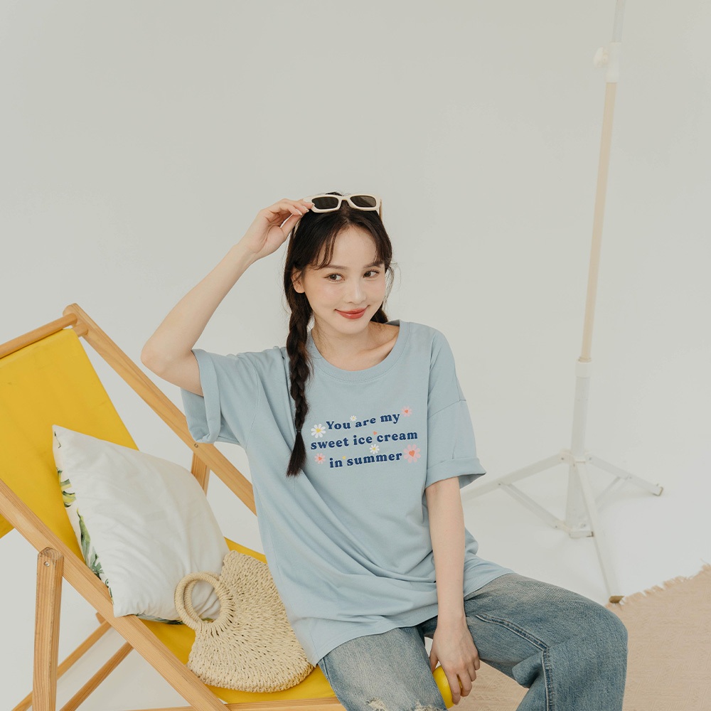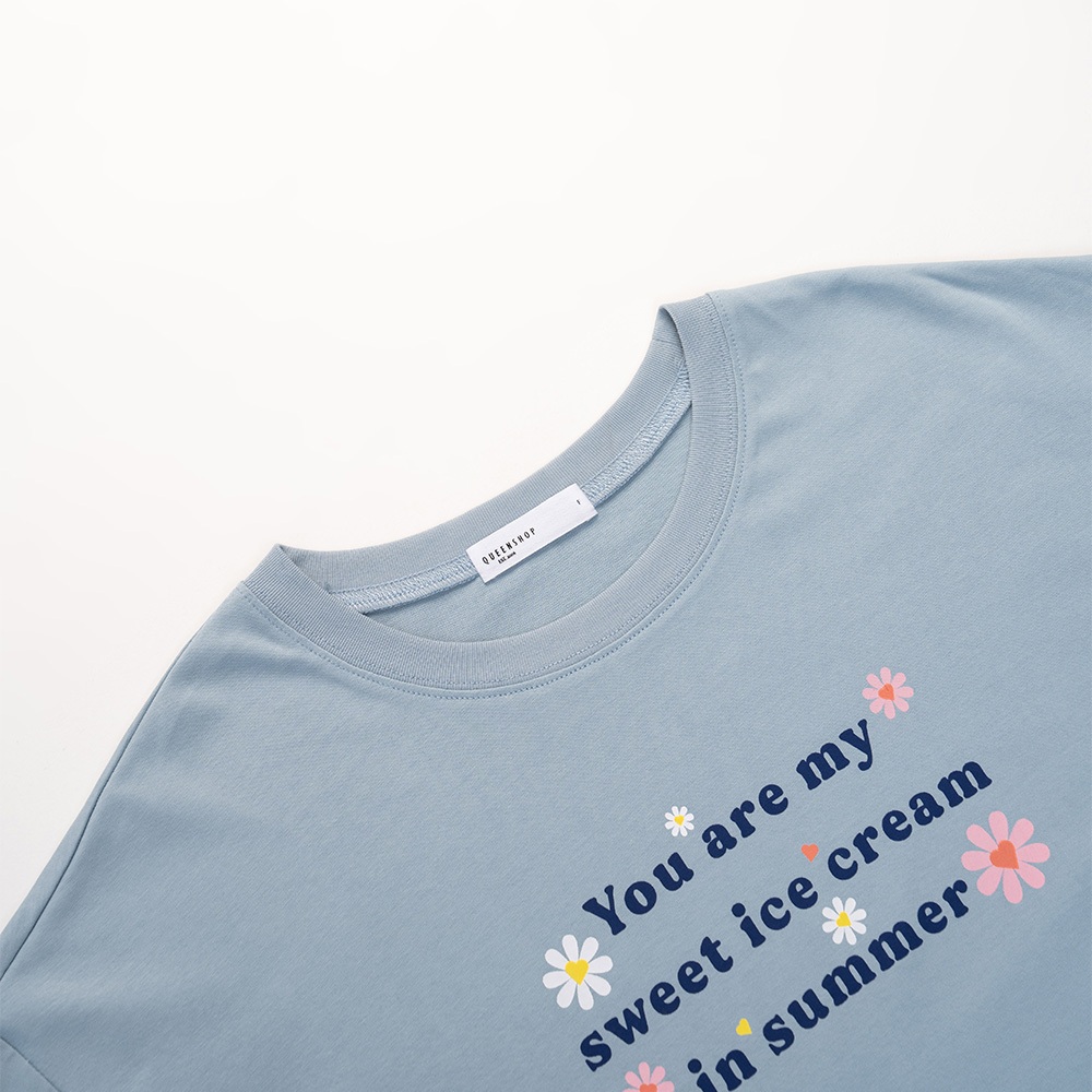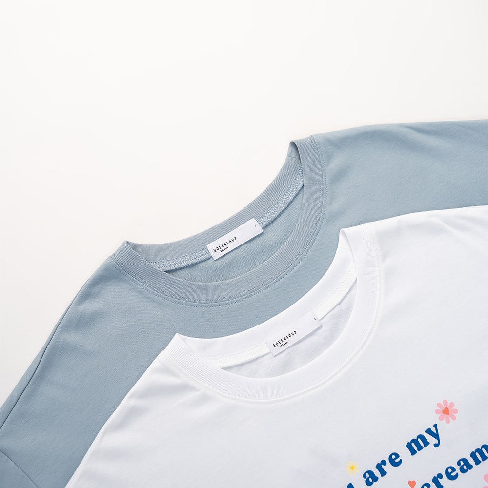 QUEENSHOP_ S 女裝 短袖 涼感小花印字寬版上衣 兩色售 現+預 【01190235】白|藍T-shirtsQUEENSHOP