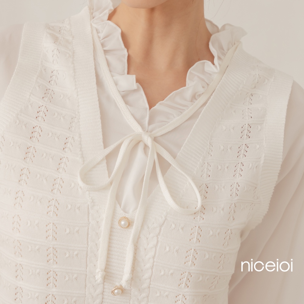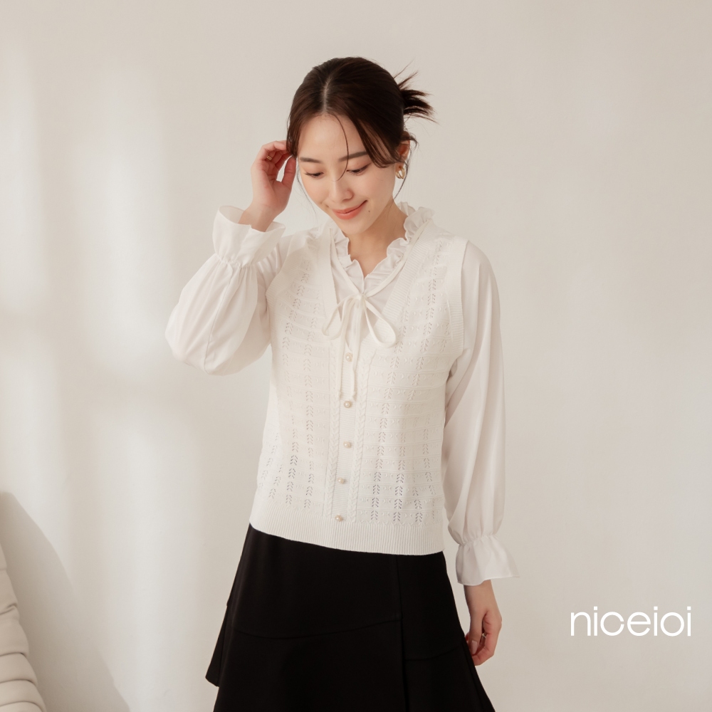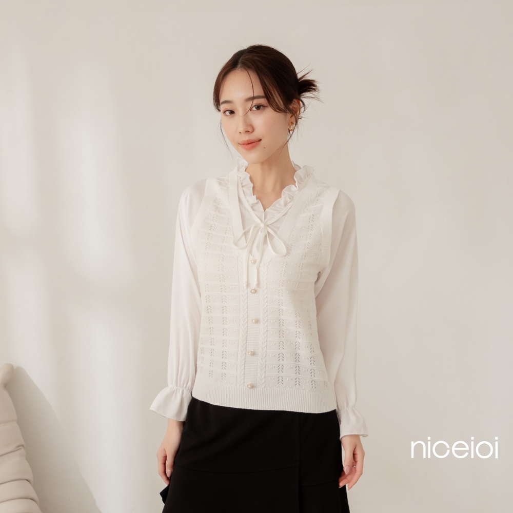 niceioi【特惠】秀氣荷葉綁帶珍珠針織背心假兩件上衣 女裝白,FShirts & Blousesniceioi 官方旗艦店