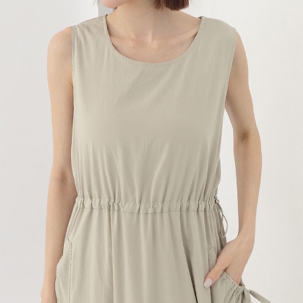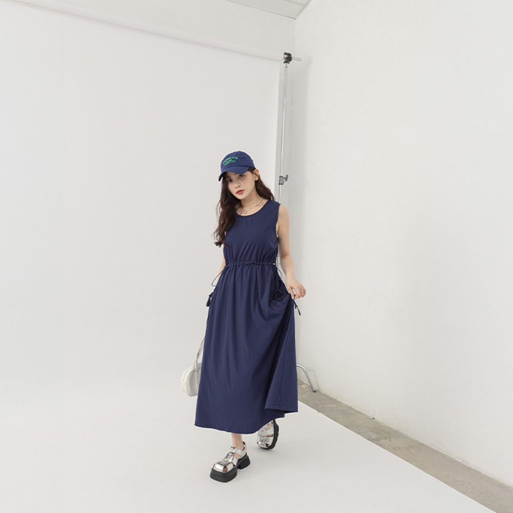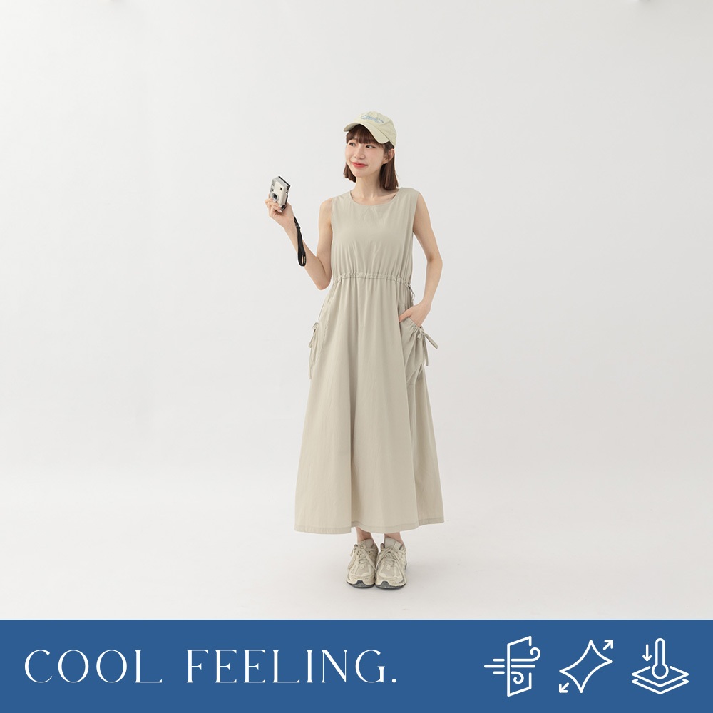 QUEENSHOP_ S 女裝 涼感抽繩大口袋無袖長洋裝 兩色售 現+預 【01087094】深藍|卡其QUEENSHOP
