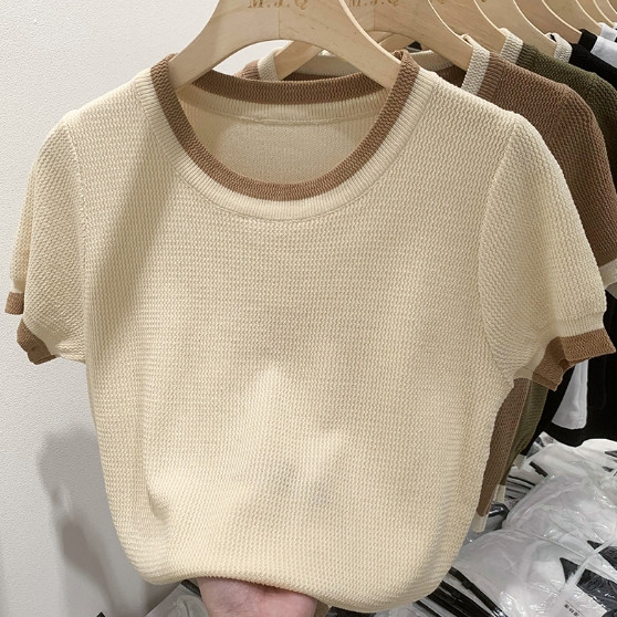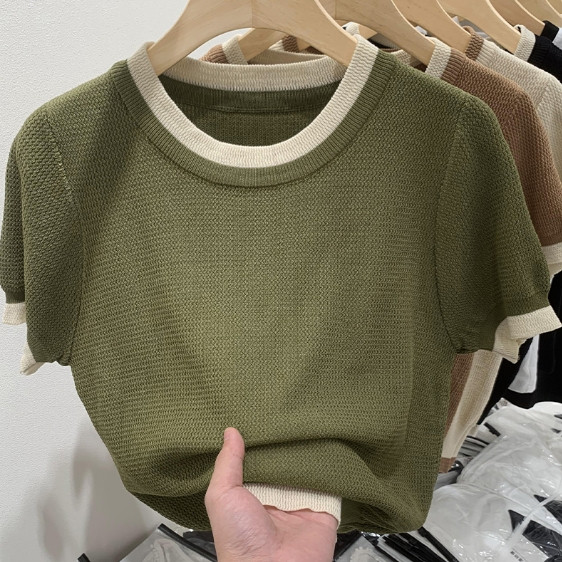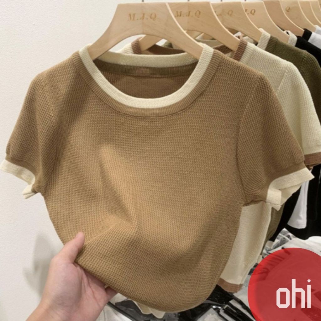 【ohi】純色針織短袖T恤 撞色法式圓領正肩上衣 女生上衣 針織上衣 女裝 顯瘦上衣 韓版上衣 GWH10586杏色,均碼-F(40-65KG可穿)|綠色,均碼-F(40-65KG可穿)|卡其色,均碼-F(40-65KG可穿)OthersOHI衣著
