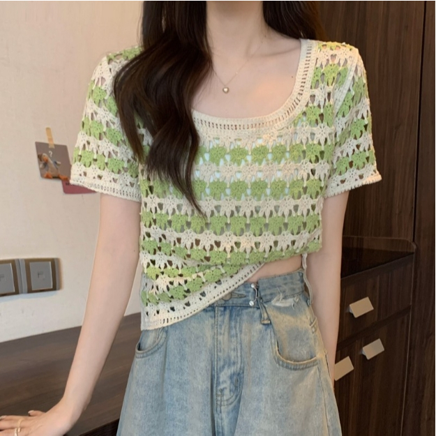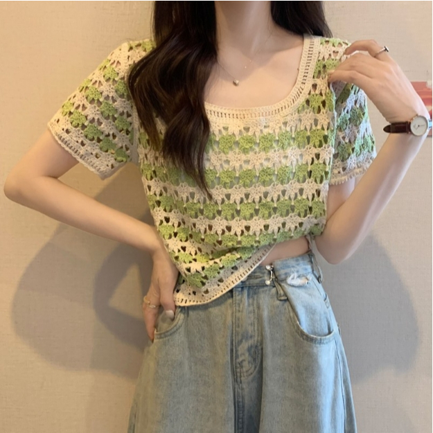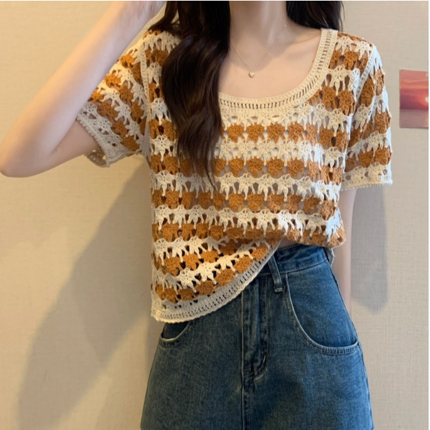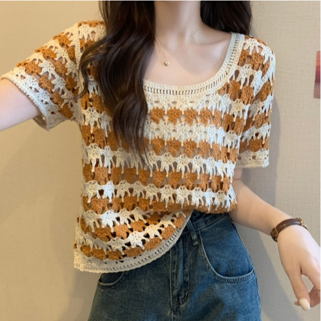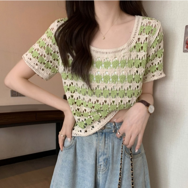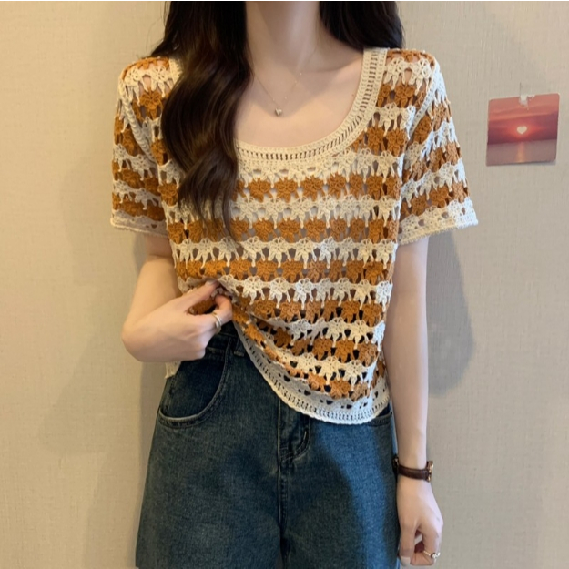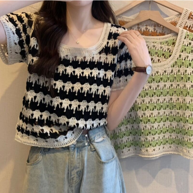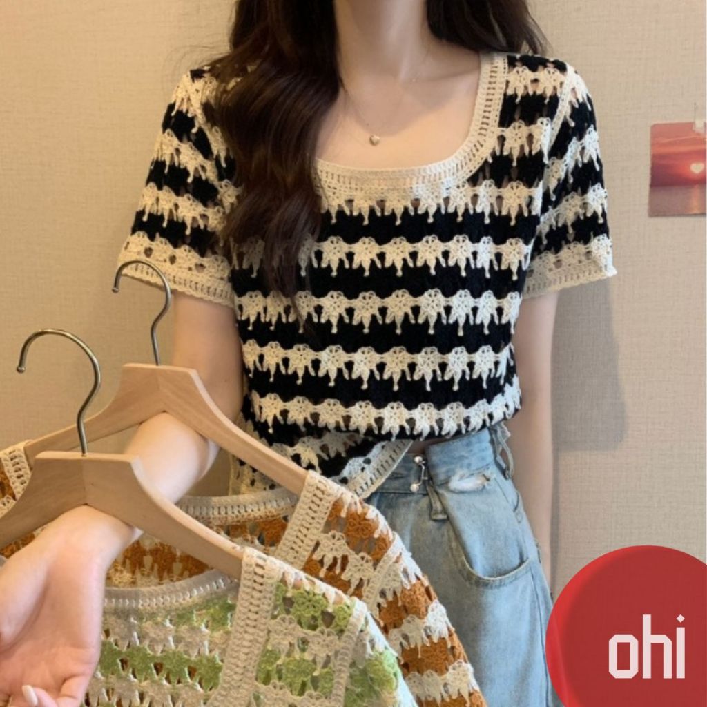 【ohi】U領復古條紋短袖針織衫 縷空鈎花田園風上衣 女生上衣 針織上衣 女裝 顯瘦上衣 韓版上衣 GWD3578黑色,F碼(40-65KG可穿)|淺綠色,F碼(40-65KG可穿)|橘色,F碼(40-65KG可穿)OthersOHI衣著