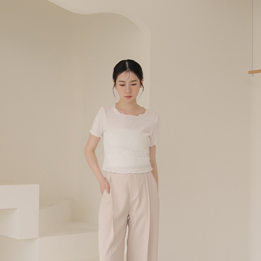 QUEENSHOP_ S 女裝 短袖 皺皺紋理木耳邊造型短版上衣-白 現+預 【01098965】