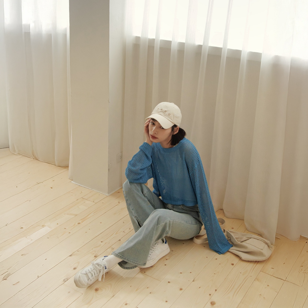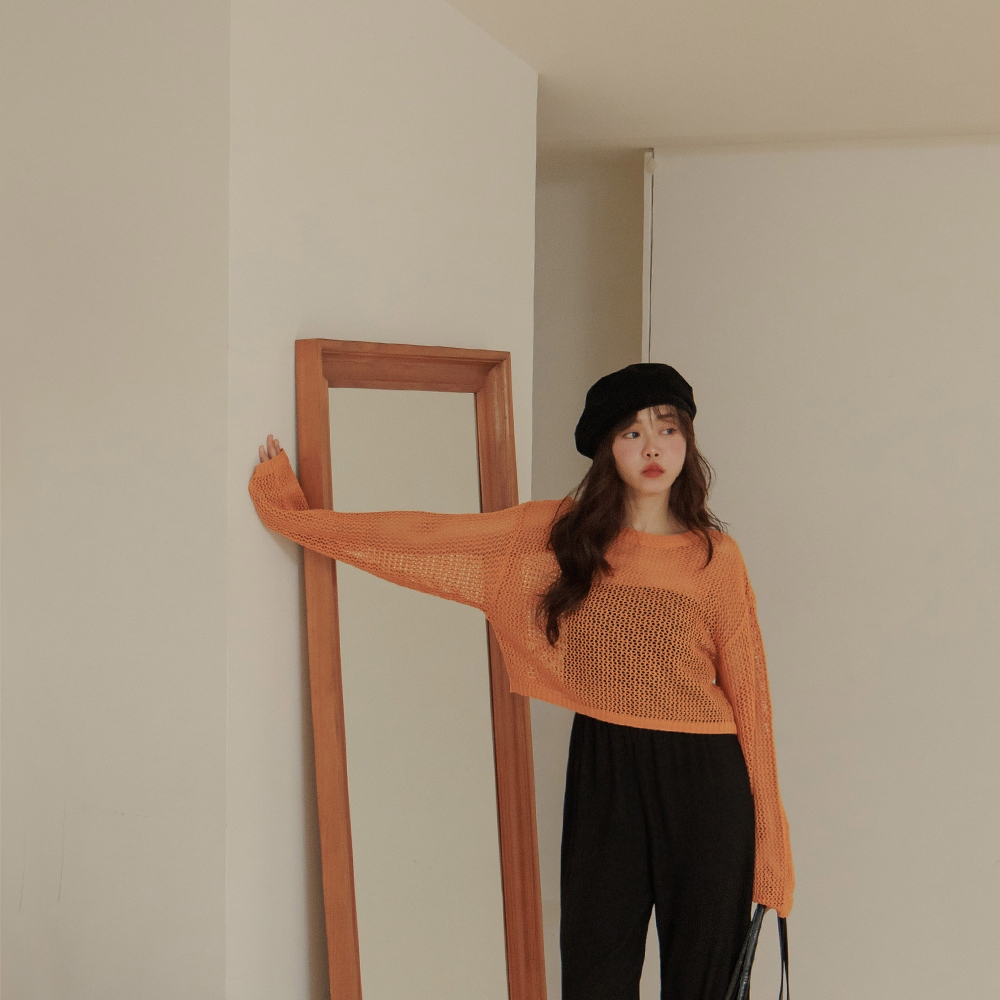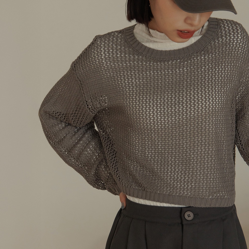 QUEENSHOP_ S 女裝 長袖 簡約鏤空洞洞針織短版上衣 四色售 現+預 【01013422】灰|藍|橘|米白QUEENSHOP