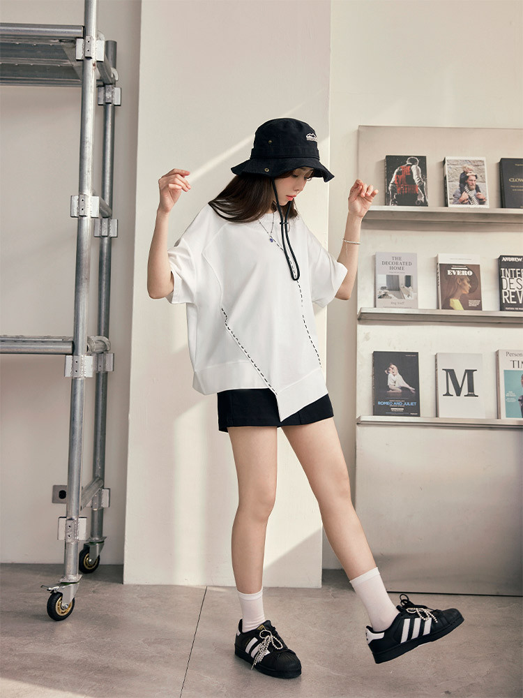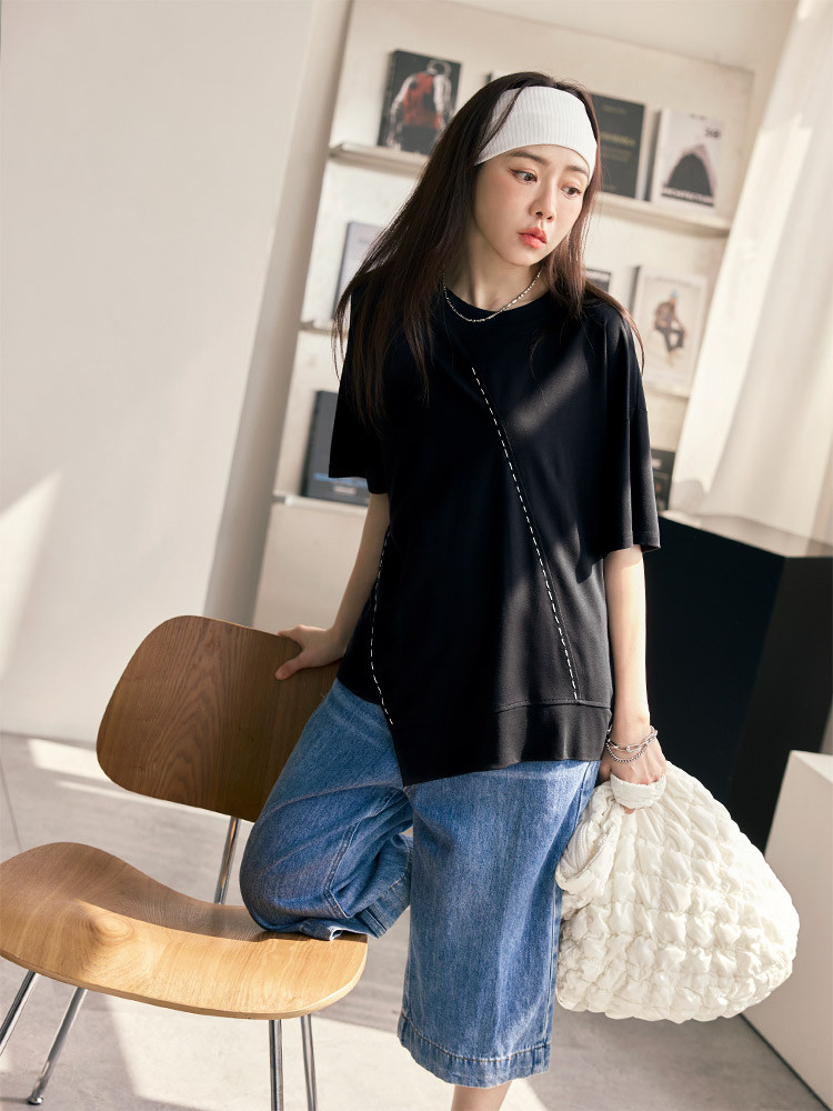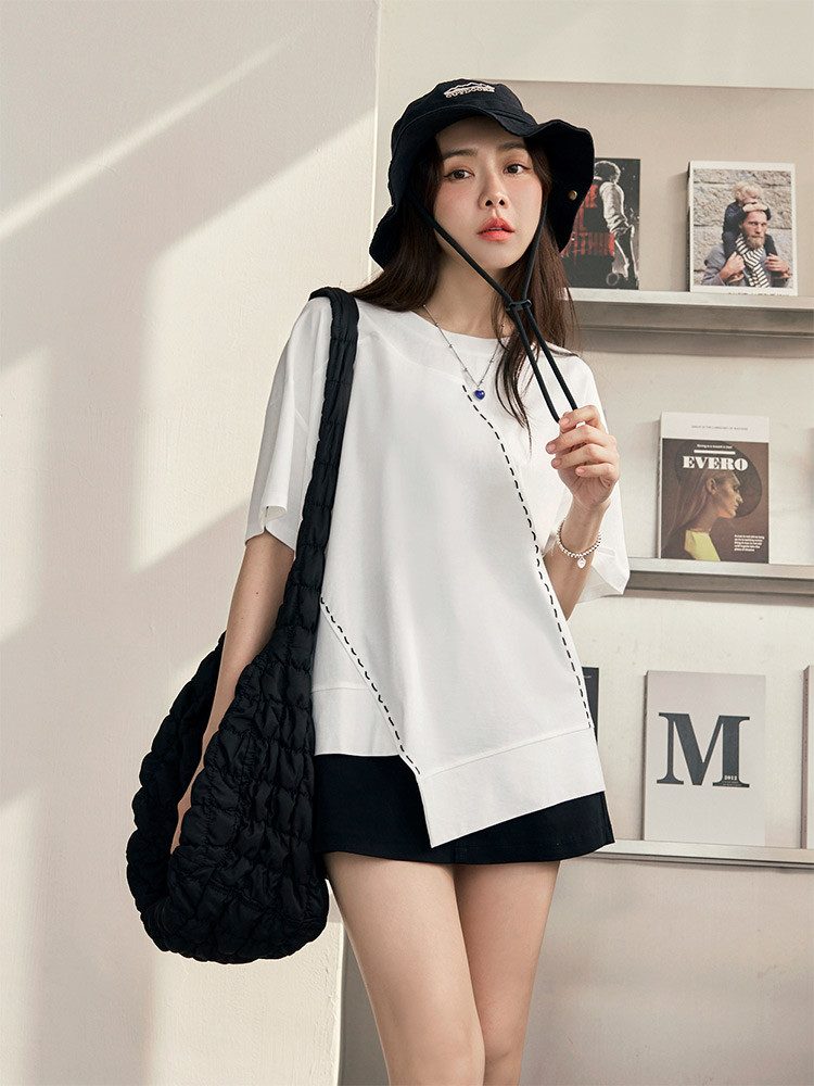 OB嚴選 撞色車線不規則下擺寬鬆上衣 《AB20296》白,F|白,3L|黑,F|黑,3LT-shirtsOB嚴選官方旗艦店