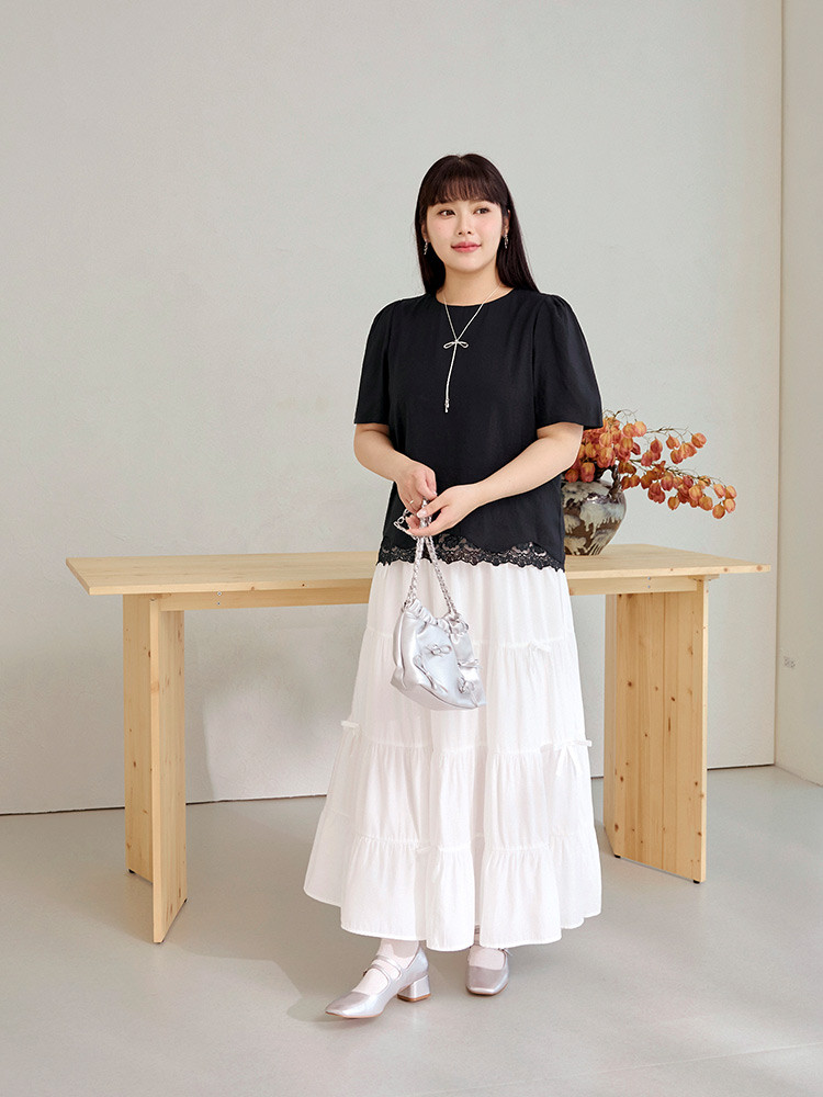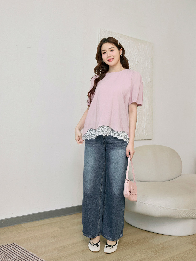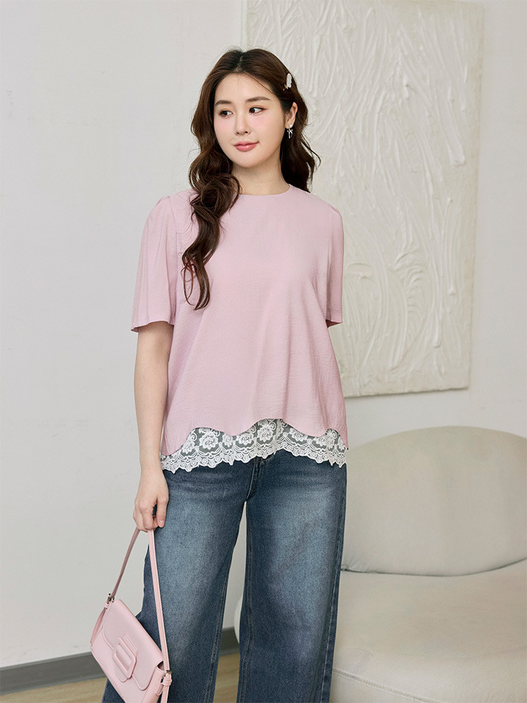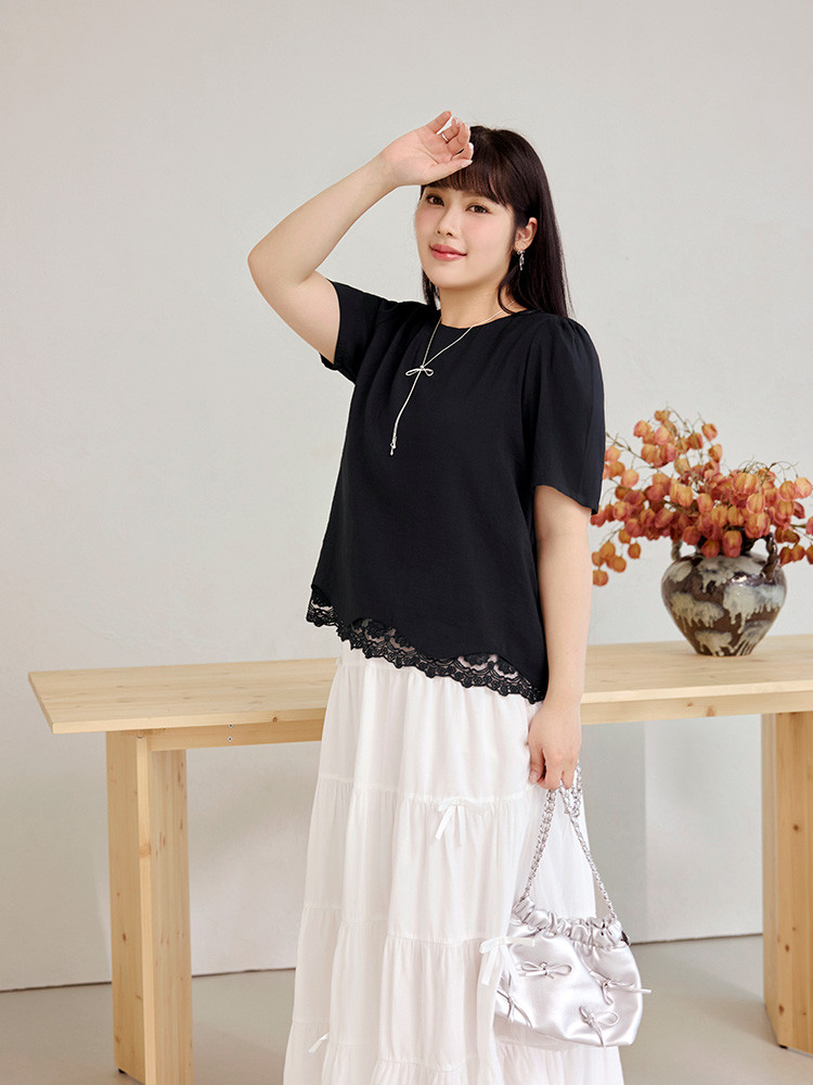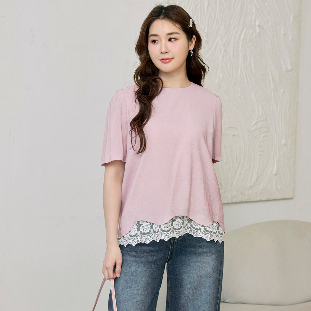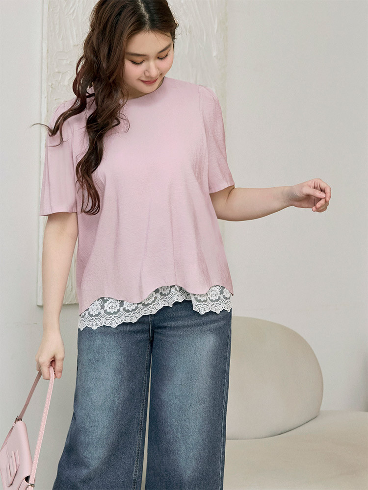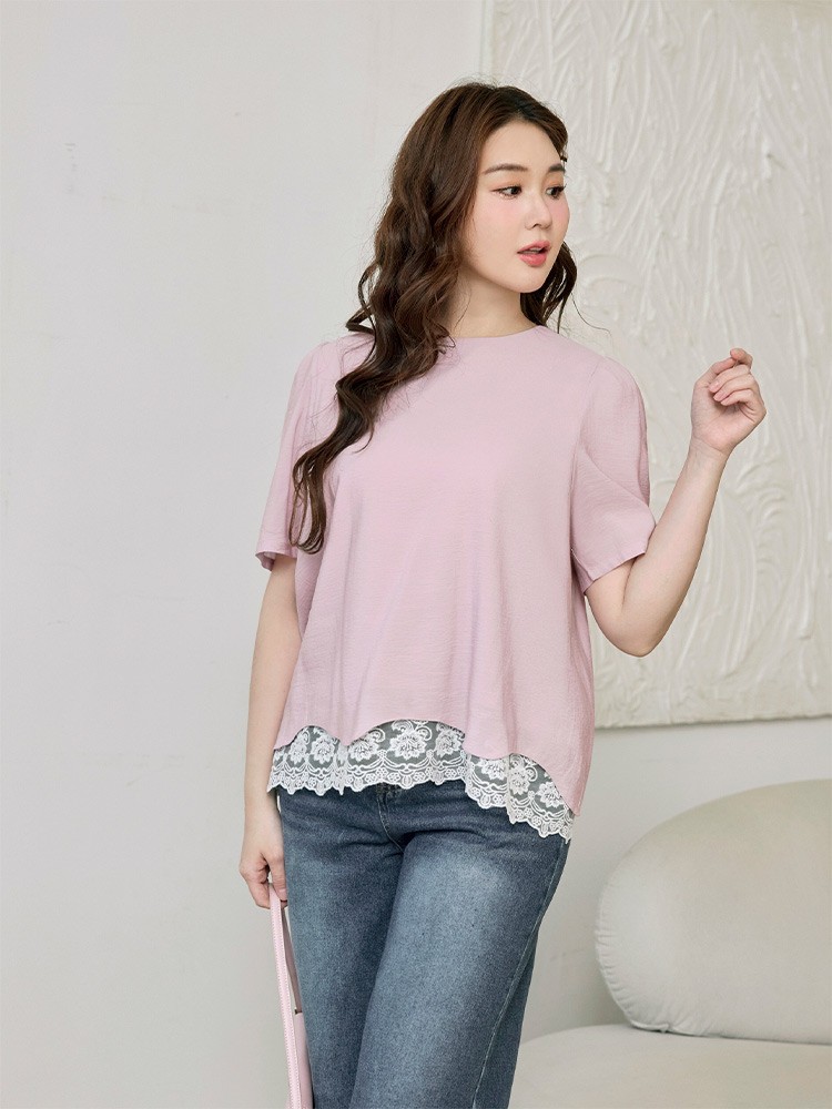 OB嚴選 雲朵自訂款-細緻蕾絲拼接寬鬆澎袖上衣 《AB20466》粉紫,XL|粉紫,2L|粉紫,3L|粉紫,4L|黑,XL|黑,2L|黑,3L|黑,4LT-shirtsOB嚴選官方旗艦店