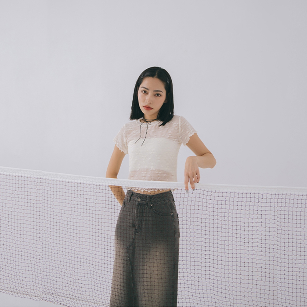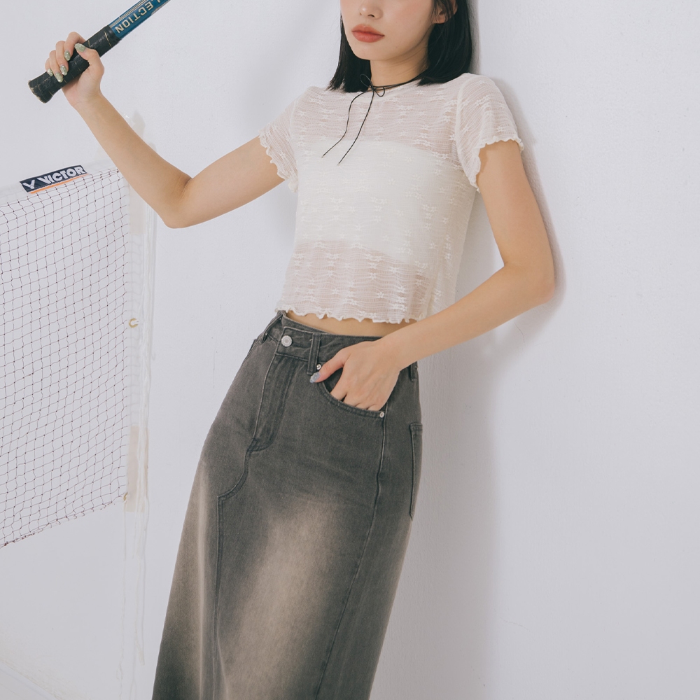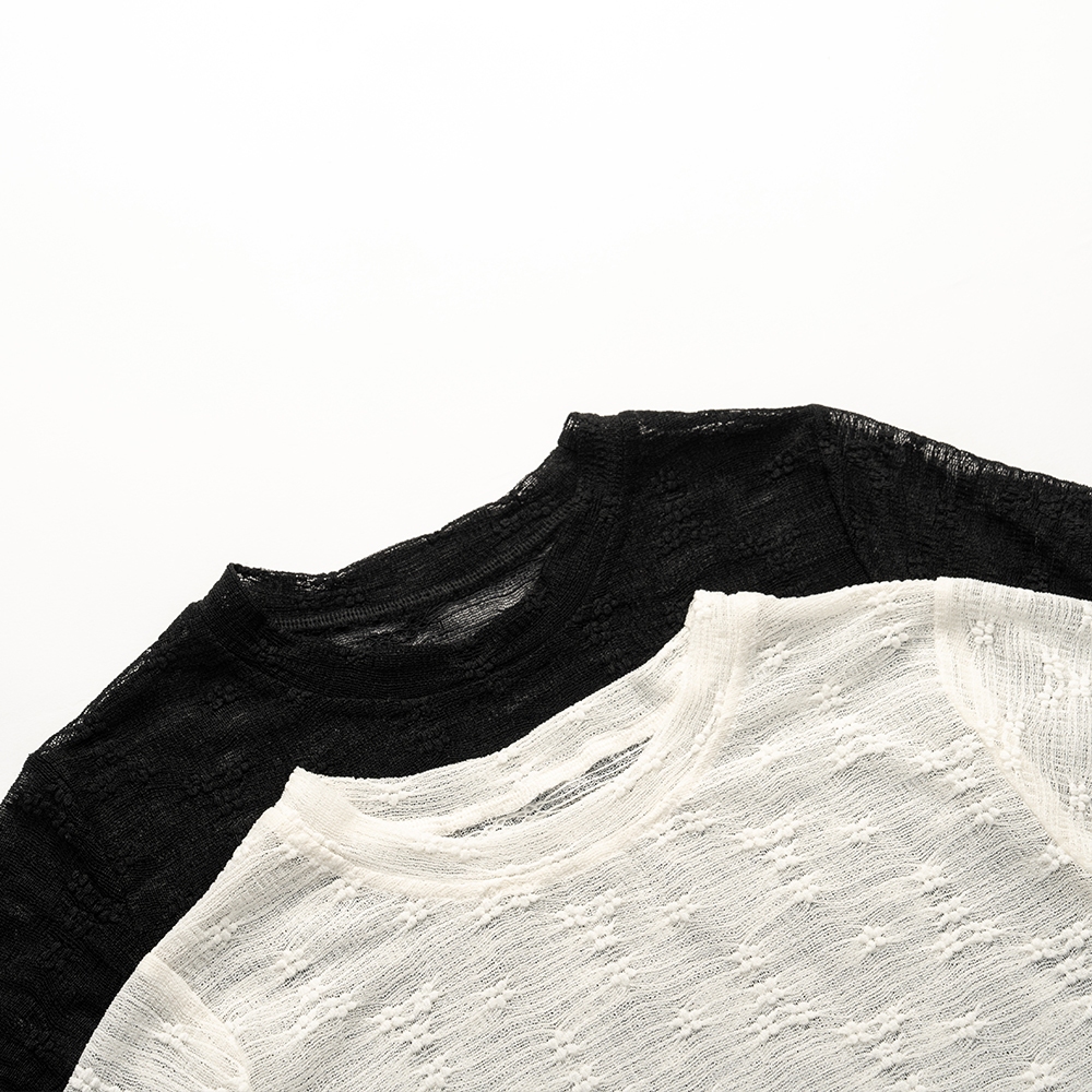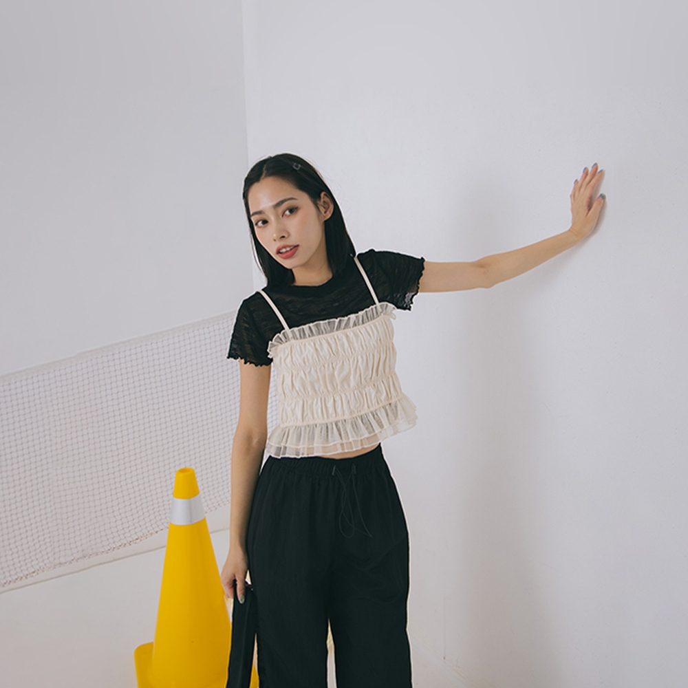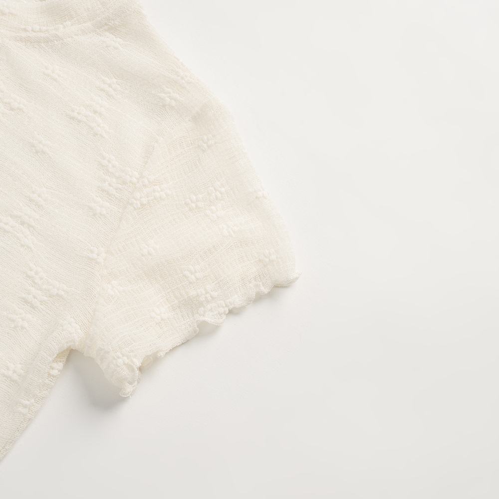 QUEENSHOP_ S 女裝 蕾絲木耳邊緹花透膚短袖上衣 兩色售 現+預 【01098790】黑|杏OthersQUEENSHOP