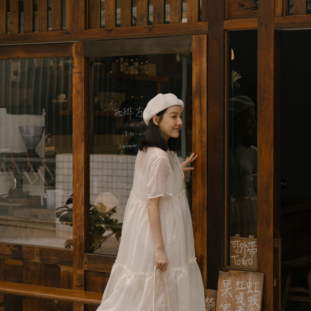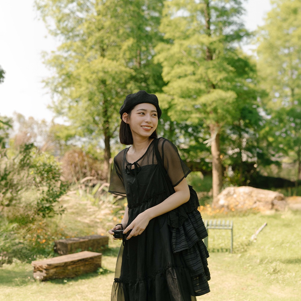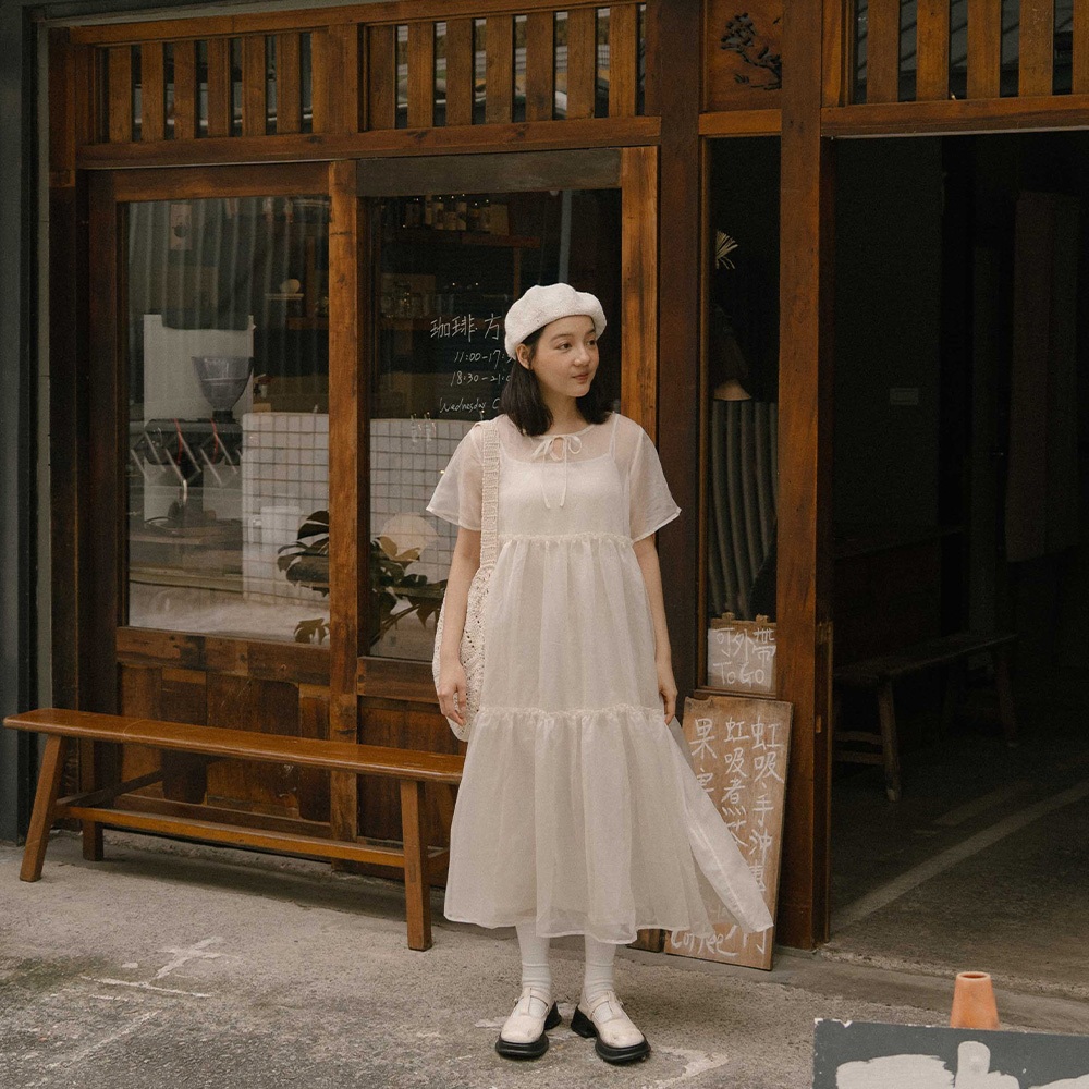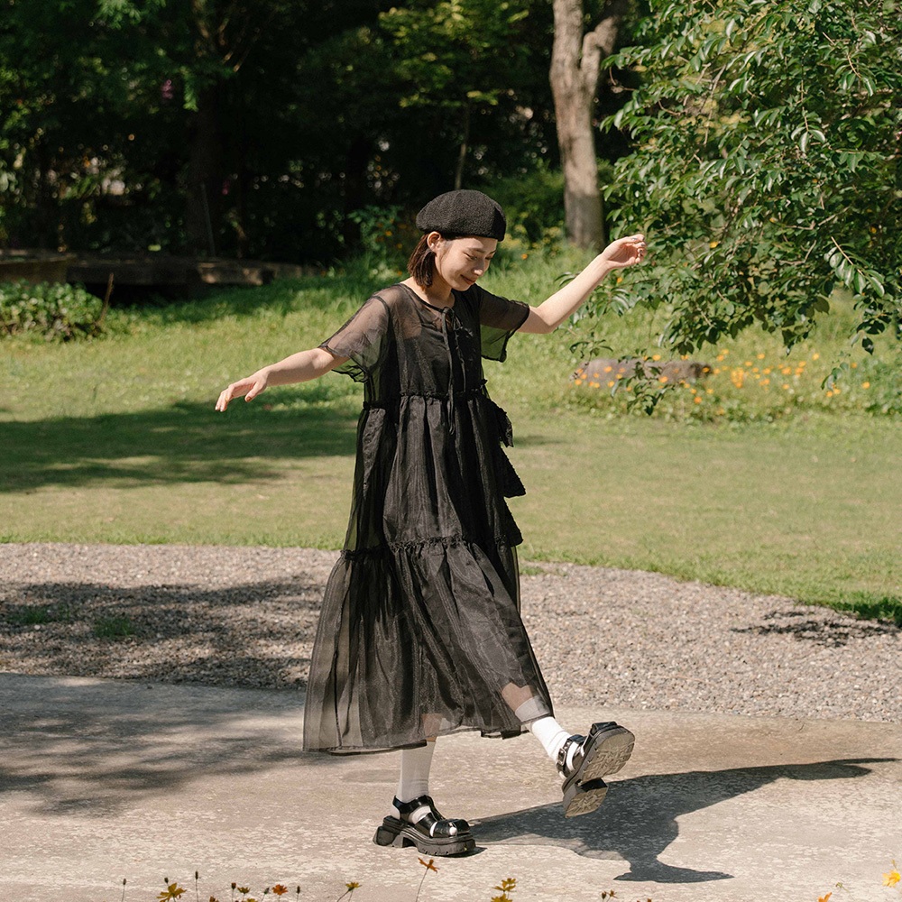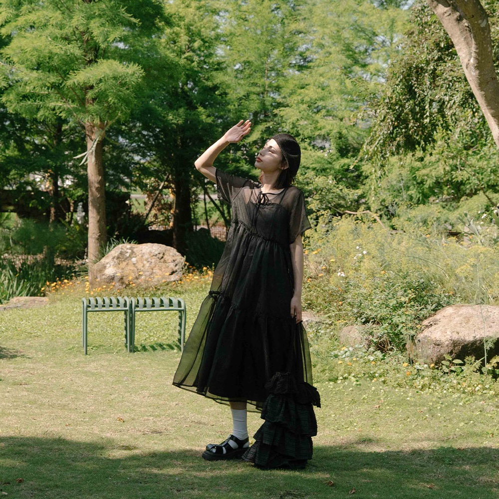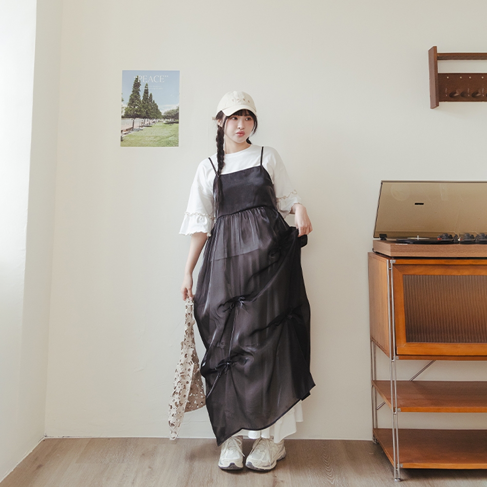 QUEENSHOP_ S 女裝 短袖 微光澤透紗兩件式細肩長洋裝 兩色售 現+預 【01087113】黑|杏QUEENSHOP
