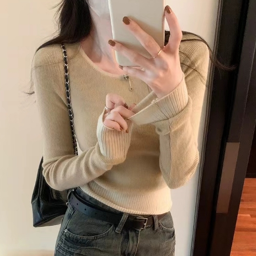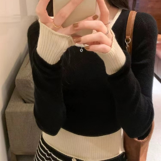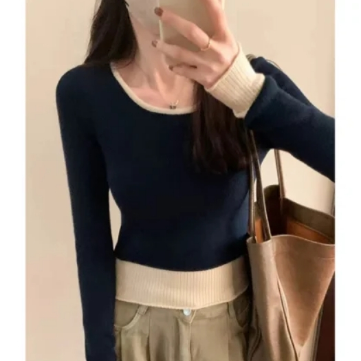 【ohi】早秋新款高級感 撞色圓領上衣 修身長袖內搭毛衣 休閒百搭 上衣 針織衫 秋款女裝 GWH8122黑色,F均碼(40-55KG可穿)|灰色,F均碼(40-55KG可穿)|藍色,F均碼(40-55KG可穿)|黃色,F均碼(40-55KG可穿)OHI衣著